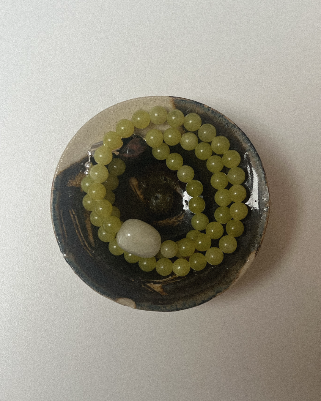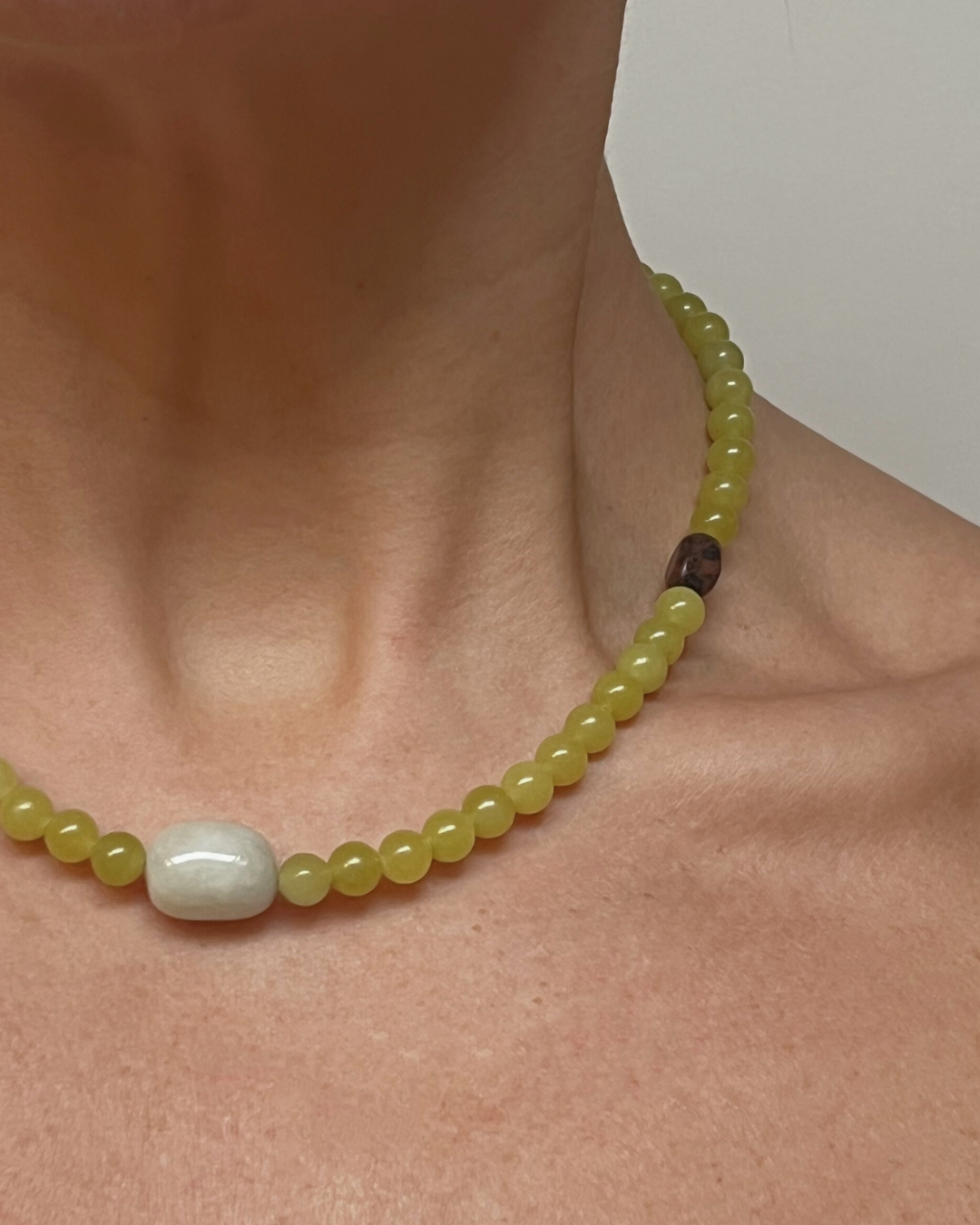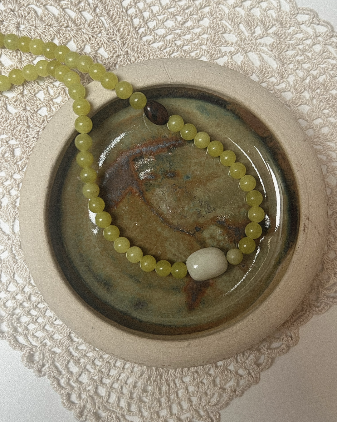 Olive jade brings harmony and balance, known to promote calm focus and a sense of grounded renewal. Beryl adds warmth and clarity, while mahogany obsidian offers gentle protection and strength. Together, they create a piece that feels steady, nurturing, and quietly radiant.