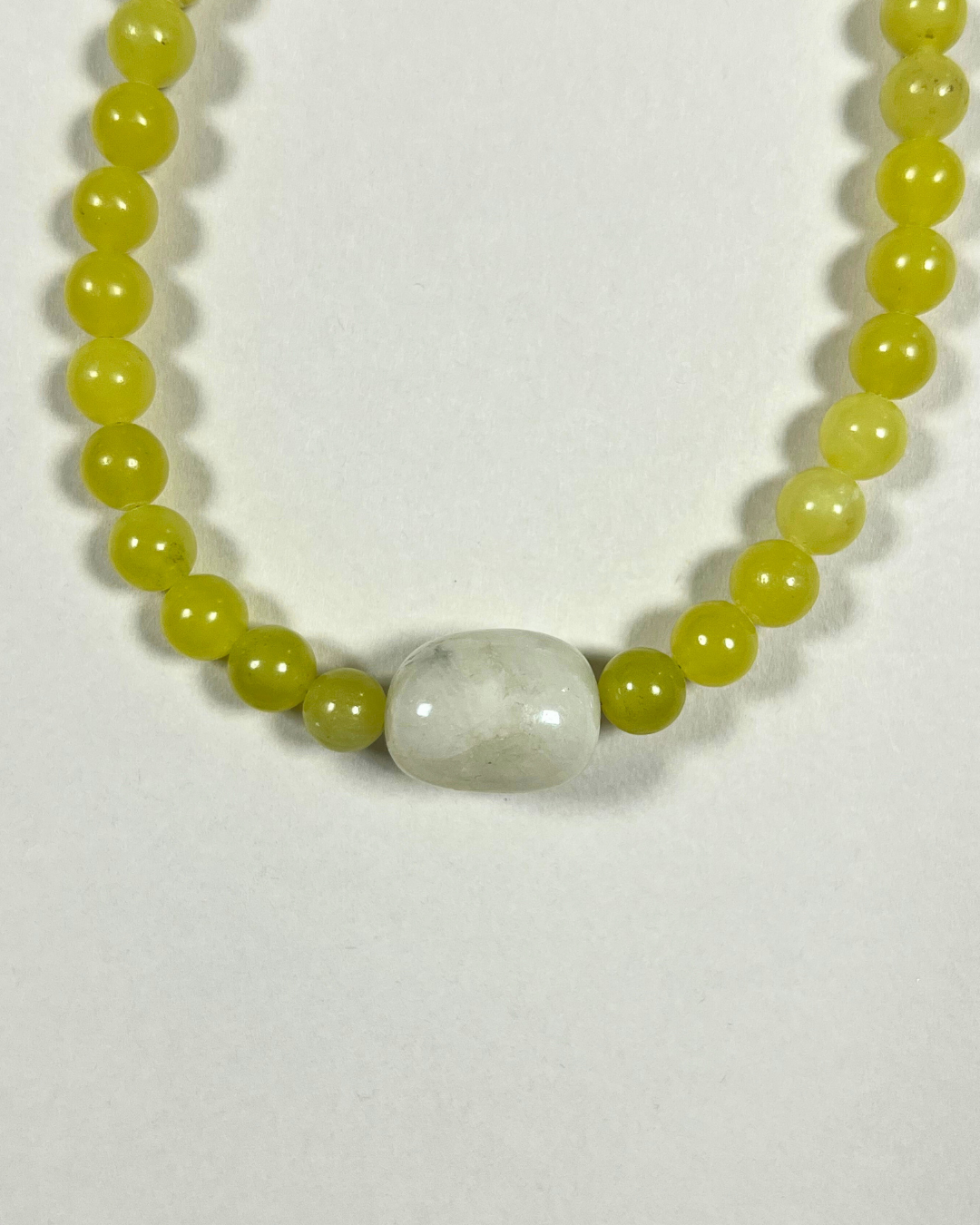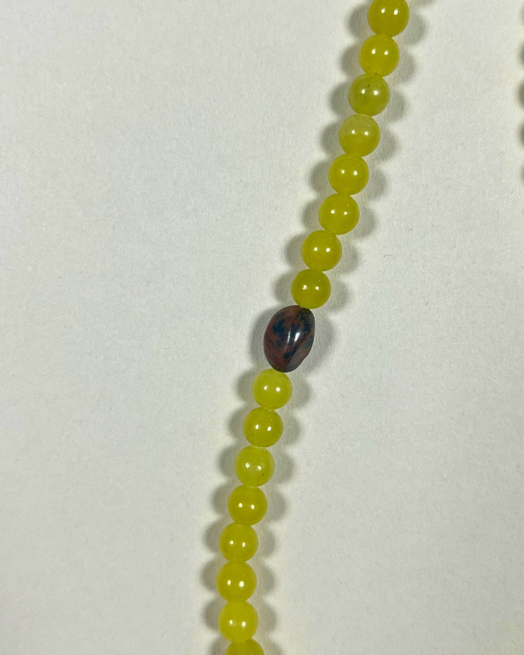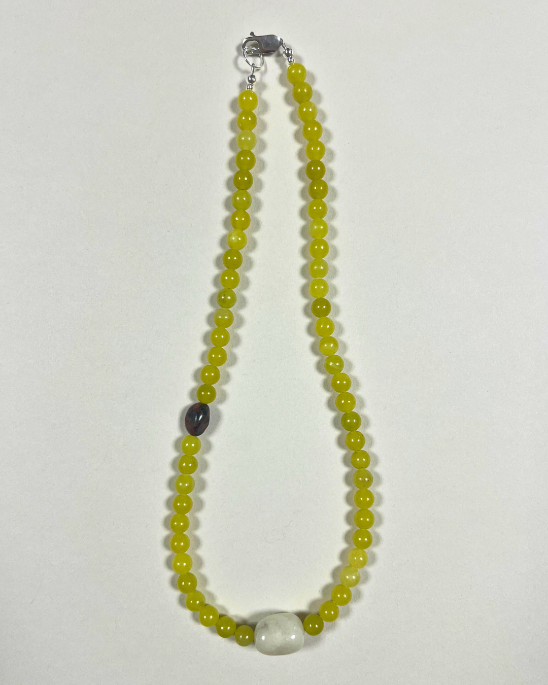A one-of-a-kind necklace featuring 6mm olive jade beads with a central soft yellow beryl and an accent mahogany obsidian bead. All findings and clasp are sterling silver.