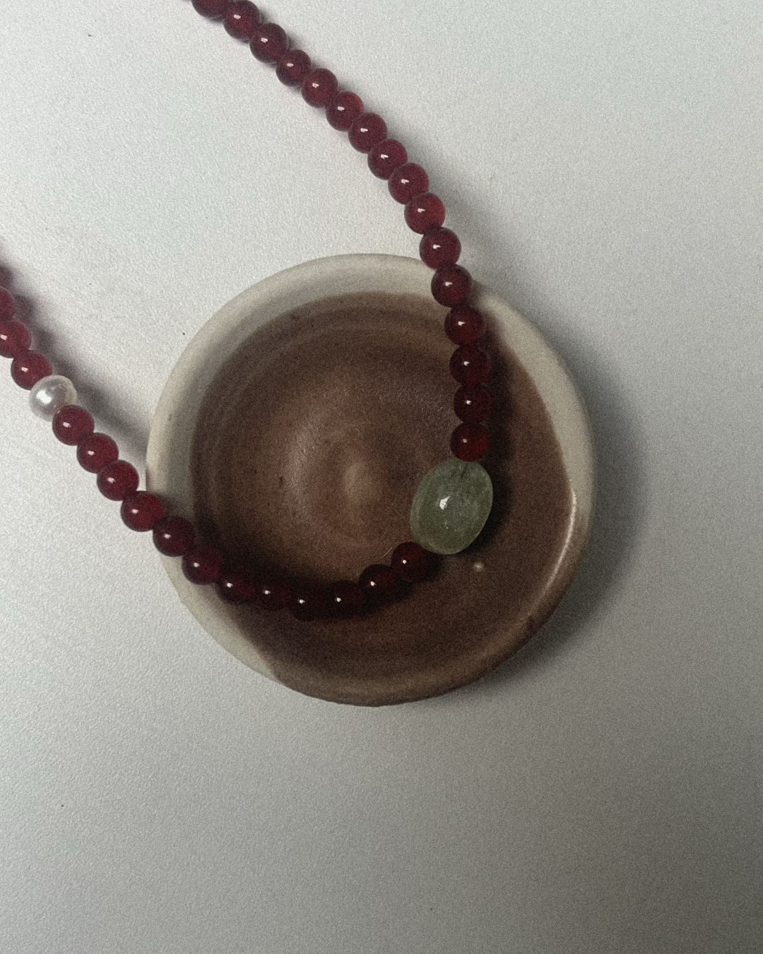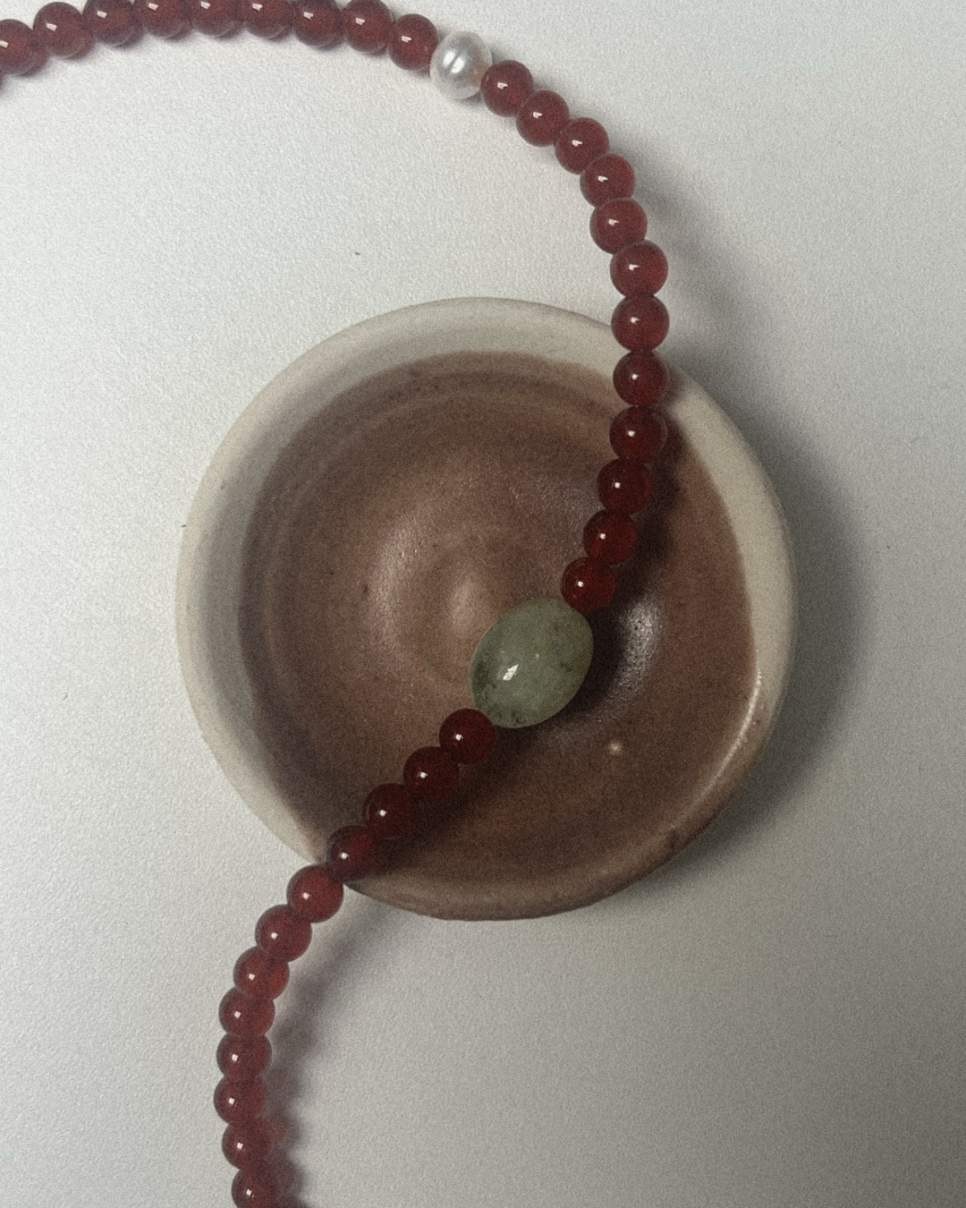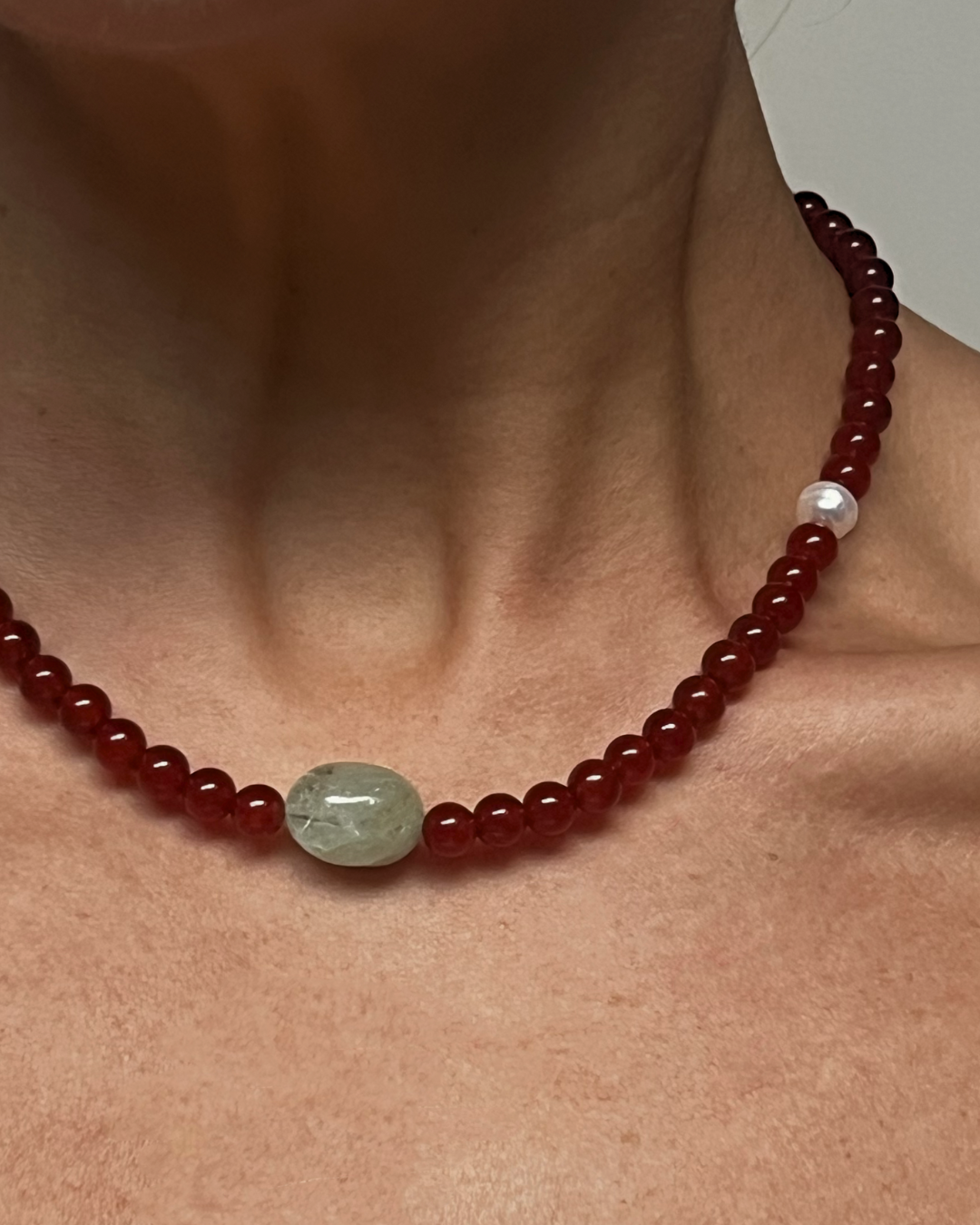 Carnelian is known for its warm, steady vitality, offering gentle motivation and a soft sense of movement through its amber-red tone. Blue-green beryl brings calm clarity and balance, often connected with soothing communication and a quiet, cooling presence. The freshwater pearl adds a smooth, reflective note, bringing the palette together with subtle ease. Together, they create a piece that feels warm, balanced, and softly uplifting.