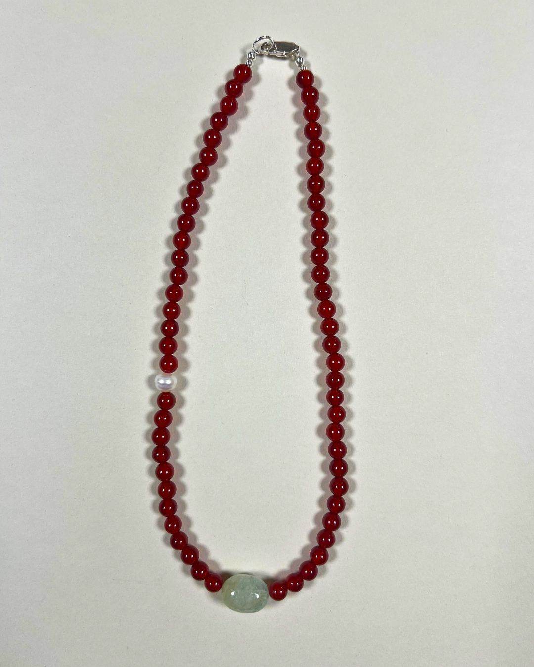 A one-of-a-kind necklace featuring 6 mm carnelian beads with a central blue-green beryl and an accent freshwater pearl. All findings and clasp are sterling silver.