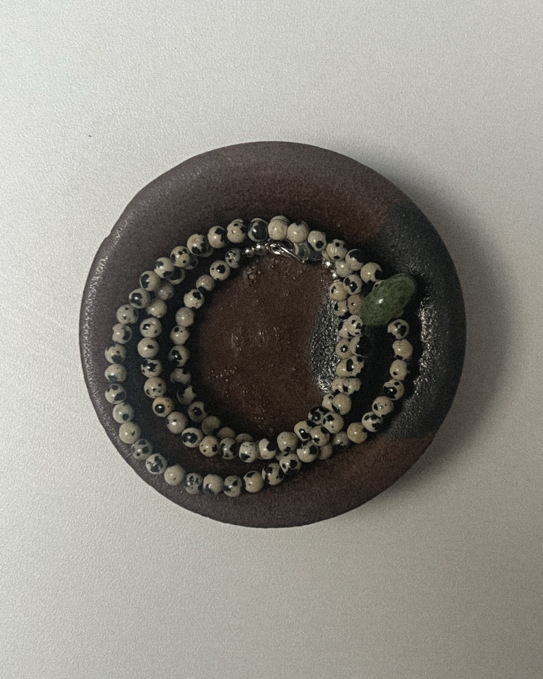 Dalmatian jasper is known for its grounding, stabilising nature, offering steady, playful balance through its natural speckled pattern. Ocean jasper brings soothing, rhythmic energy, often associated with emotional steadiness, renewal, and a quiet sense of flow. The sliding bead introduces gentle movement, allowing the piece to shift softly with the wearer. Together, they create a necklace that feels grounded, calming, and subtly restorative.