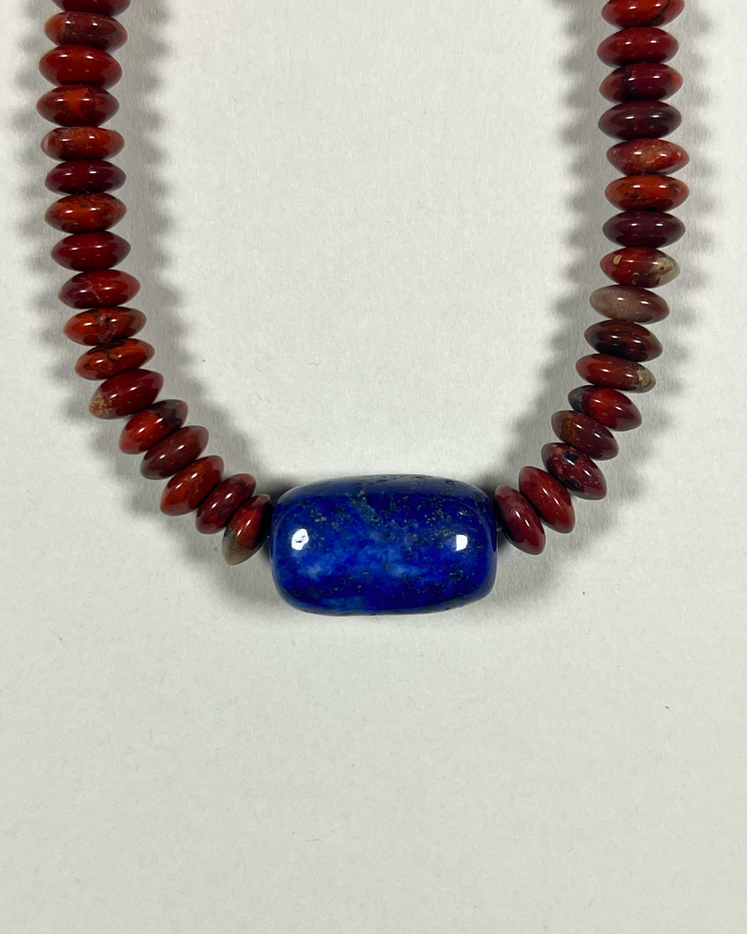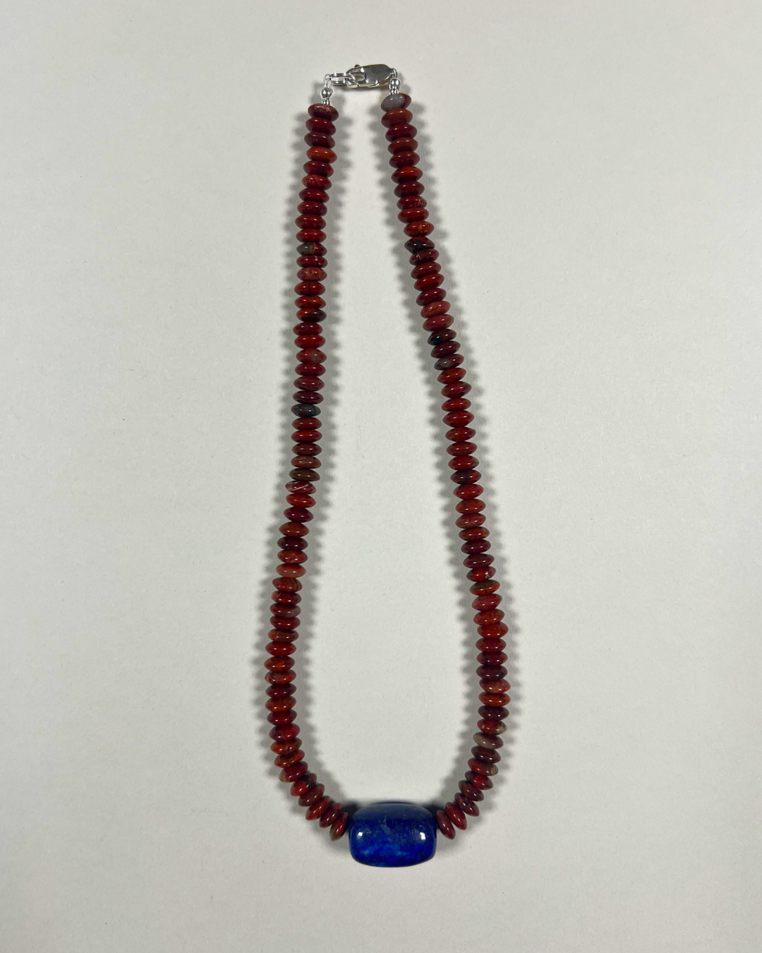 A one-of-a-kind necklace featuring brecciated jasper rondelles in deep red and earthy brown tones with a central vibrant lapis lazuli. All findings and clasp are sterling silver.
