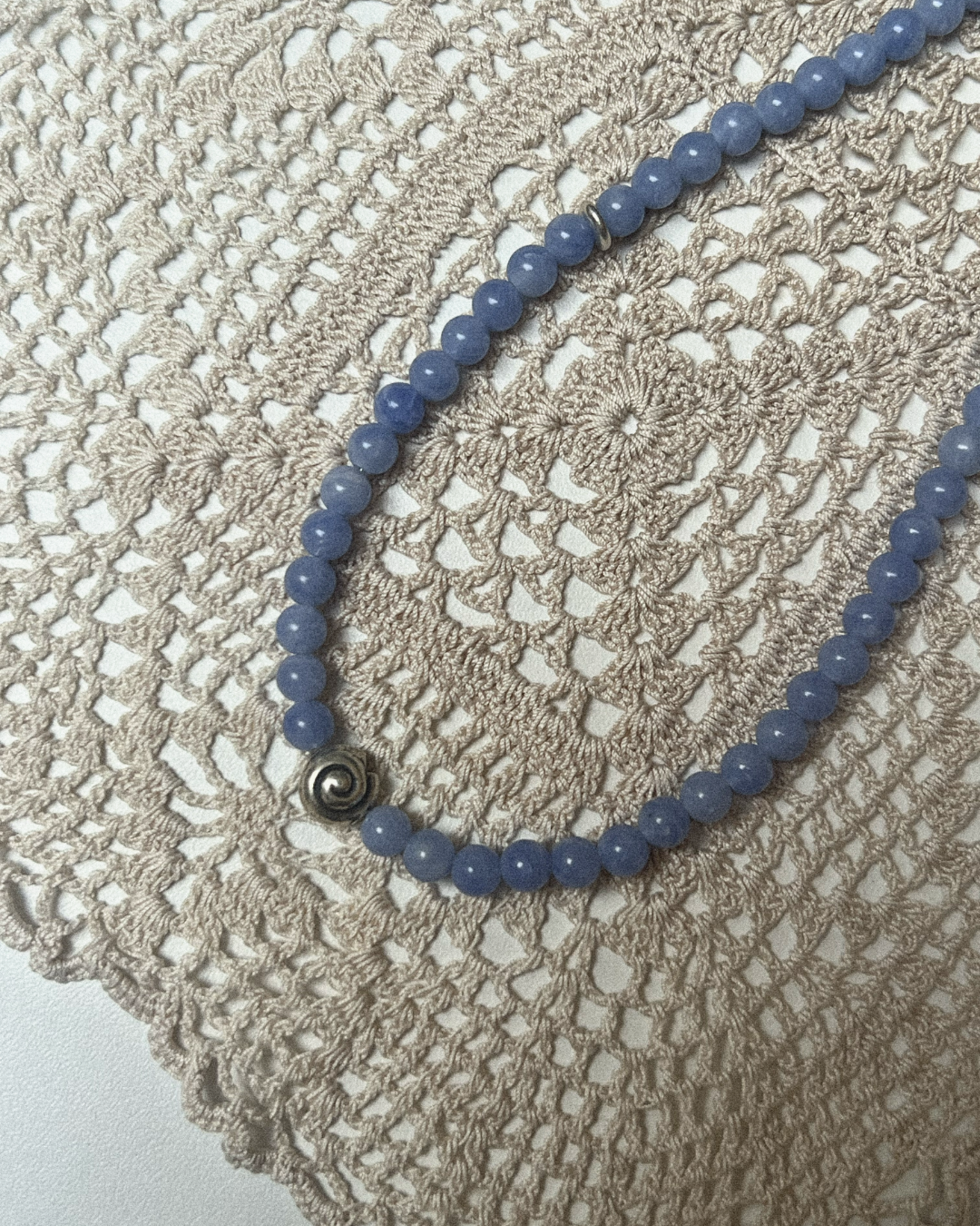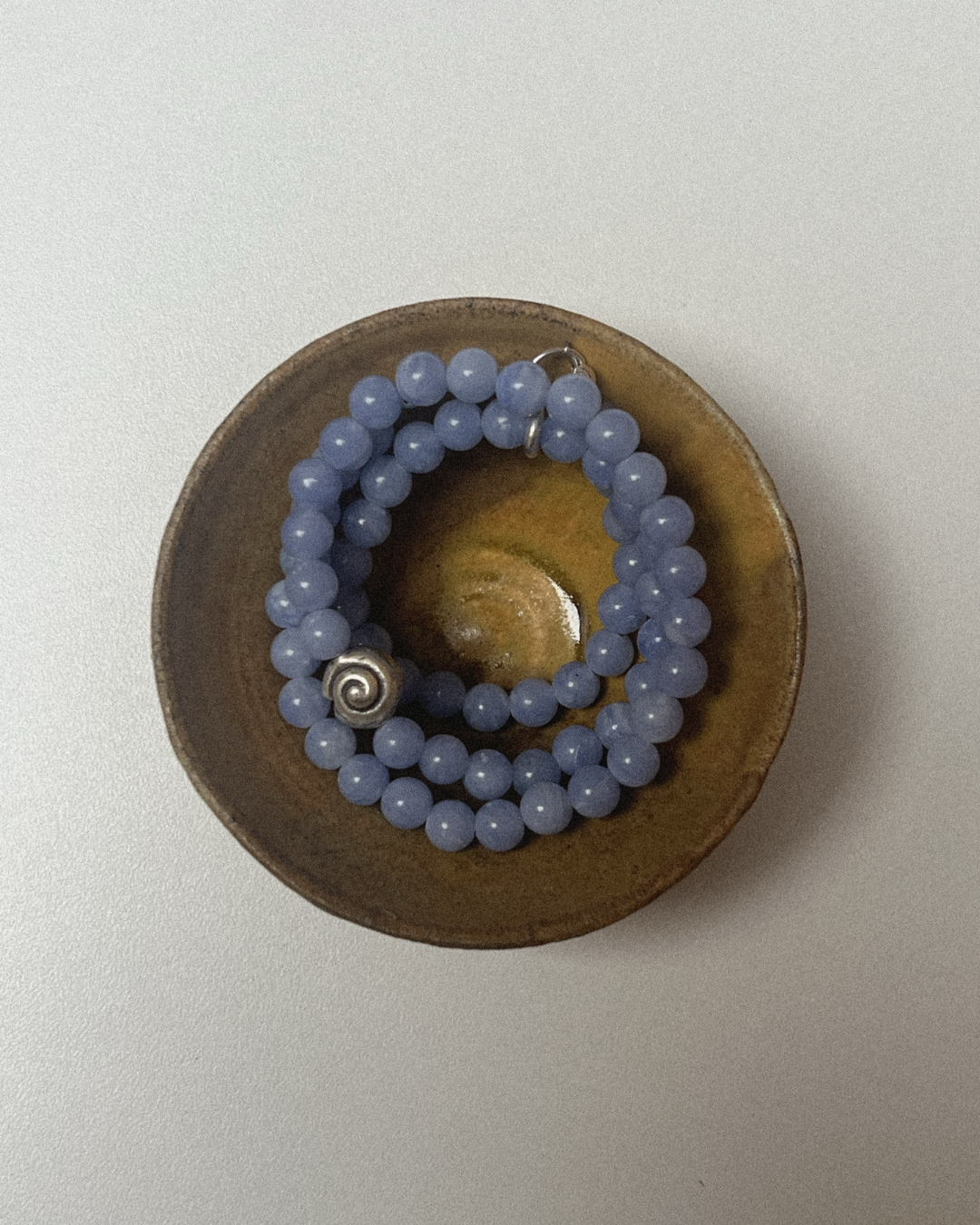 Blue lace agate is soothing and gentle, known to calm the mind and support clear, compassionate communication. The fine silver spiral symbolises flow and renewal, adding movement to the soft blue tones of the stone. Together, they create a piece that feels serene, balanced, and quietly expressive.