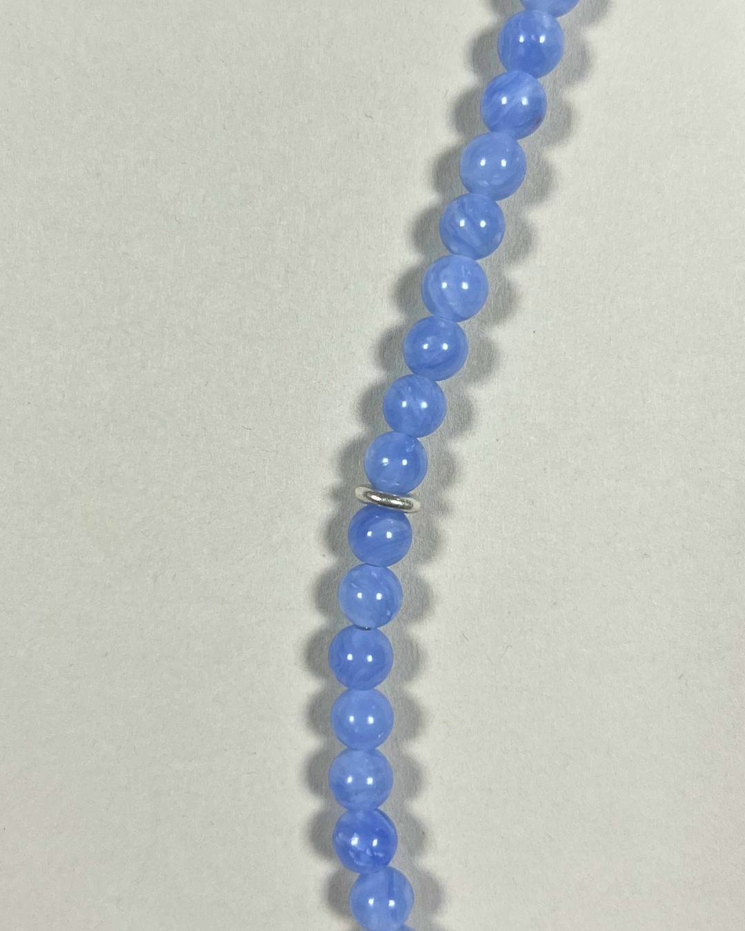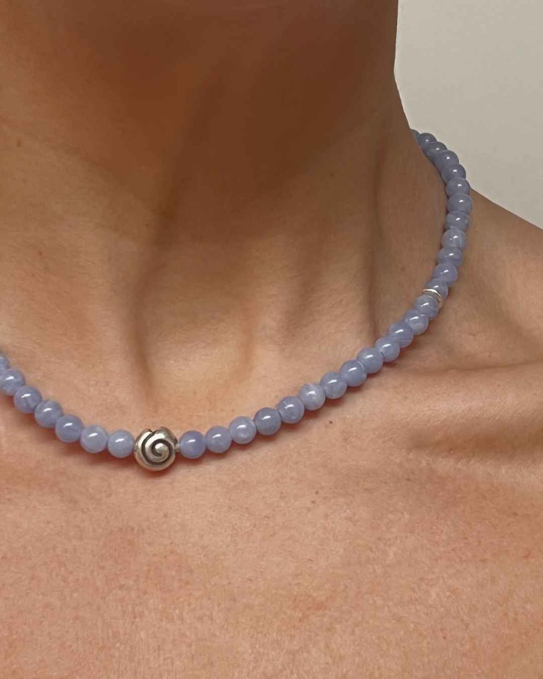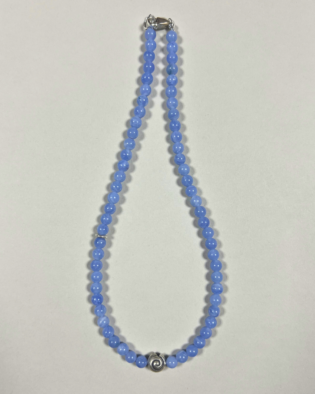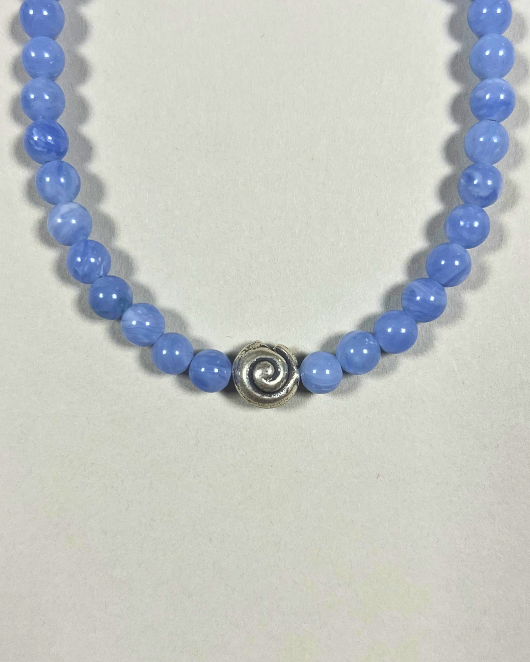 A one-of-a-kind necklace featuring 6mm blue lace agate beads with a central fine silver spiral and an accent fine silver stud bead. All findings and clasp are sterling silver.