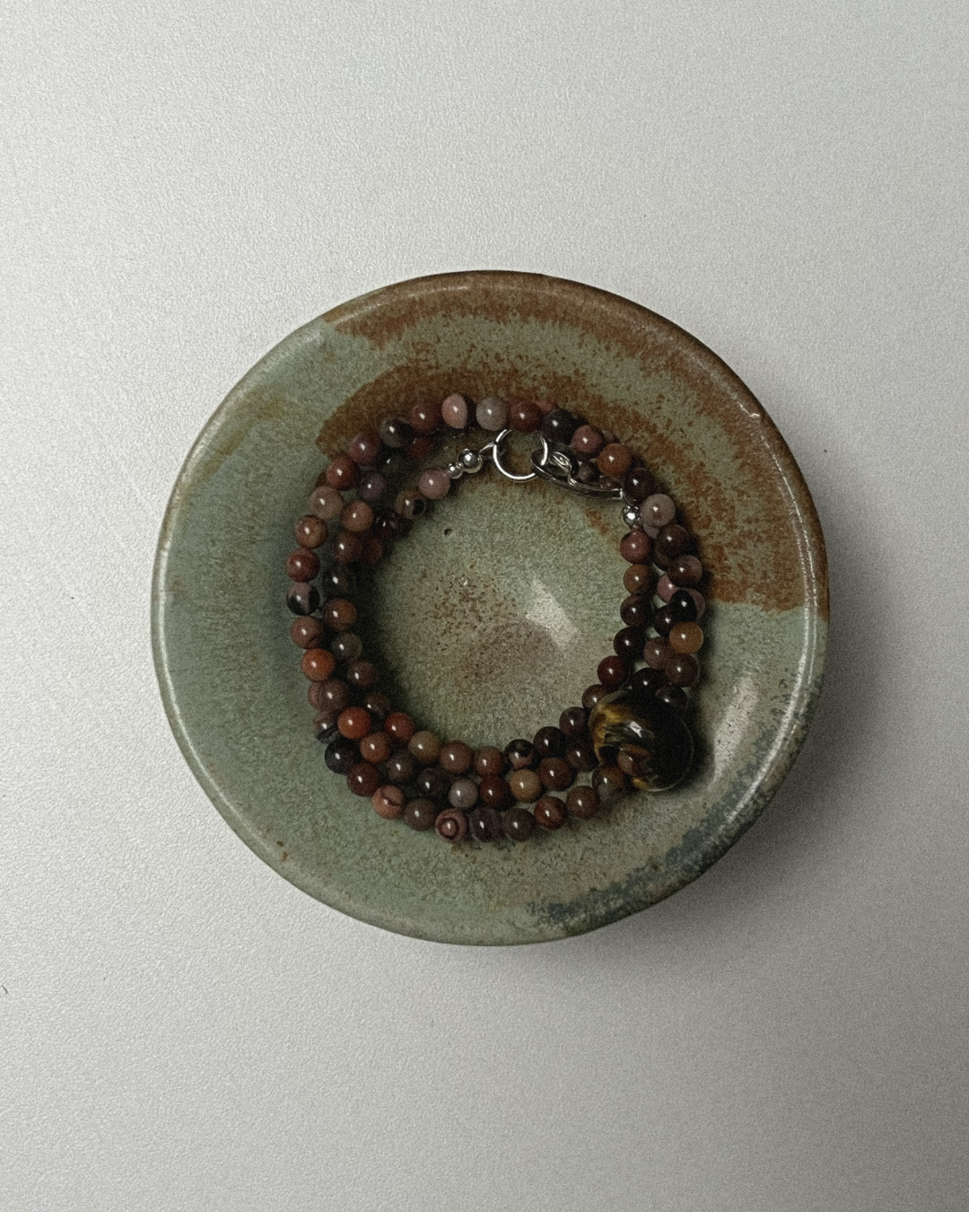 River stone brings a sense of calm and natural balance, its smooth, neutral tones offering quiet grounding and ease. Tiger eye adds focus and steady confidence, often associated with protection, clarity, and gentle determination. The sliding bead introduces subtle movement, allowing the piece to shift softly with the wearer. Together, they create a necklace that feels calm, grounded, and quietly assured.