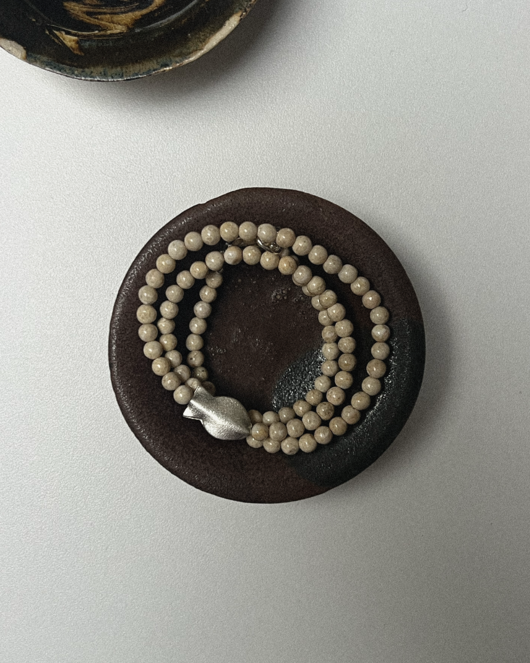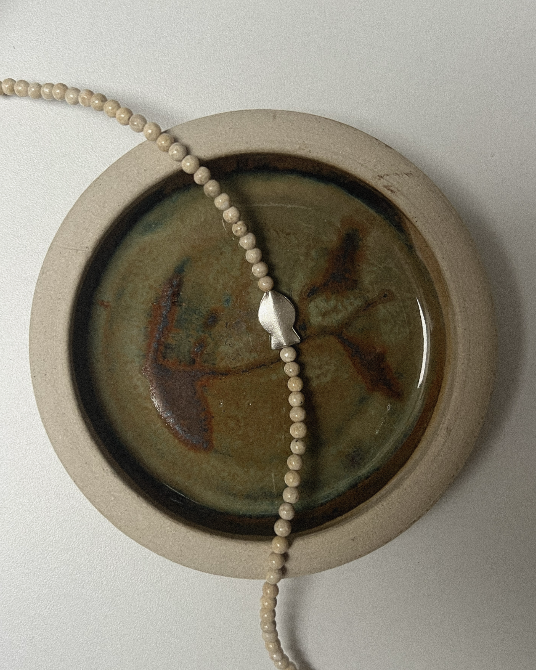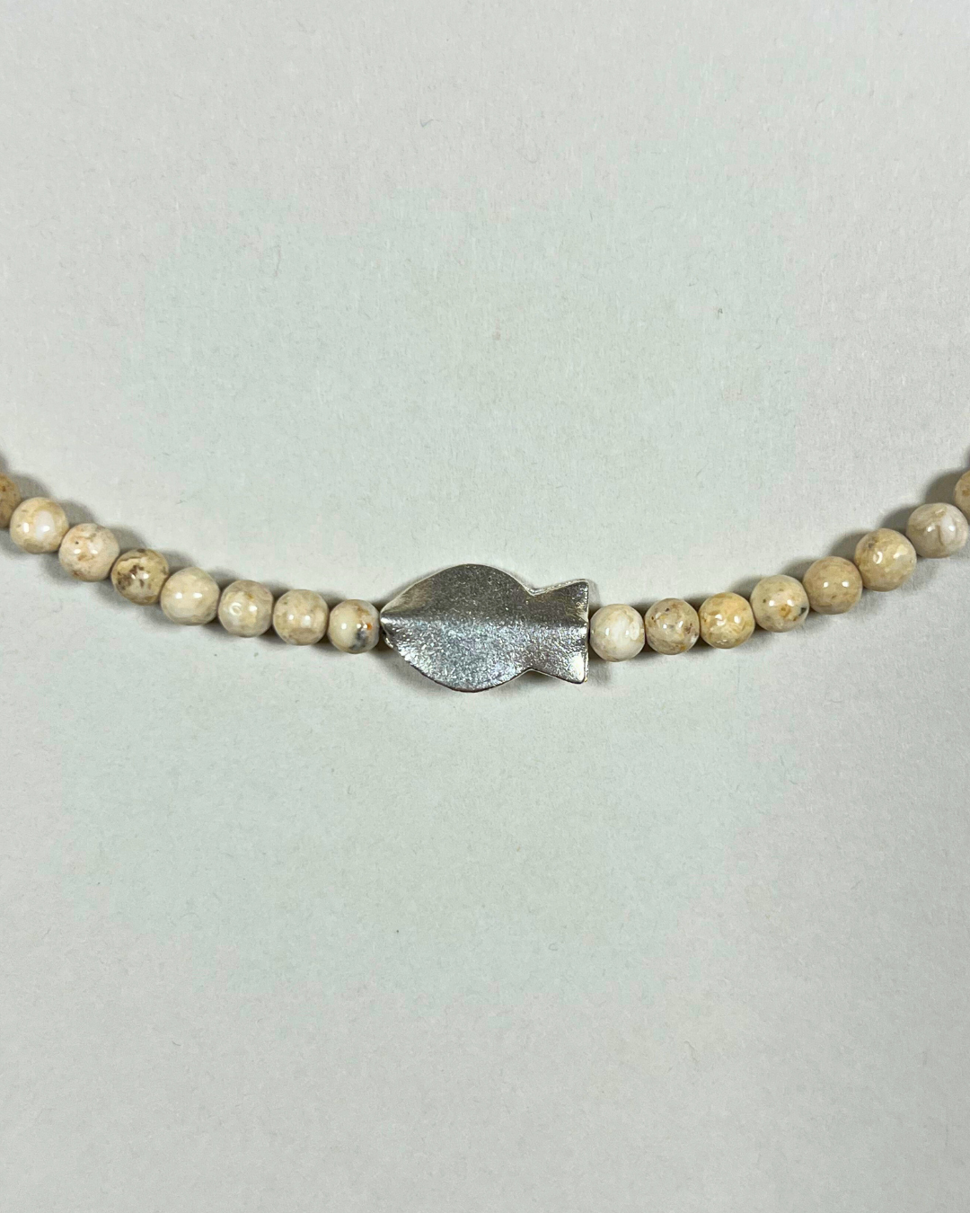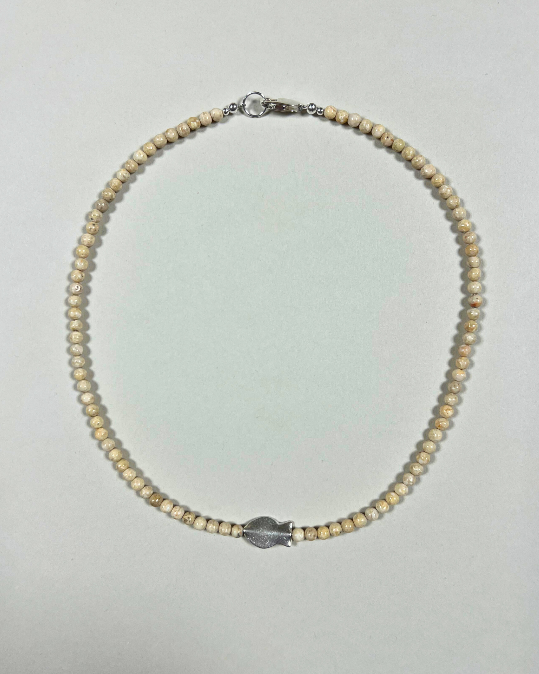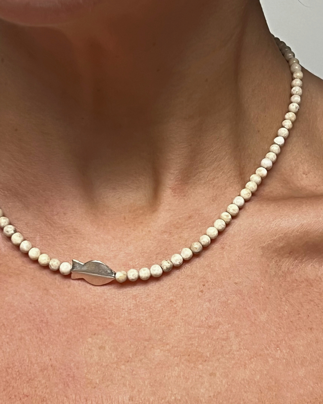 A one-of-a-kind necklace featuring 4mm riverstone beads with a central fine silver fish. All findings and clasp are sterling silver.