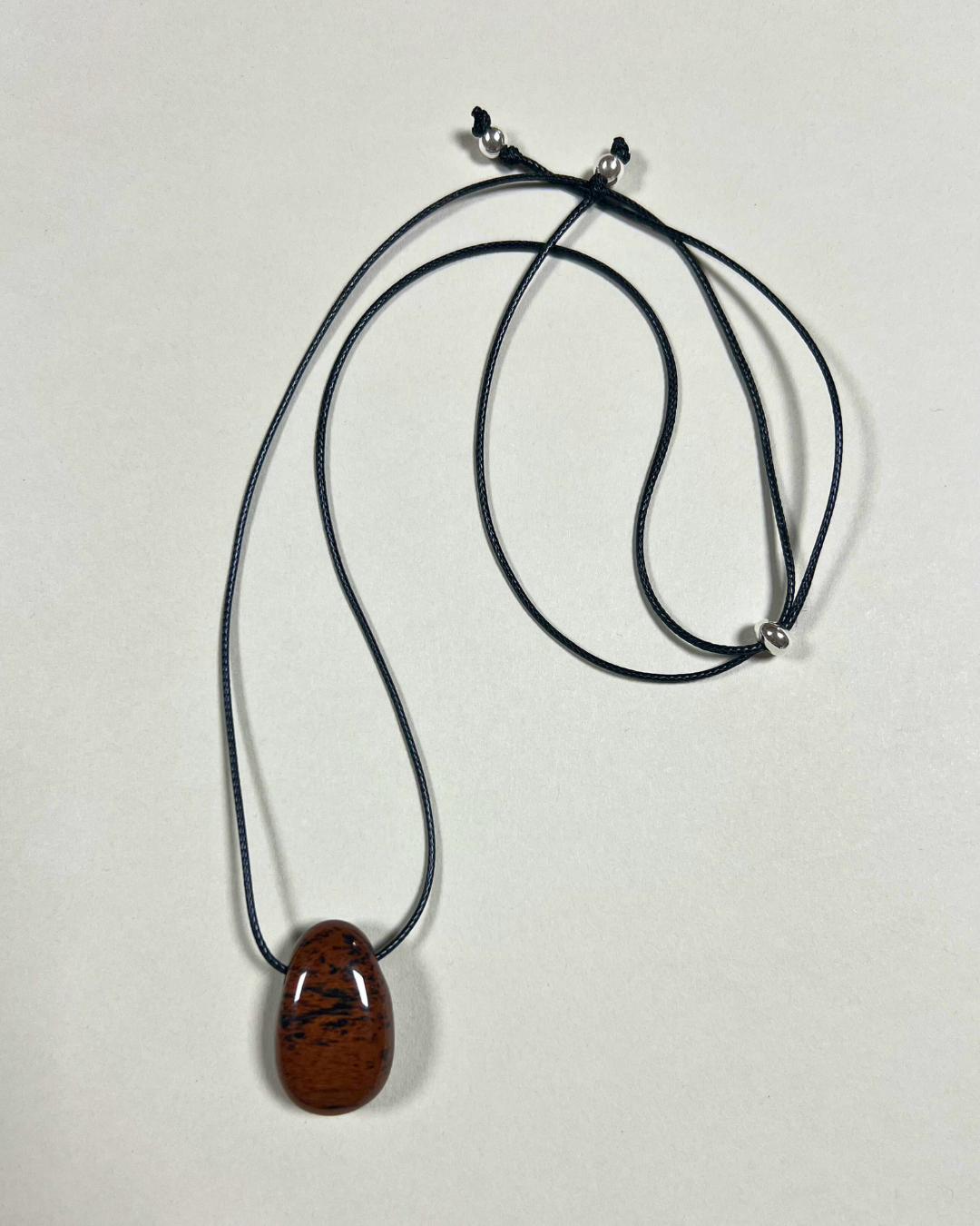 A statement necklace featuring a smooth mahogany obsidian Forma pendant, suspended from a black cord and secured with a sterling silver slider bead and accent beads. Designed for versatility, it can be worn at any length, adjusting effortlessly from long and elegant to a closer fit.