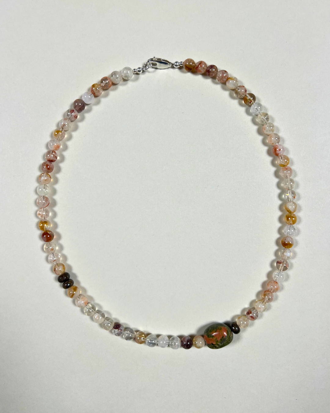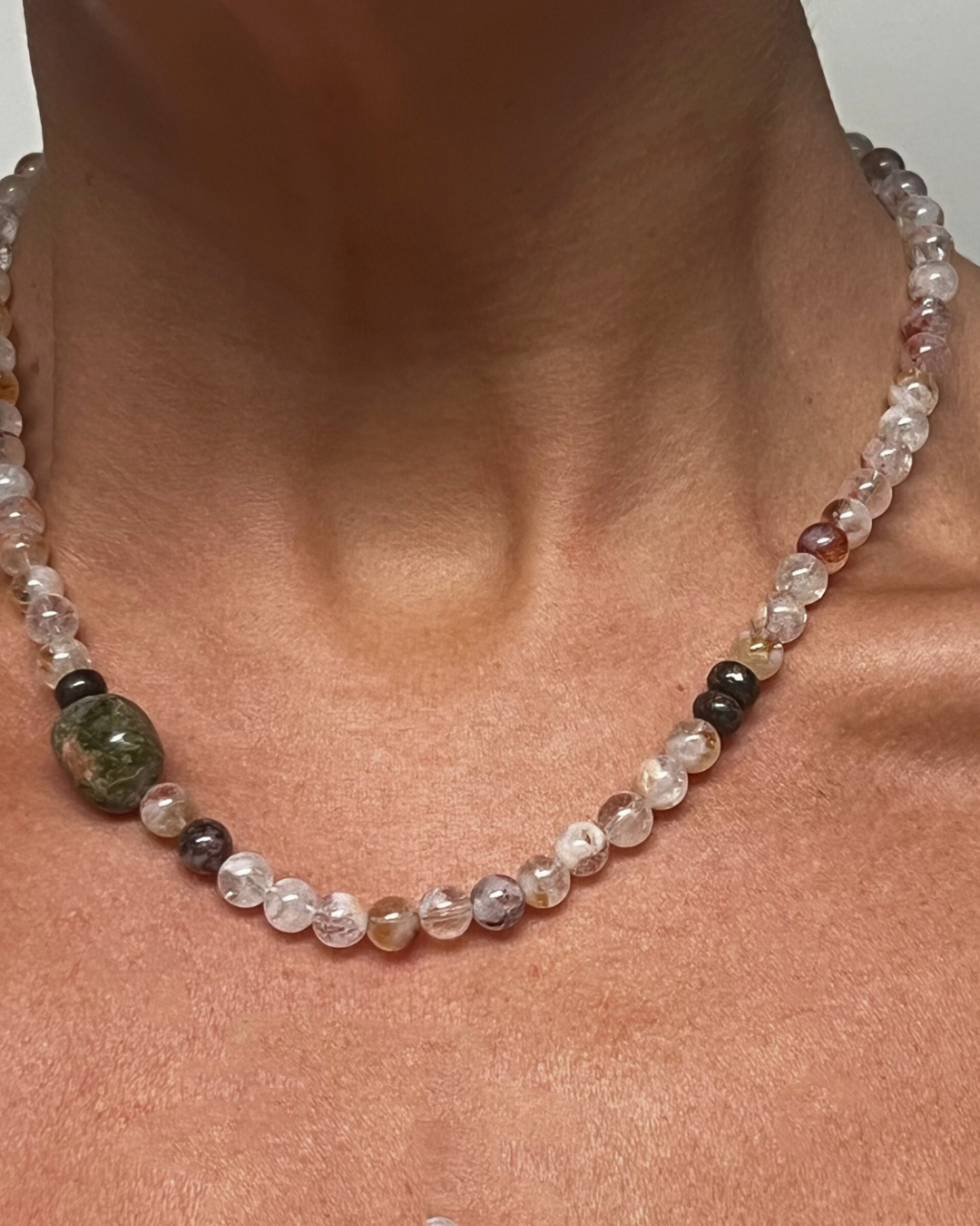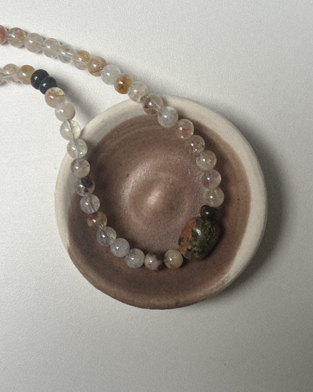 Quartz is associated with clarity, focus, and energetic amplification, while madeira quartz carries a warm, sunlit energy. Unakite is linked to balance and emotional healing, and bronzite offers stability and resilience. Together, they create a piece that feels radiant yet steady - grounding, balanced, and quietly uplifting.