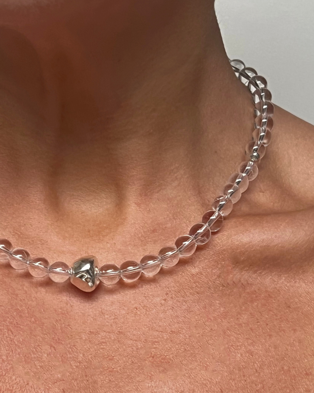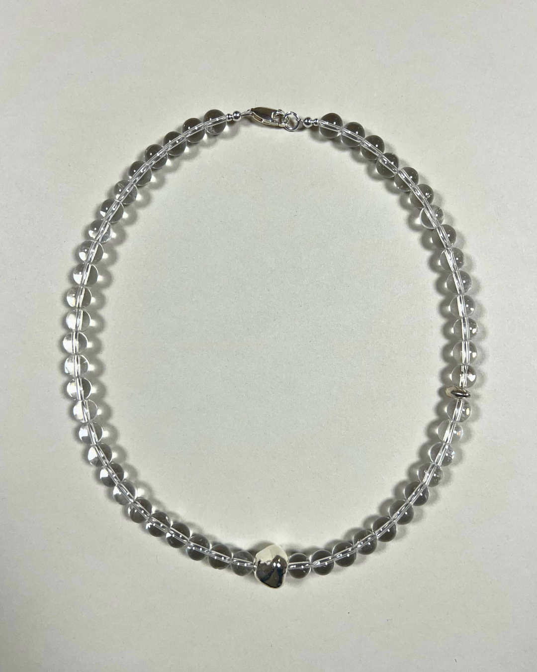 A one-of-a-kind necklace featuring 8mm clear quartz beads, hand-strung and finished with sterling silver findings and clasp. Accented with a large and smaller sterling silver nugget, adding texture and contrast to the luminous clarity of the quartz.