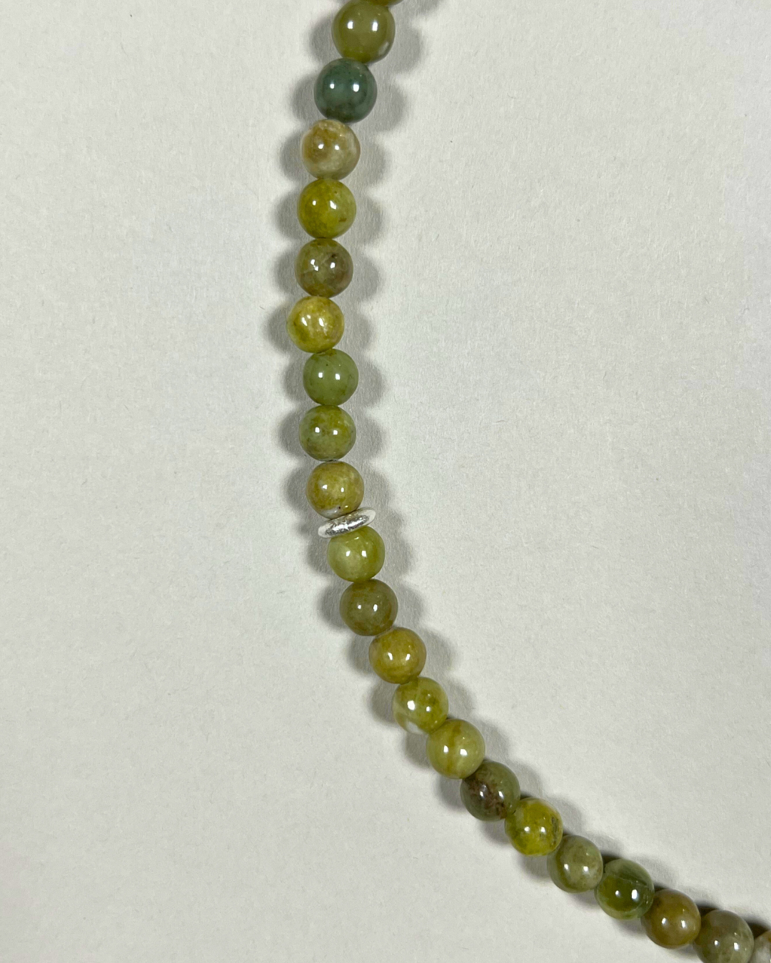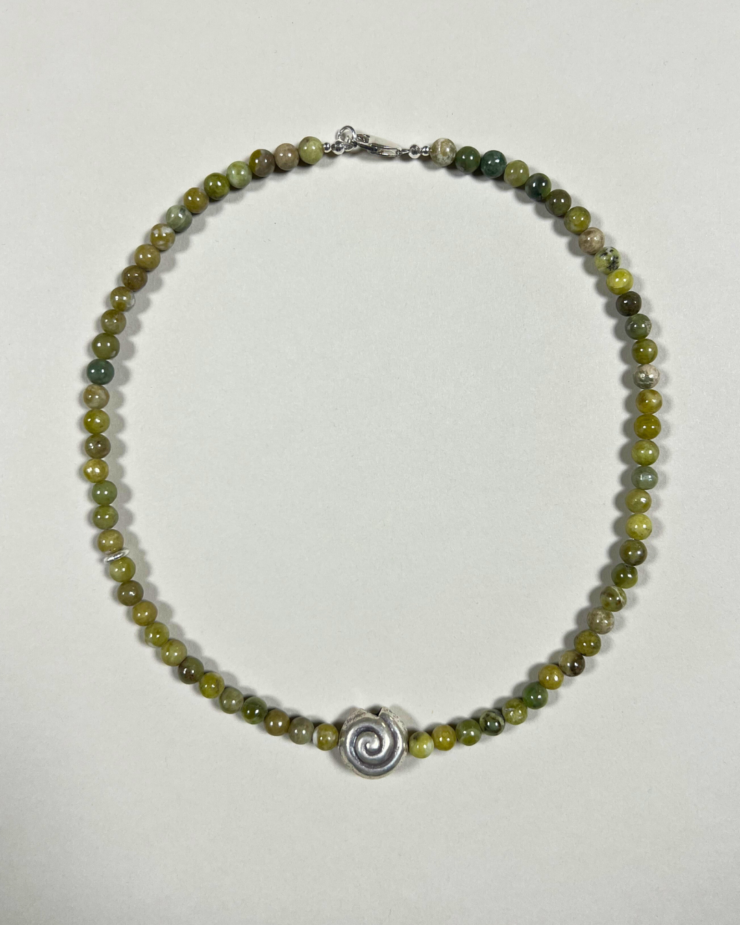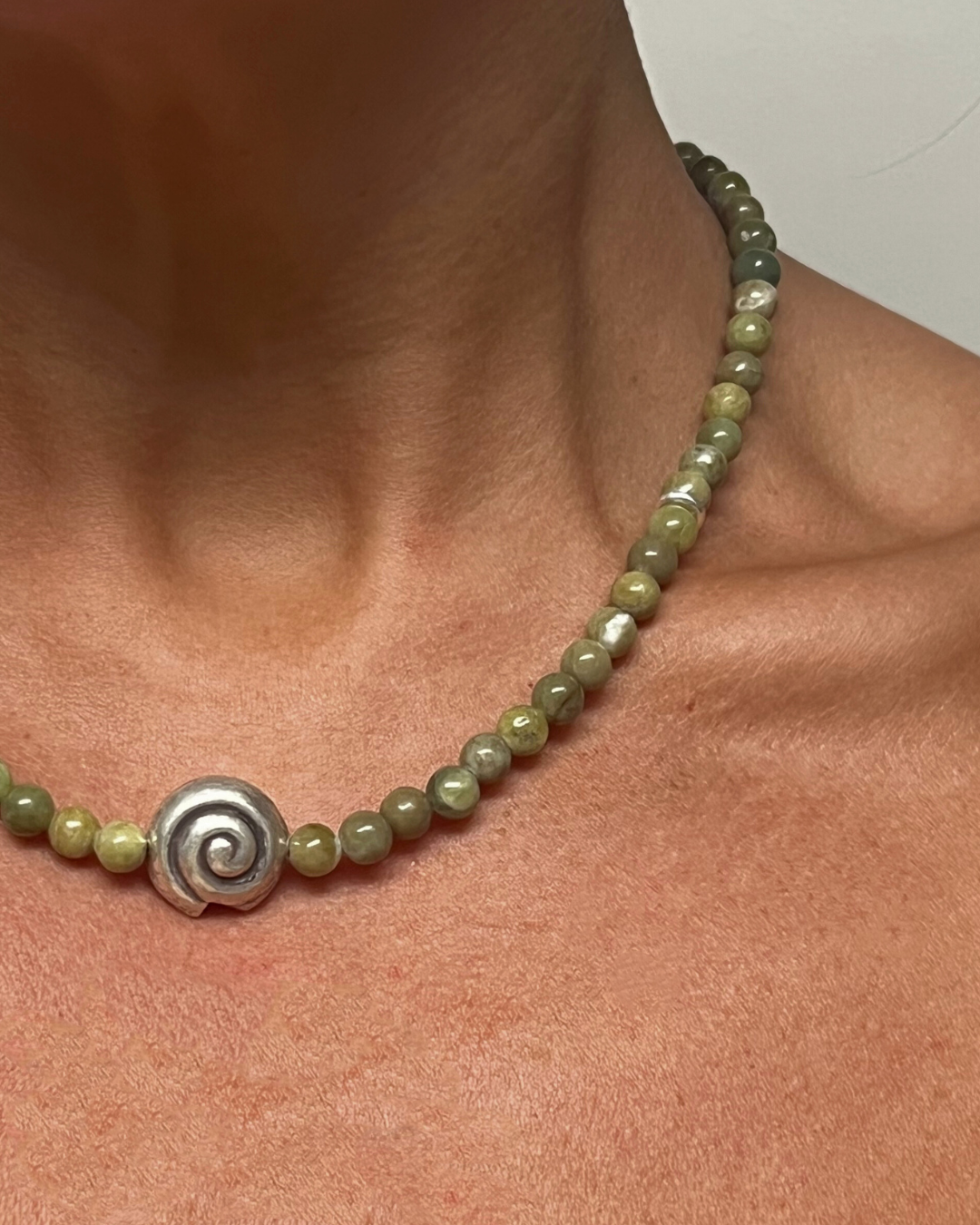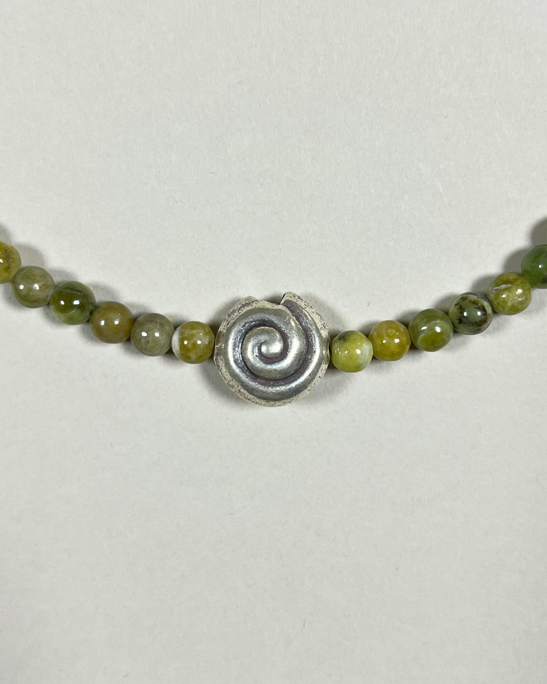 A one-of-a-kind necklace featuring 6mm green vesuvianite beads, hand-strung and finished with sterling silver findings and clasp. At its centre sits a large fine silver spiral, accented with a silver stud bead - a bold detail against the fresh green of the vesuvianite.