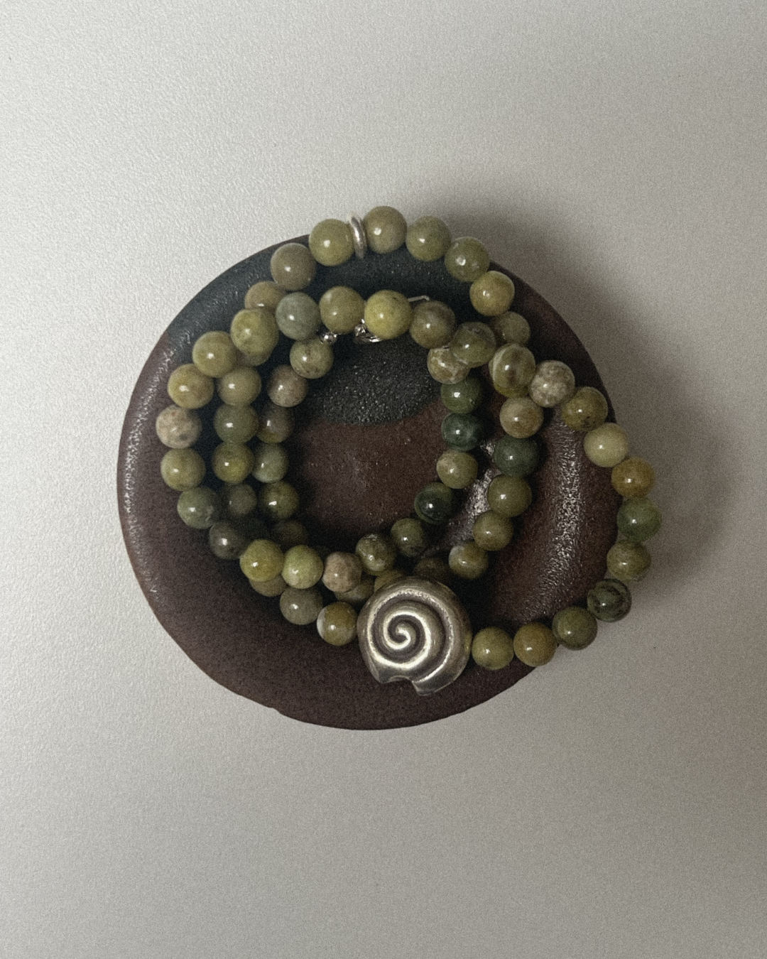Vesuvianite is associated with growth, creativity, and release, encouraging transformation and alignment with one’s true path. The silver spiral symbolises rhythm, flow, and quiet evolution, while silver itself brings balance and reflection. Together, they create a piece that feels vibrant yet steady - grounding, renewing, and quietly transformative.