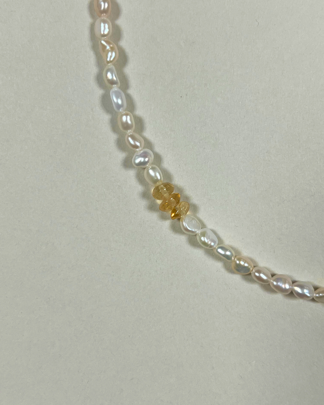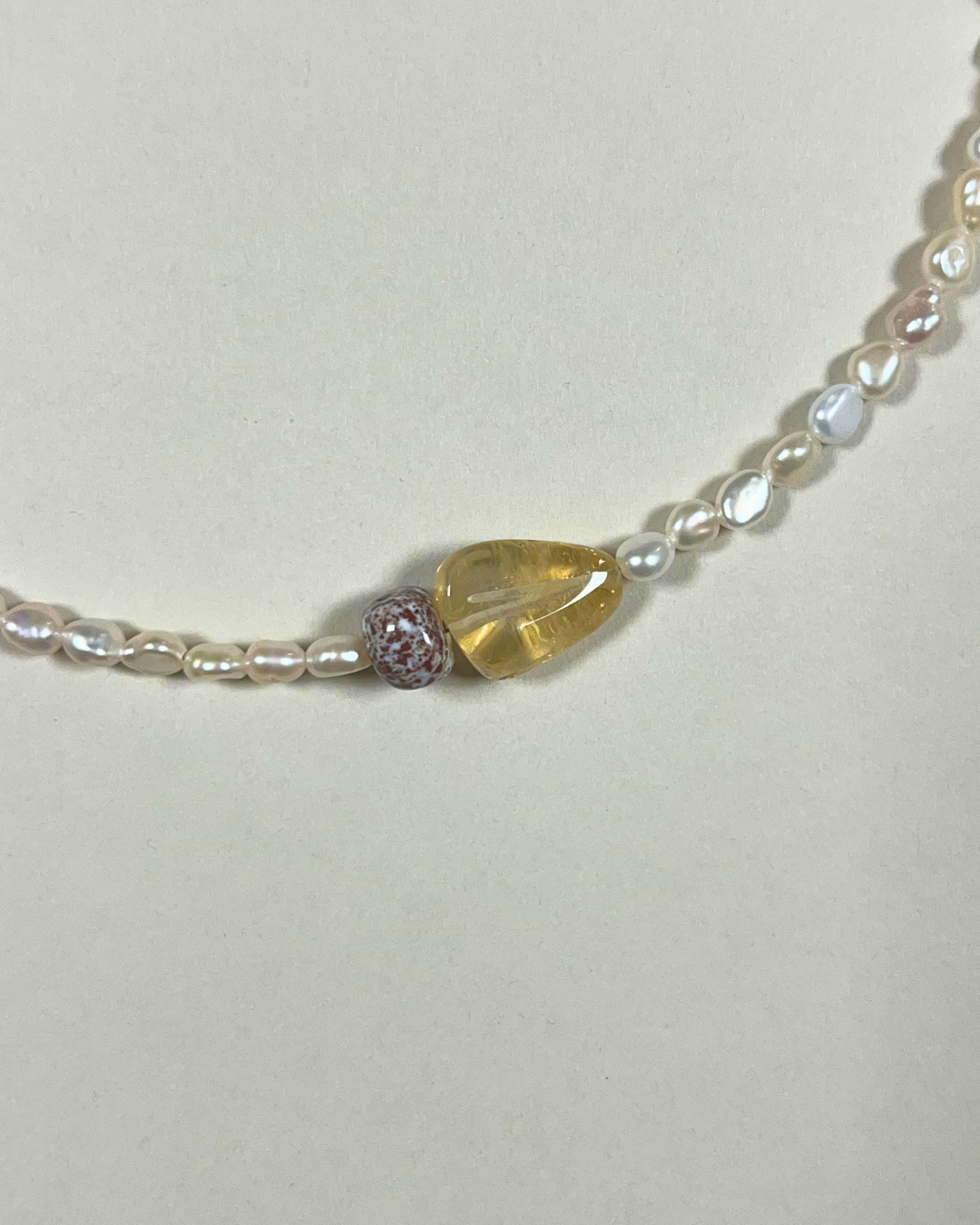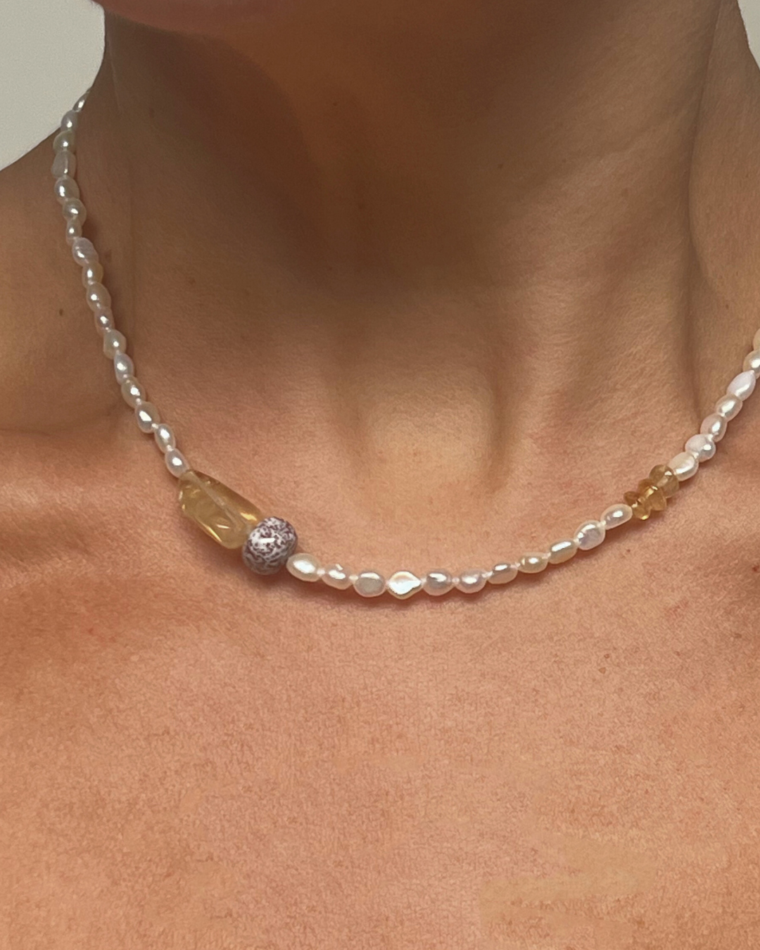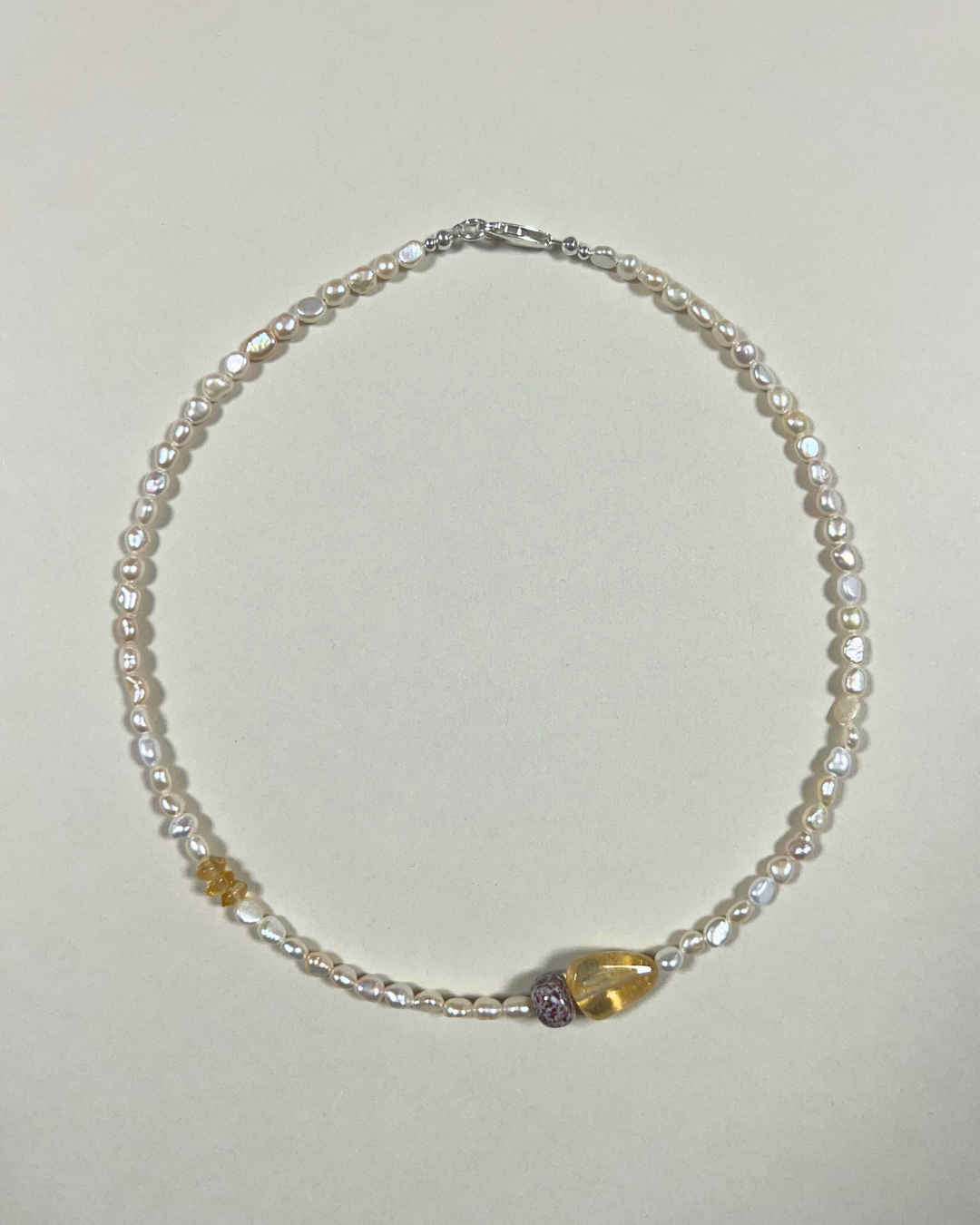 A one-of-a-kind necklace featuring petite freshwater pearls, hand-strung and finished with sterling silver findings and clasp. Accented with citrine, mottled lilac ocean jasper, and a small citrine stack, adding warmth, texture, and gentle colour to the luminous pearls.