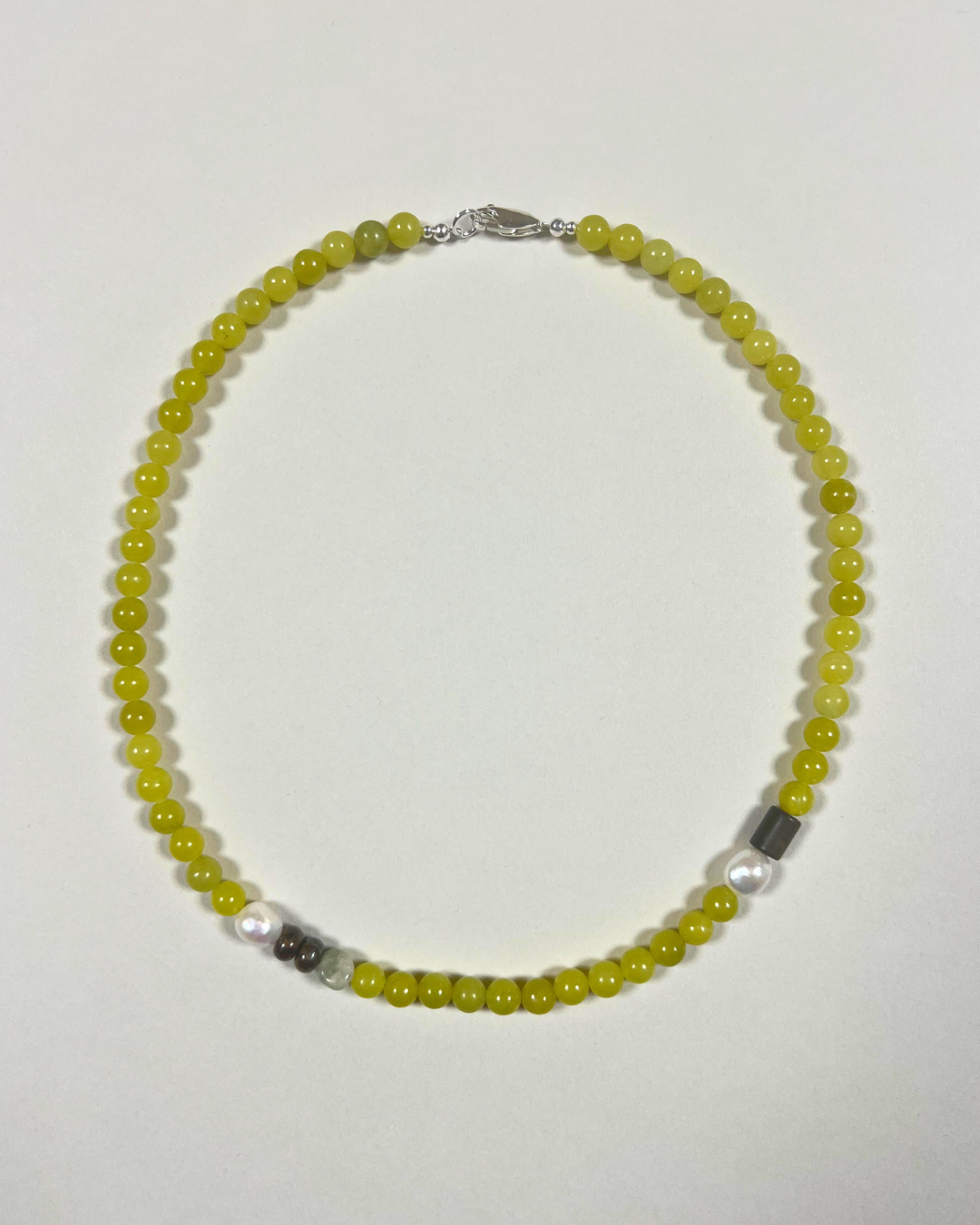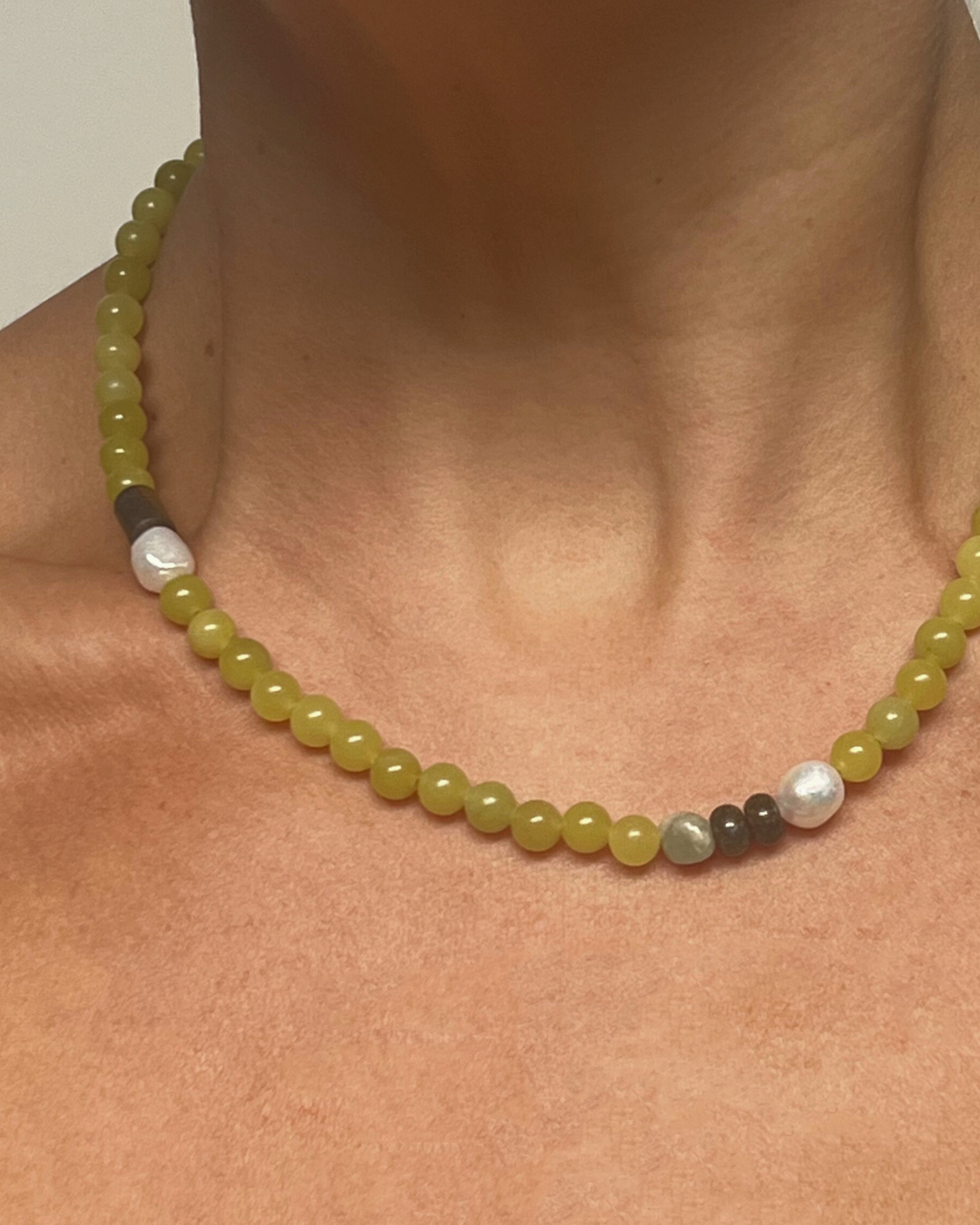 A one-of-a-kind necklace featuring vivid olive jade beads, hand-strung and finished with sterling silver findings and clasp. Accented with freshwater pearls, a stacked pair of bronzite rondelles, and a picasso jasper cylinder, adding texture, contrast, and grounding depth to the strand.