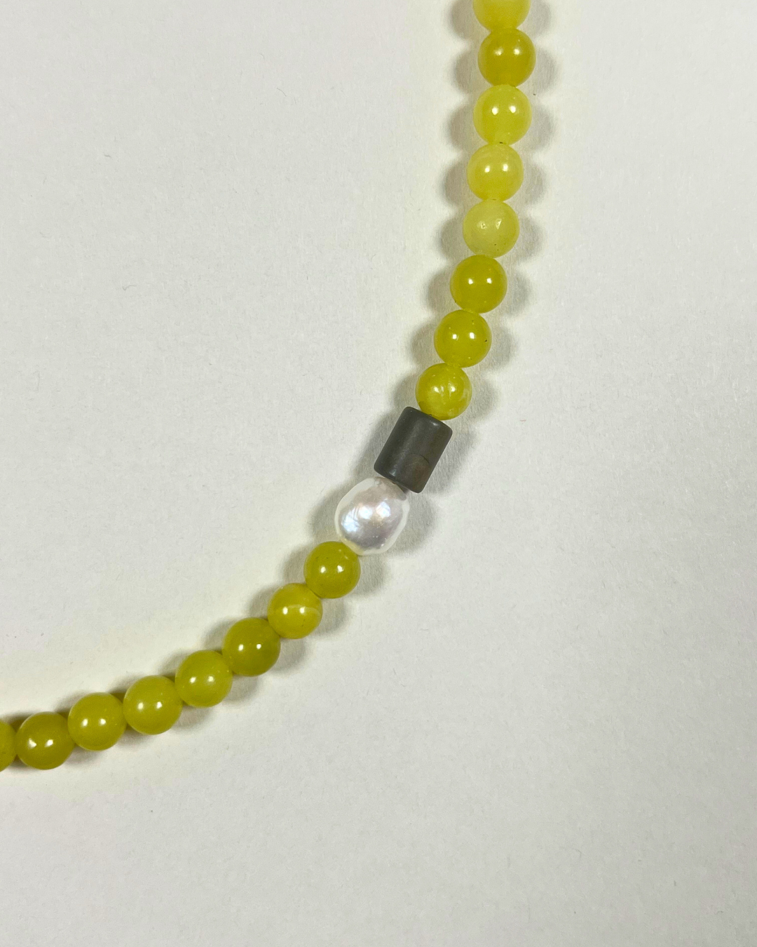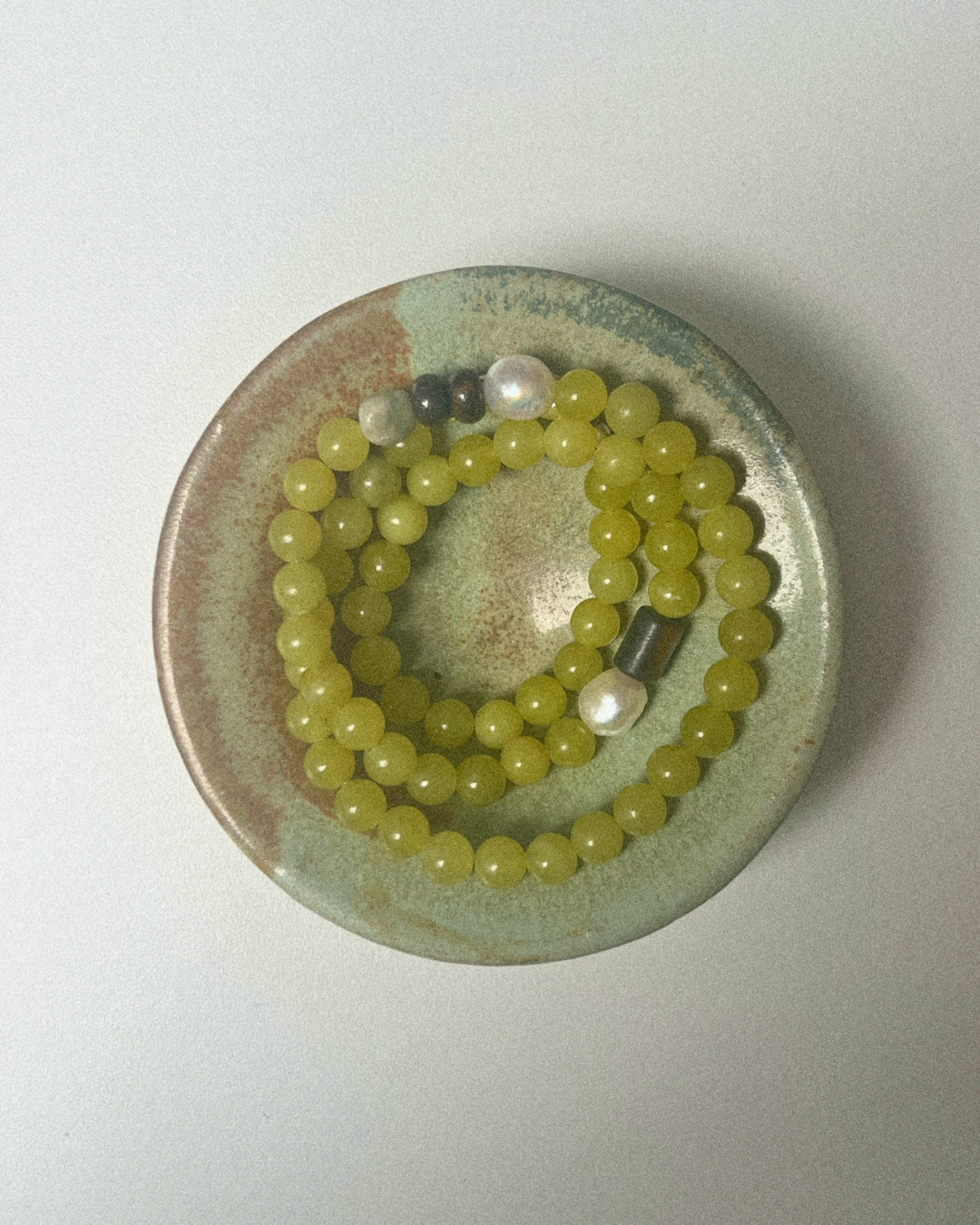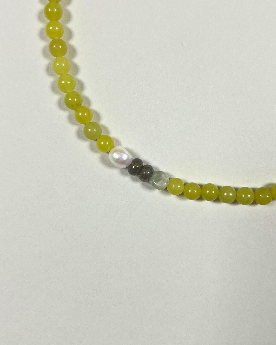 Olive jade is linked to harmony, protection, and emotional balance, offering a bright, uplifting energy. Pearl brings softness and reflection, bronzite adds stability and resilience, while picasso jasper is associated with creativity and balance. Together, they create a piece that feels vibrant yet steady — joyful, grounding, and quietly composed.