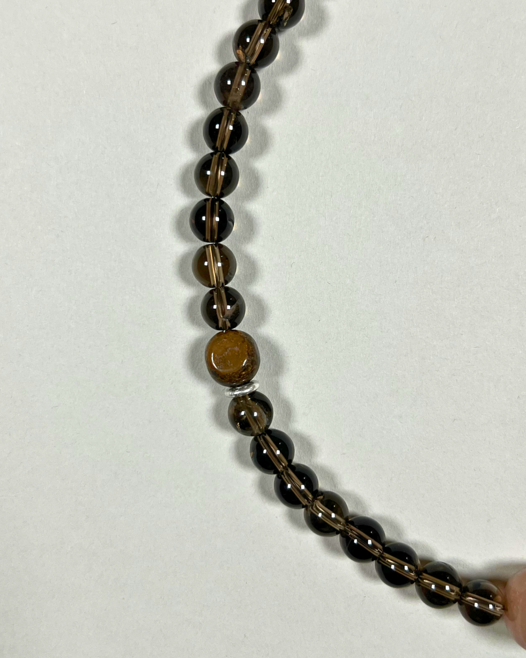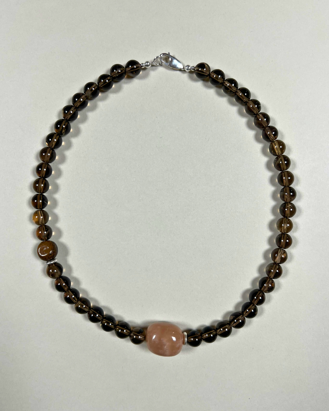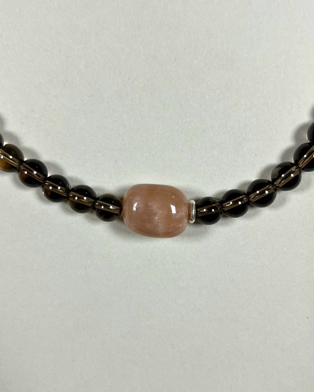 A one-of-a-kind necklace featuring 8mm smoky quartz beads, hand-strung and finished with sterling silver findings and clasp. At its centre sits a smooth, shimmery peach moonstone, accented with a bronzite nugget and two fine silver stud beads - a warm, grounding contrast to the depth of the quartz.