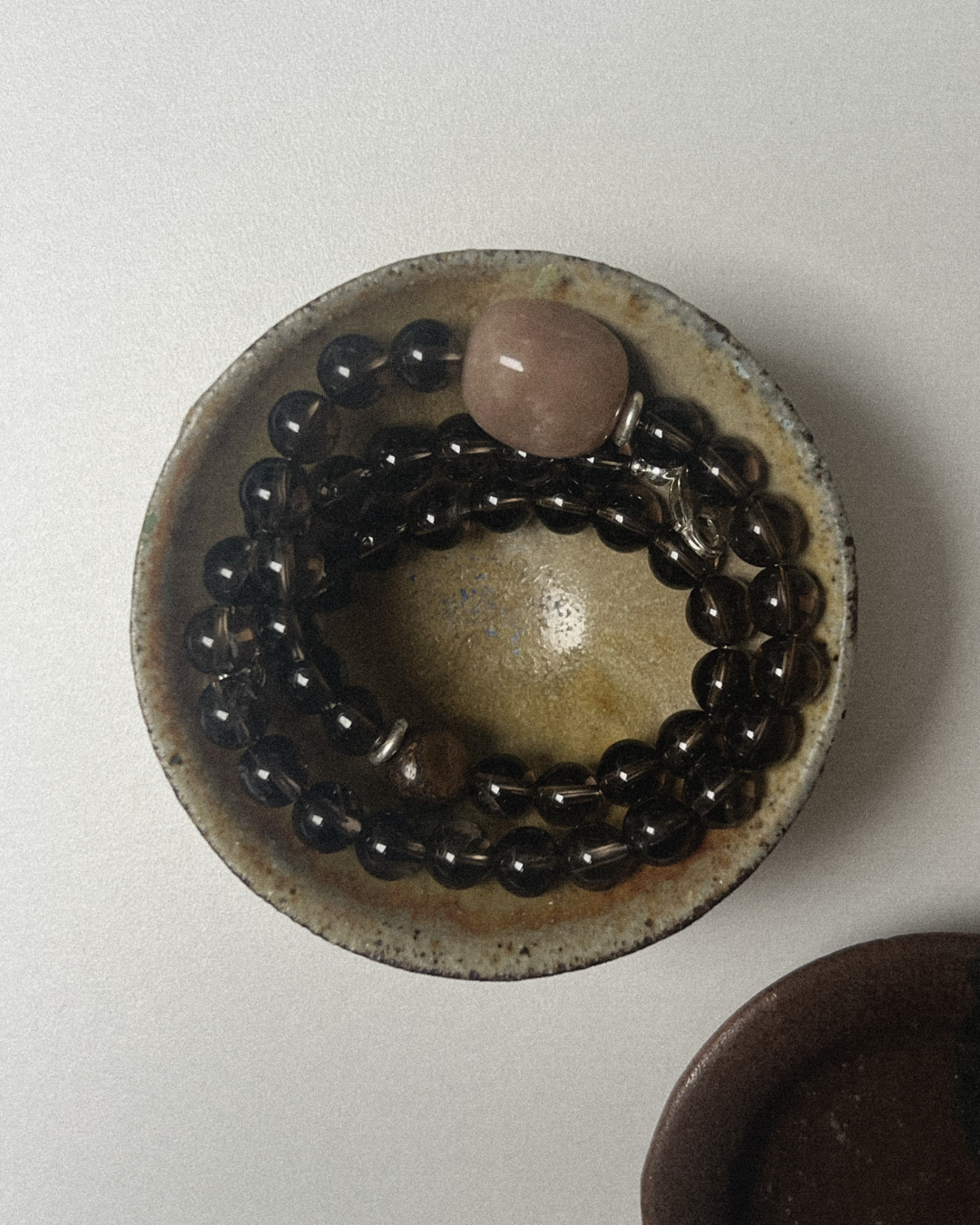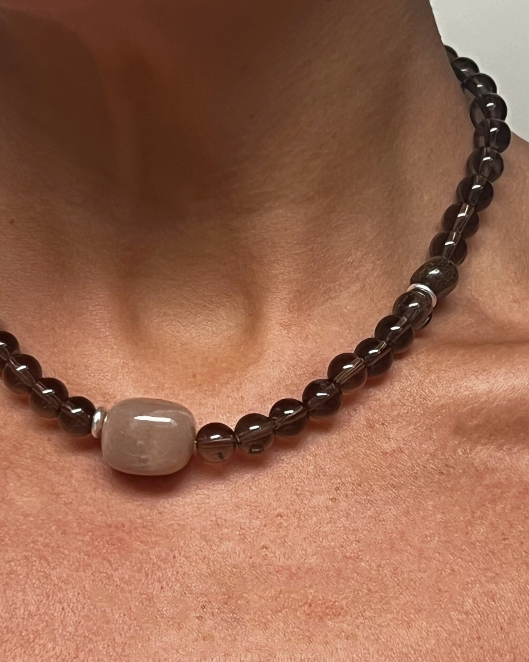 Smoky quartz is associated with protection, clarity, and release, offering a steady, grounding presence. Moonstone is linked to intuition, flow, and emotional healing, while bronzite adds stability and resilience. Silver brings balance and reflection, tying the elements together with subtle brightness. Together, they create a piece that feels grounding yet radiant - steady, intuitive, and quietly transformative.