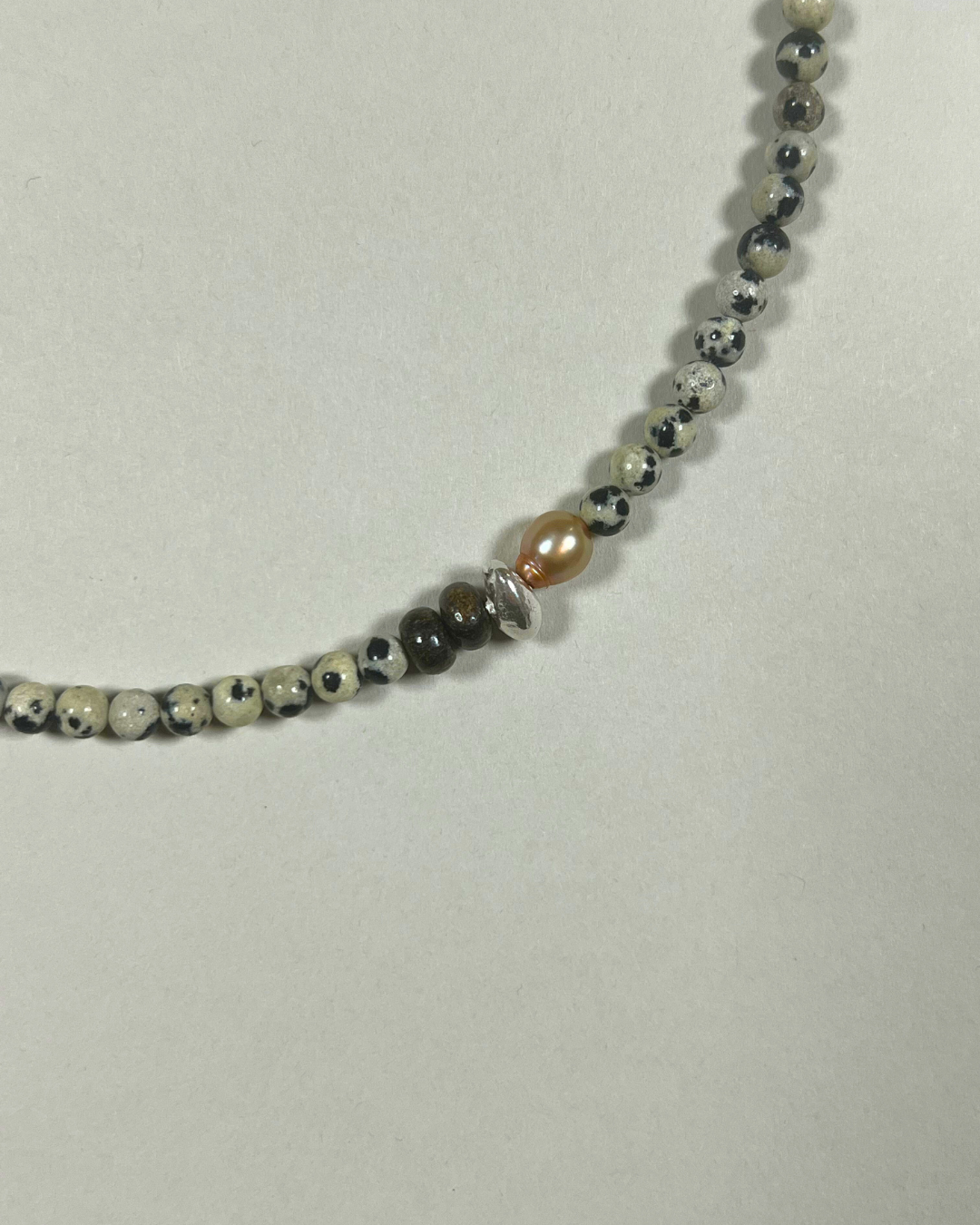A one-of-a-kind necklace featuring petite dalmatian jasper beads, hand-strung and finished with sterling silver findings and clasp. Accented with stacked bronzite rondelles, creamy freshwater pearls, and a sterling silver nugget, adding warmth, texture, and luminous contrast to the playful jasper.