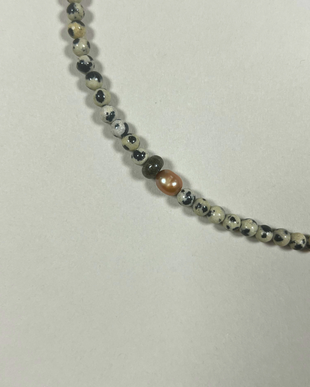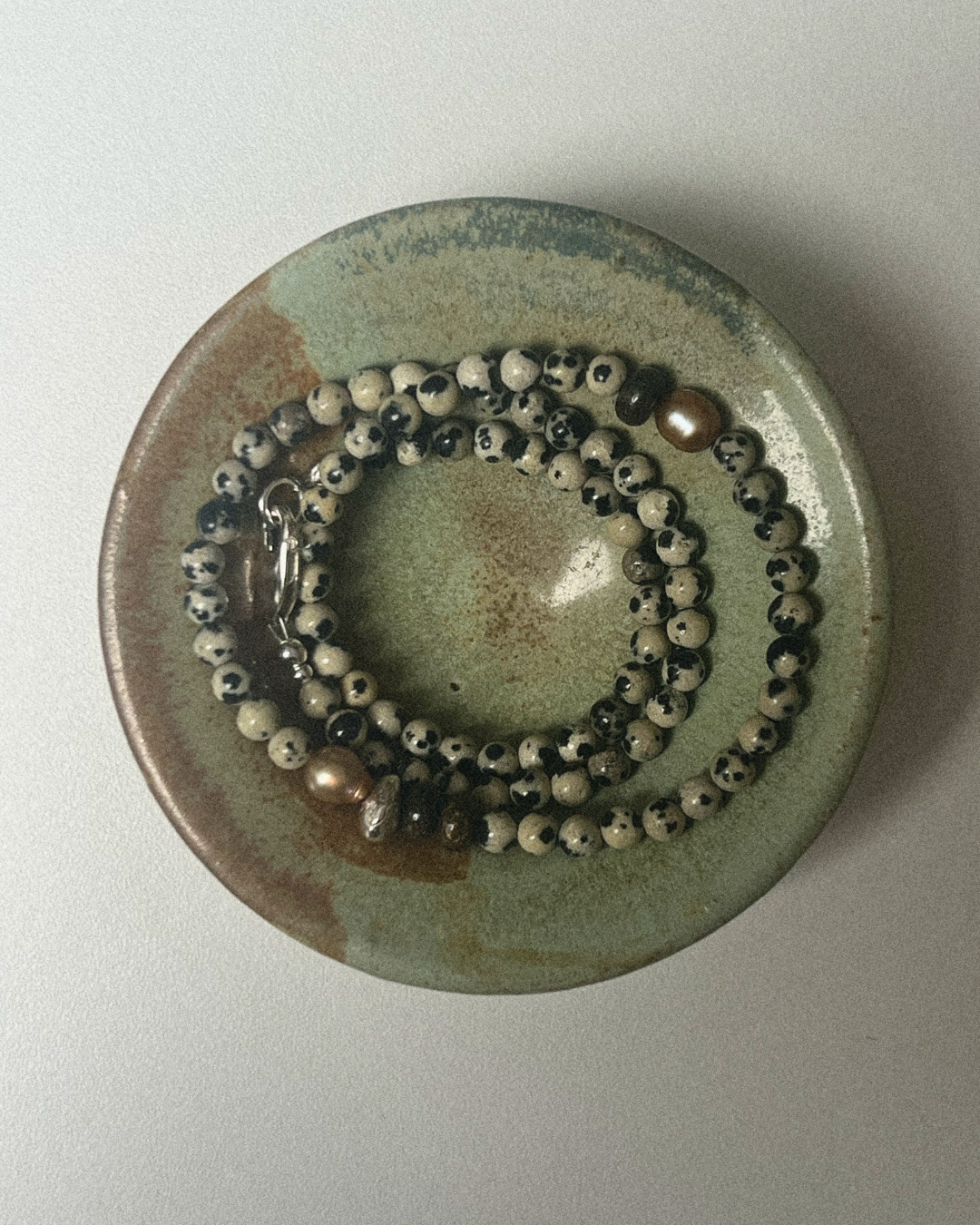 Dalmatian jasper is associated with joy, grounding, and balance, encouraging lightness and presence. Bronzite brings stability and resilience, pearls add softness and reflection, while silver offers balance and subtle brightness. Together, they create a piece that feels steady yet uplifting — grounding, joyful, and quietly radiant.