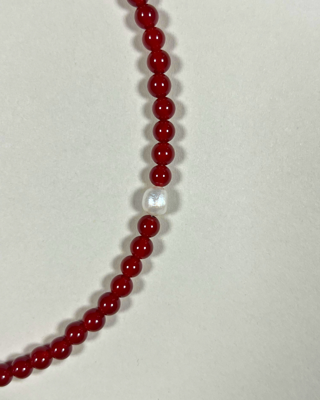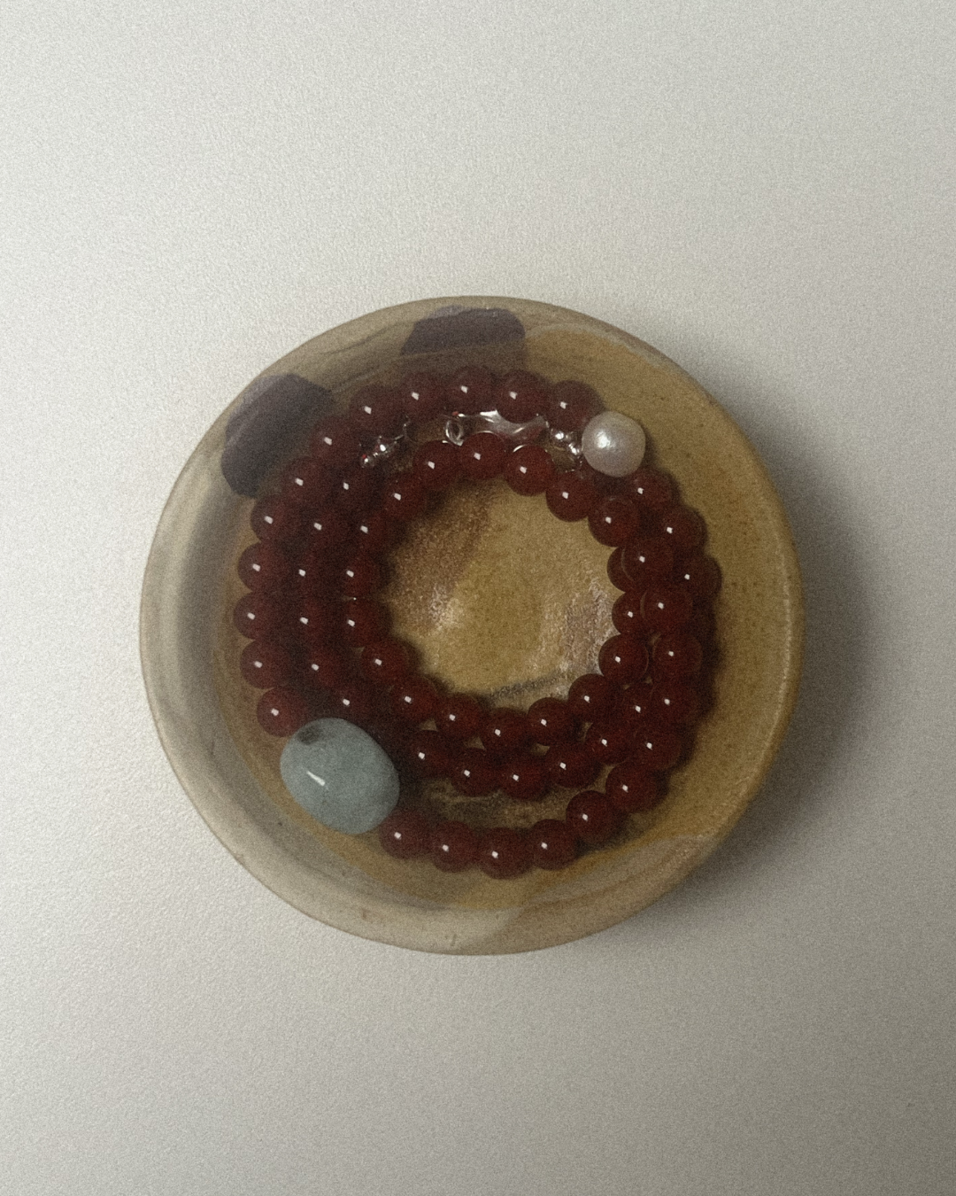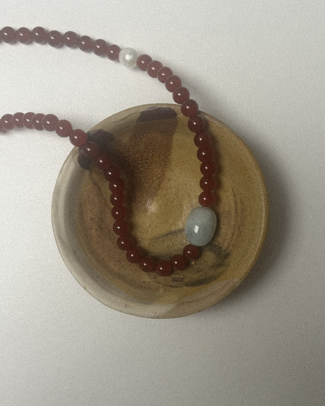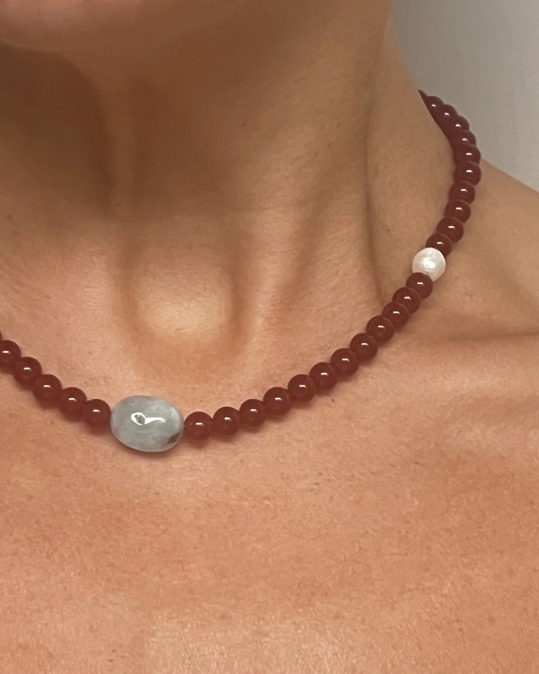 Carnelian is linked to vitality, confidence, and creative energy, offering warmth and motivation. Beryl is associated with calm, balance, and emotional ease, while pearl brings reflection and softness. Together, they create a piece that feels vibrant yet serene - energising, balanced, and quietly radiant.