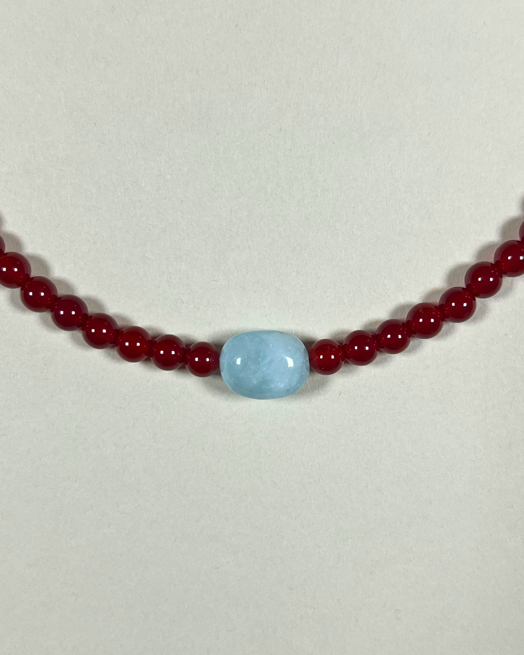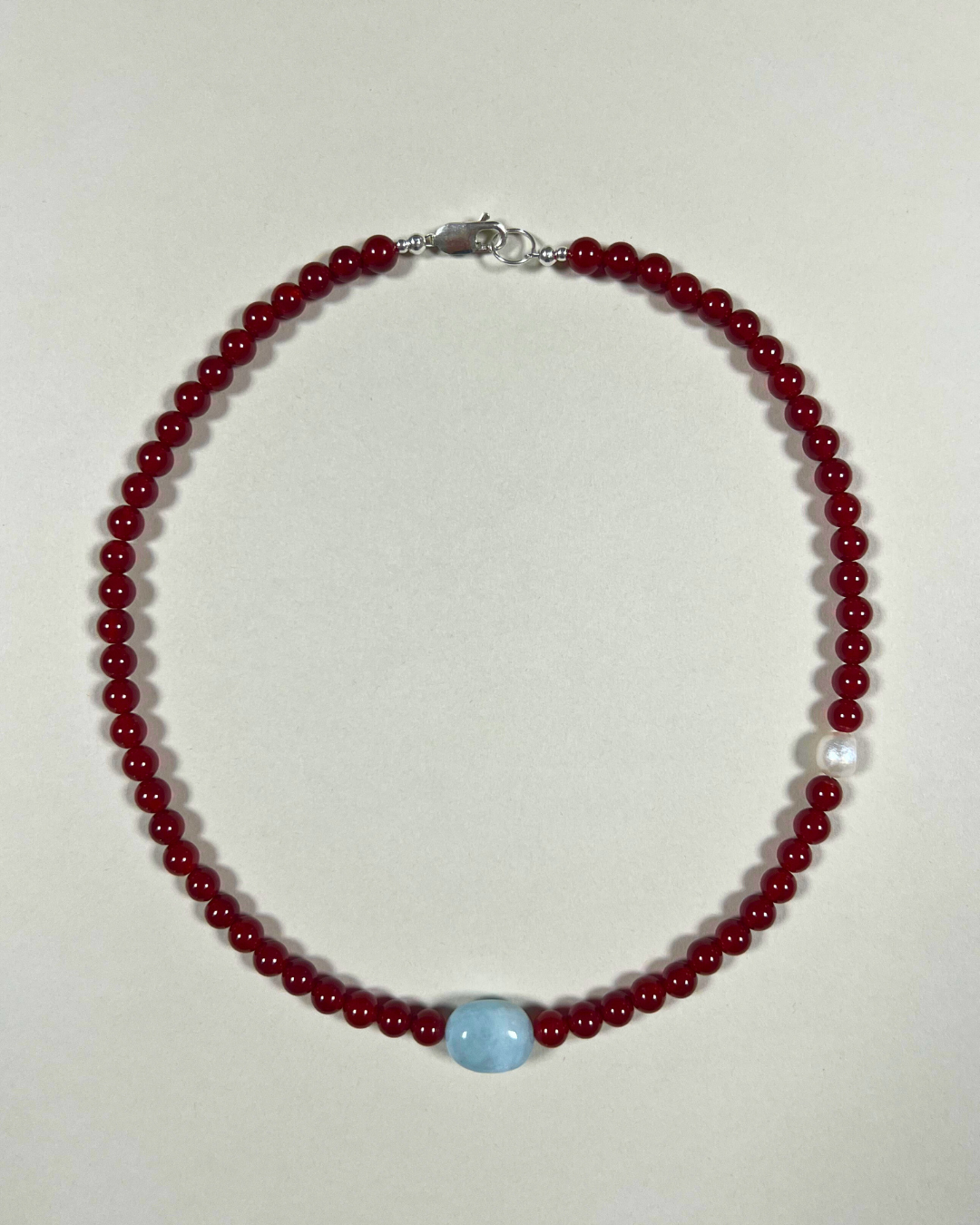 A one-of-a-kind necklace featuring 6mm warm carnelian beads, hand-strung and finished with sterling silver findings and clasp. At its centre sits a soft blue beryl bead, accented with a freshwater pearl - a gentle, luminous contrast to the vivid warmth of the carnelian.