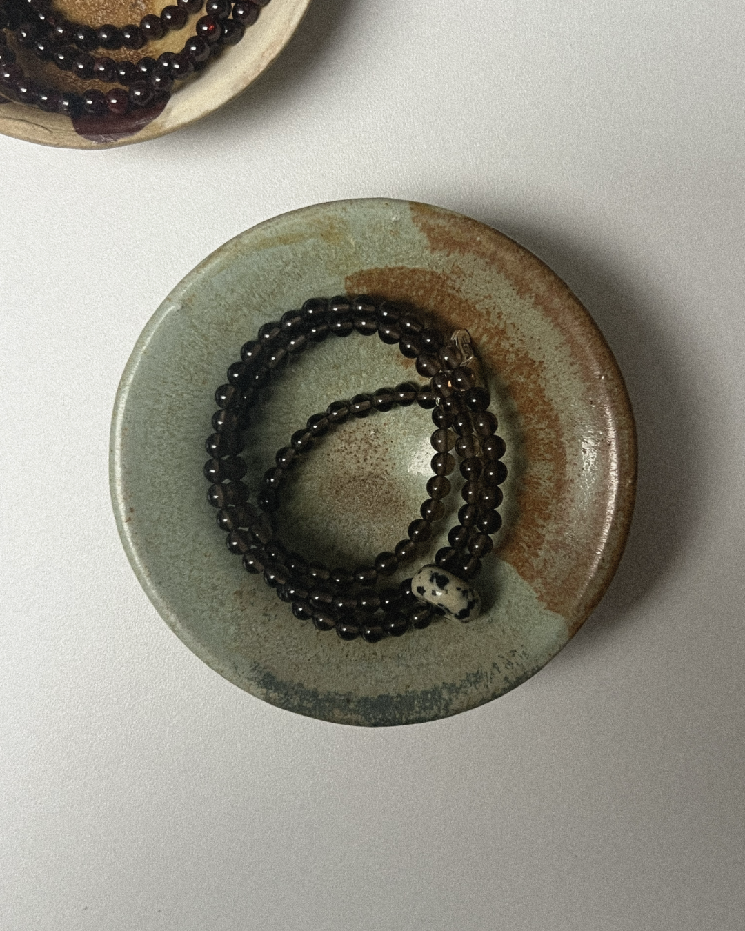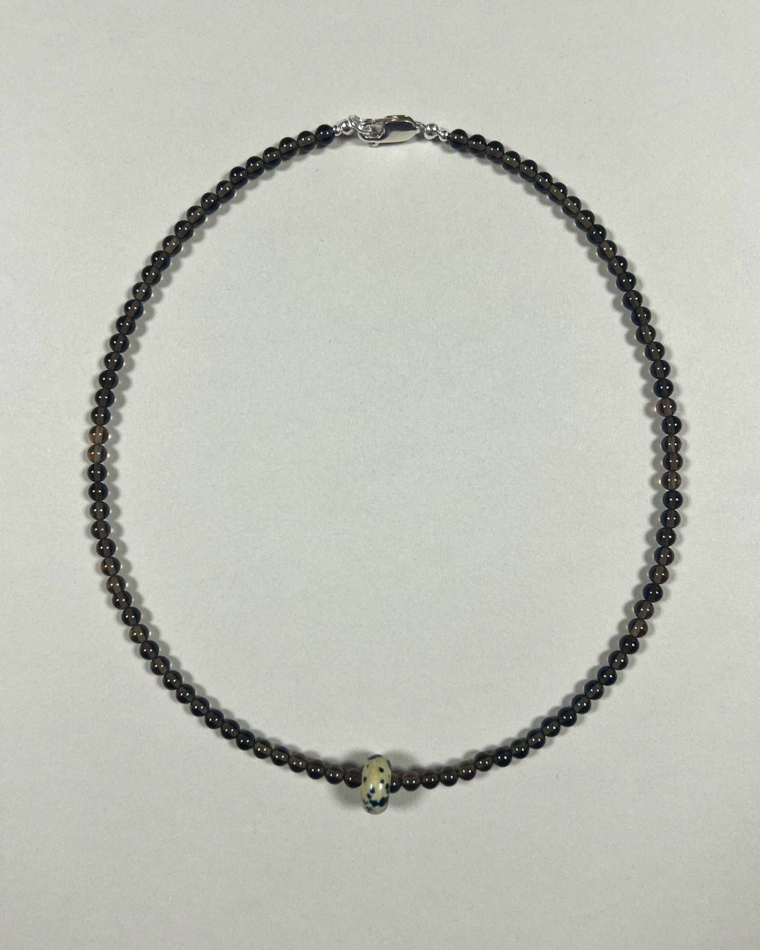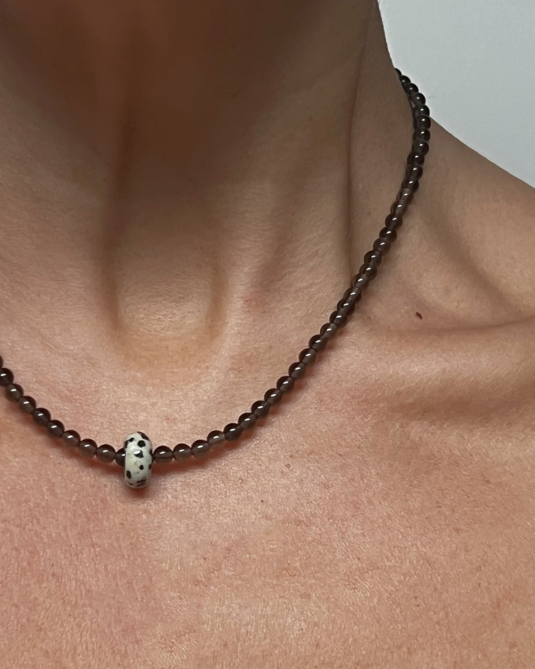A one-of-a-kind movement necklace featuring petite smoky quartz beads, hand-strung and finished with sterling silver findings and clasp. A dalmatian jasper bead moves freely along the strand, bringing playful contrast to the soft, grounding tones of smoky quartz.