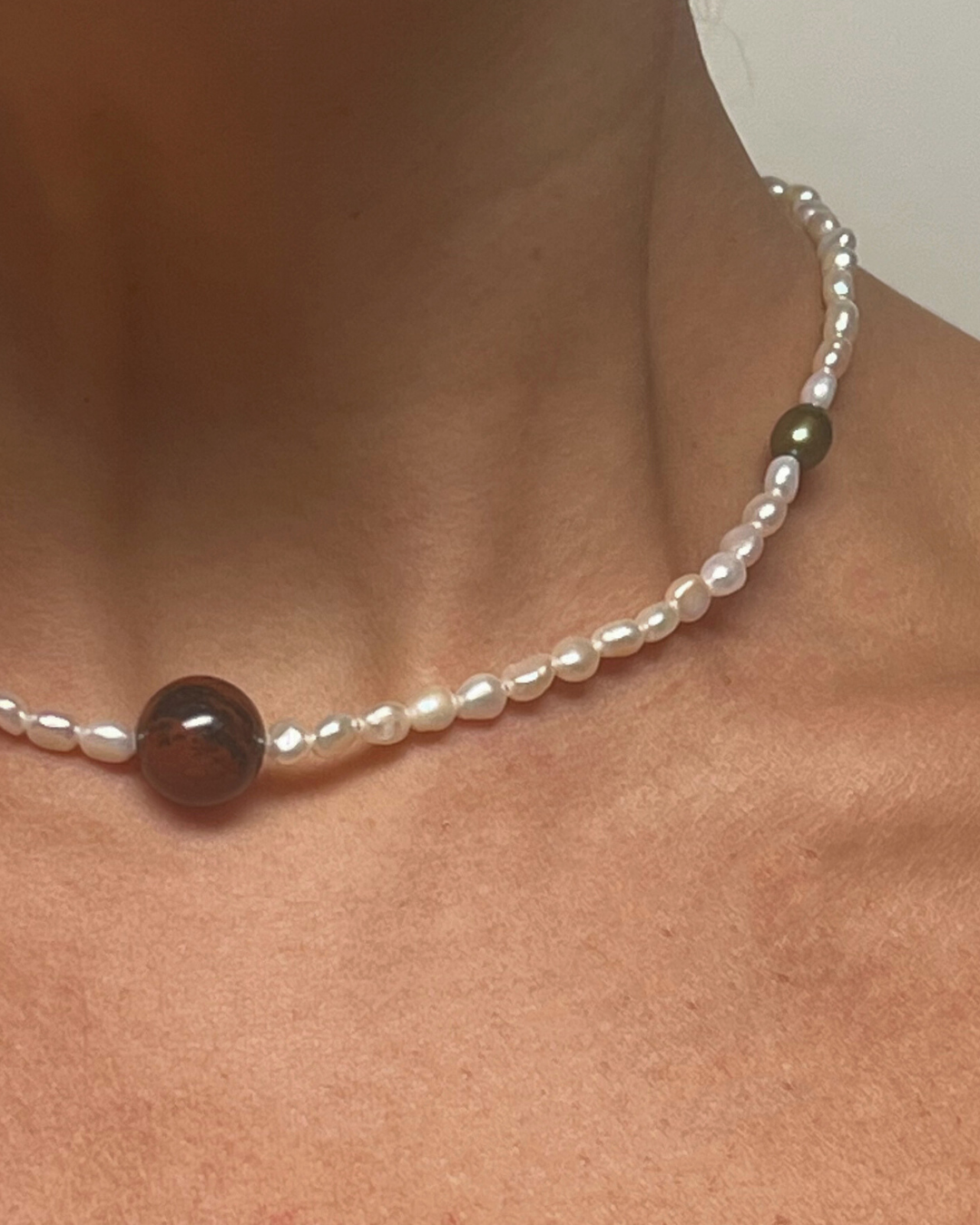 Pearl is associated with calm and reflection, offering emotional balance and softness. Mahogany obsidian is linked to grounding and protection, bringing stability and resilience, while green pearl adds a gentle note of harmony. Together, they create a piece that feels soft yet steady — luminous, grounding, and quietly balanced.