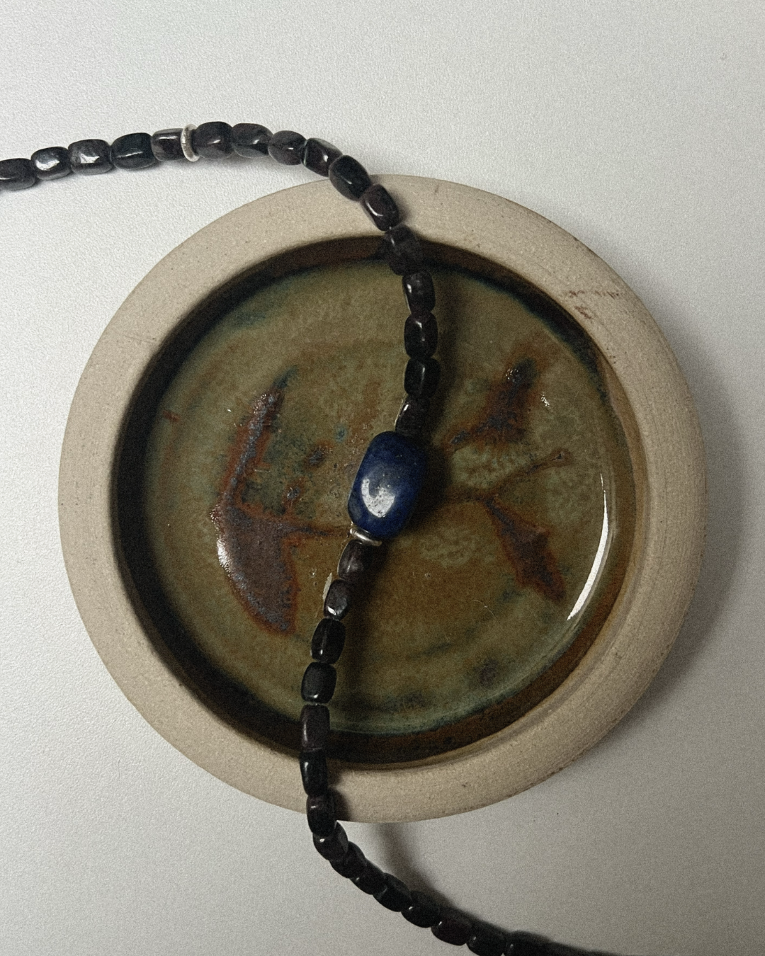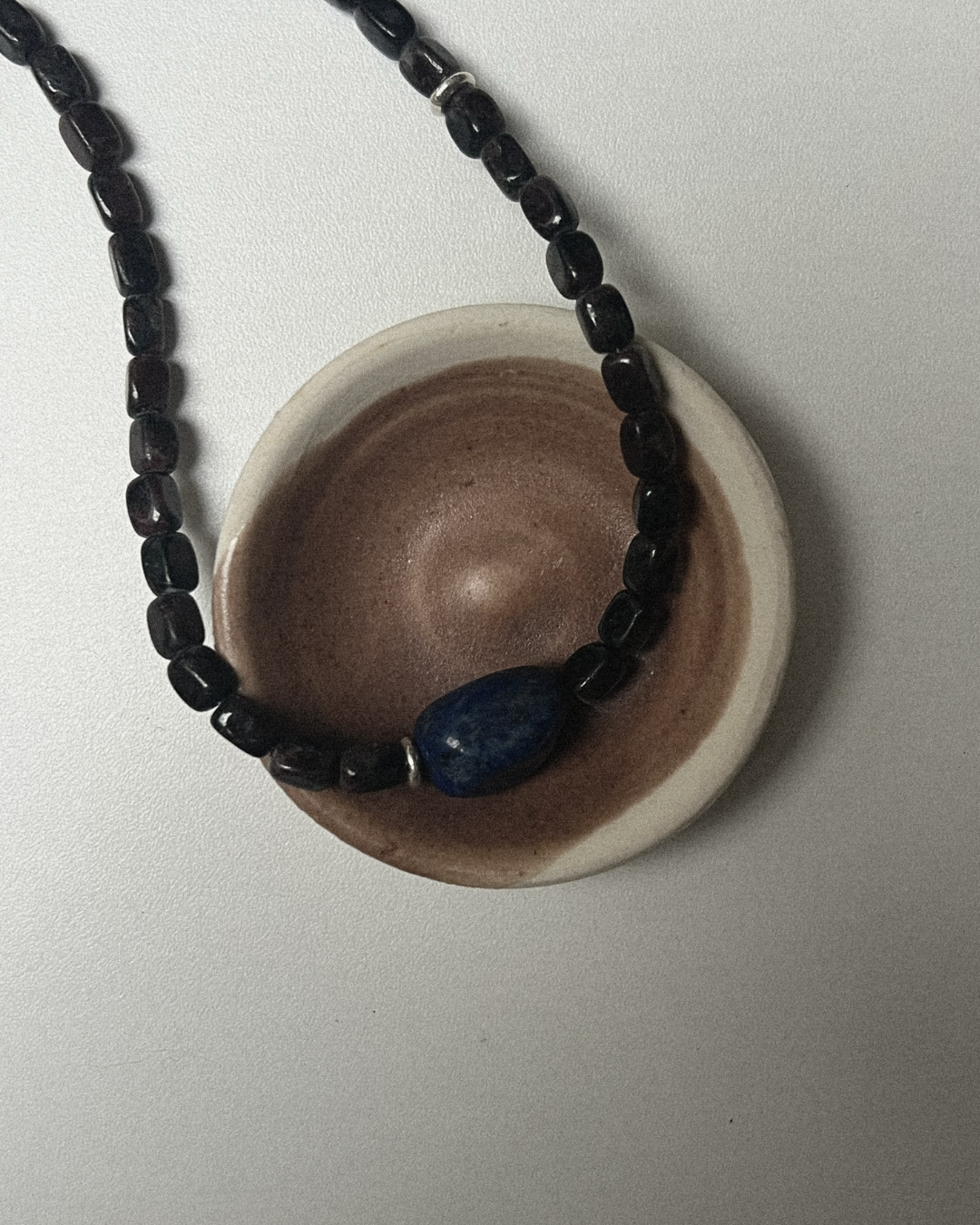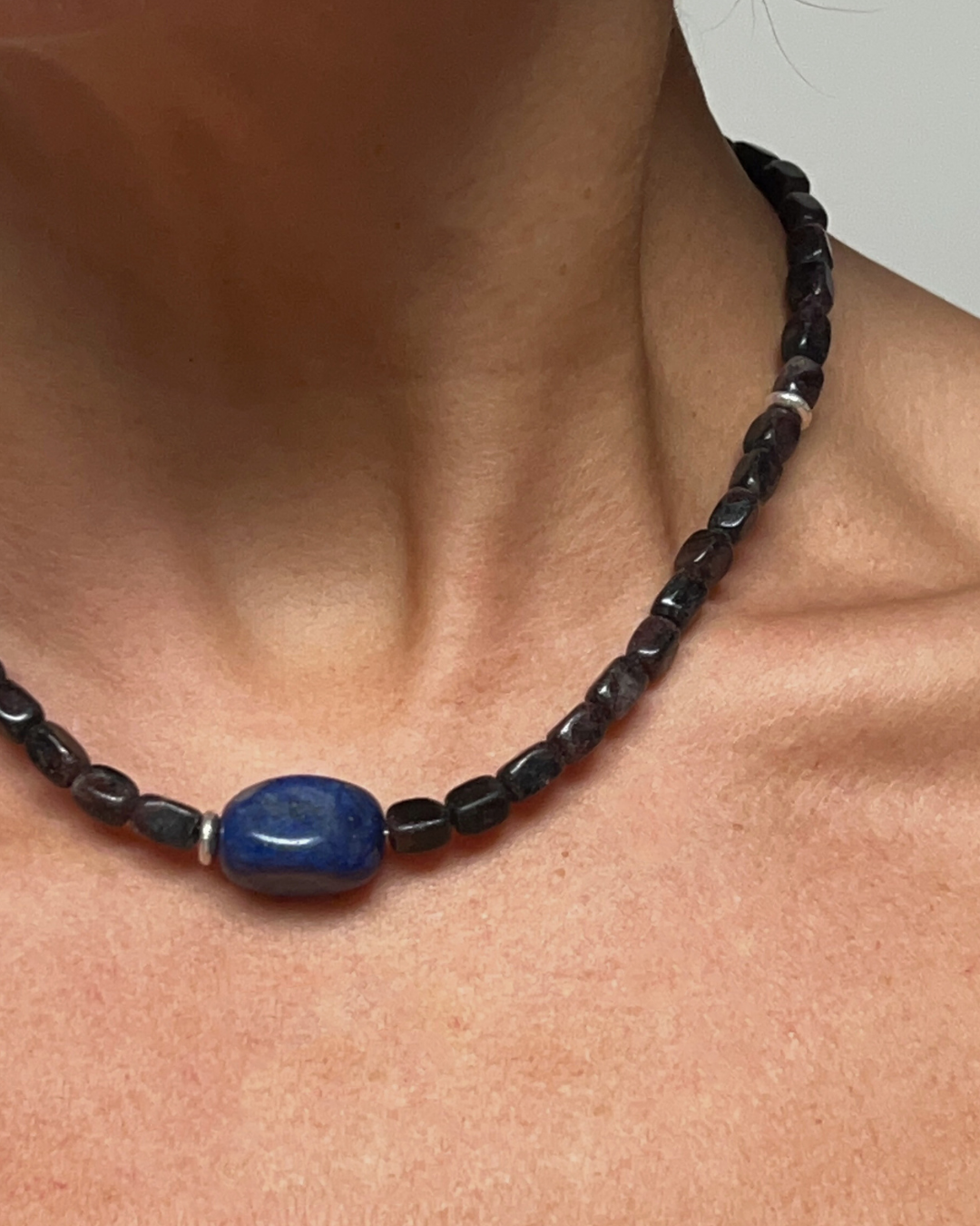 Garnet holds a rich, grounding energy - connected with passion, protection, and inner strength. Lapis lazuli brings depth and clarity, often associated with truth and wisdom. Together, they create a piece that feels powerful yet composed, with a quiet intensity and timeless character.