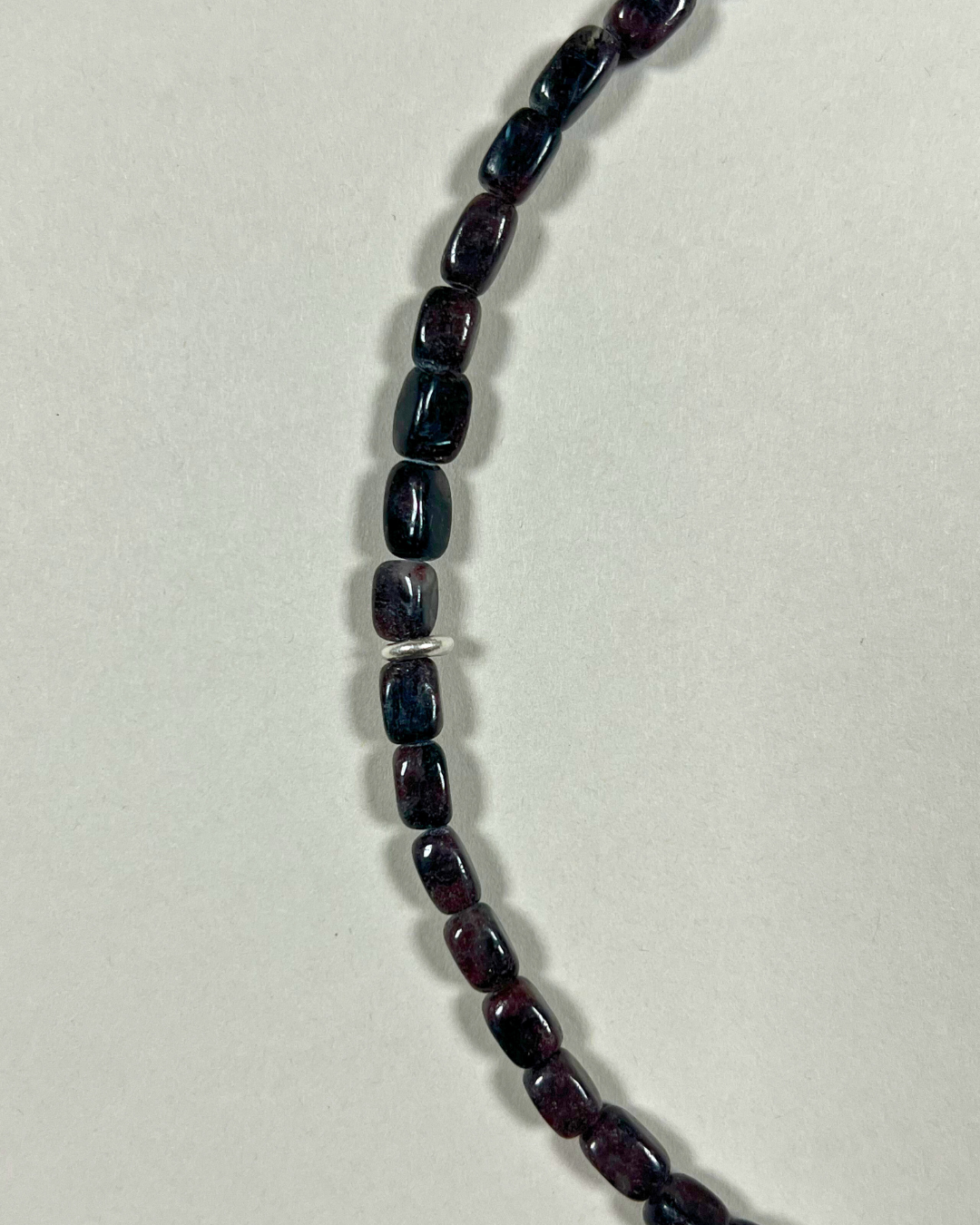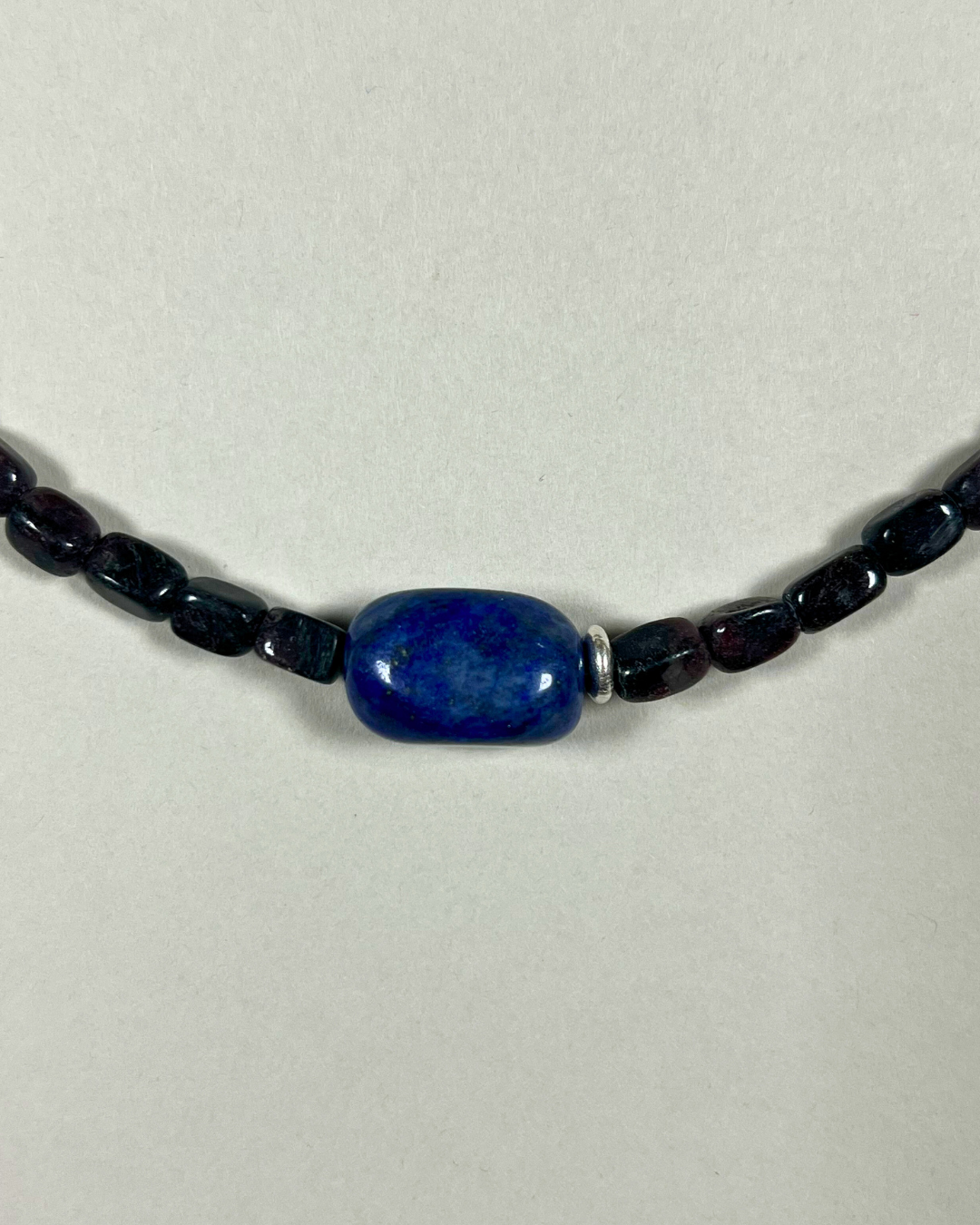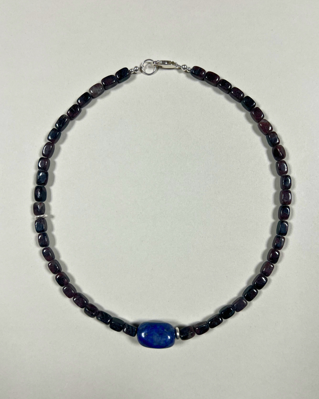 A one-of-a-kind necklace featuring cuboid matte garnet beads with a smooth central lapis lazuli and two accent fine silver stud beads. All findings and clasp are sterling silver.