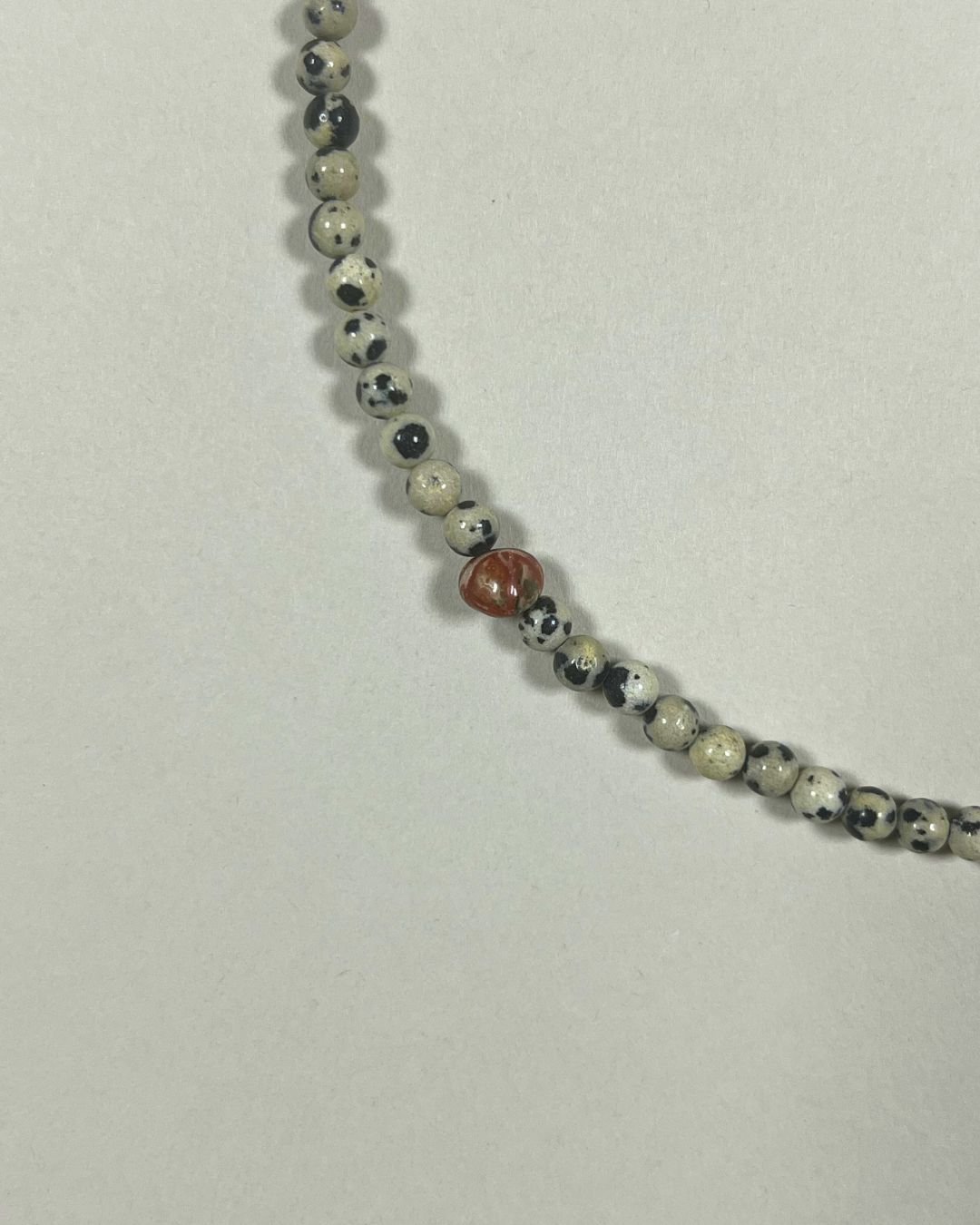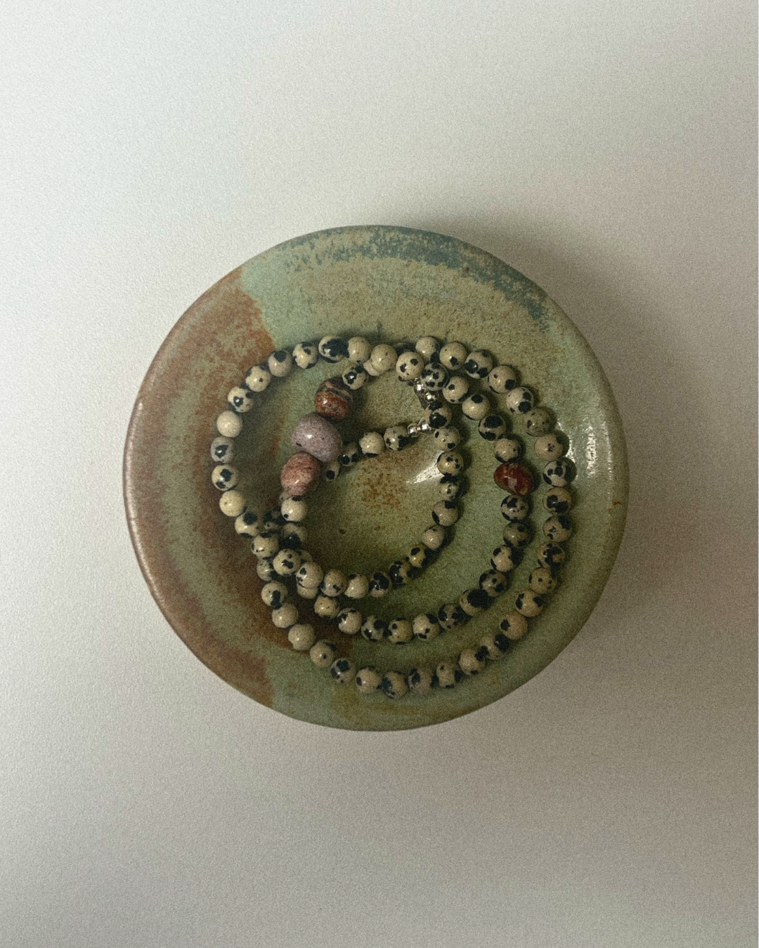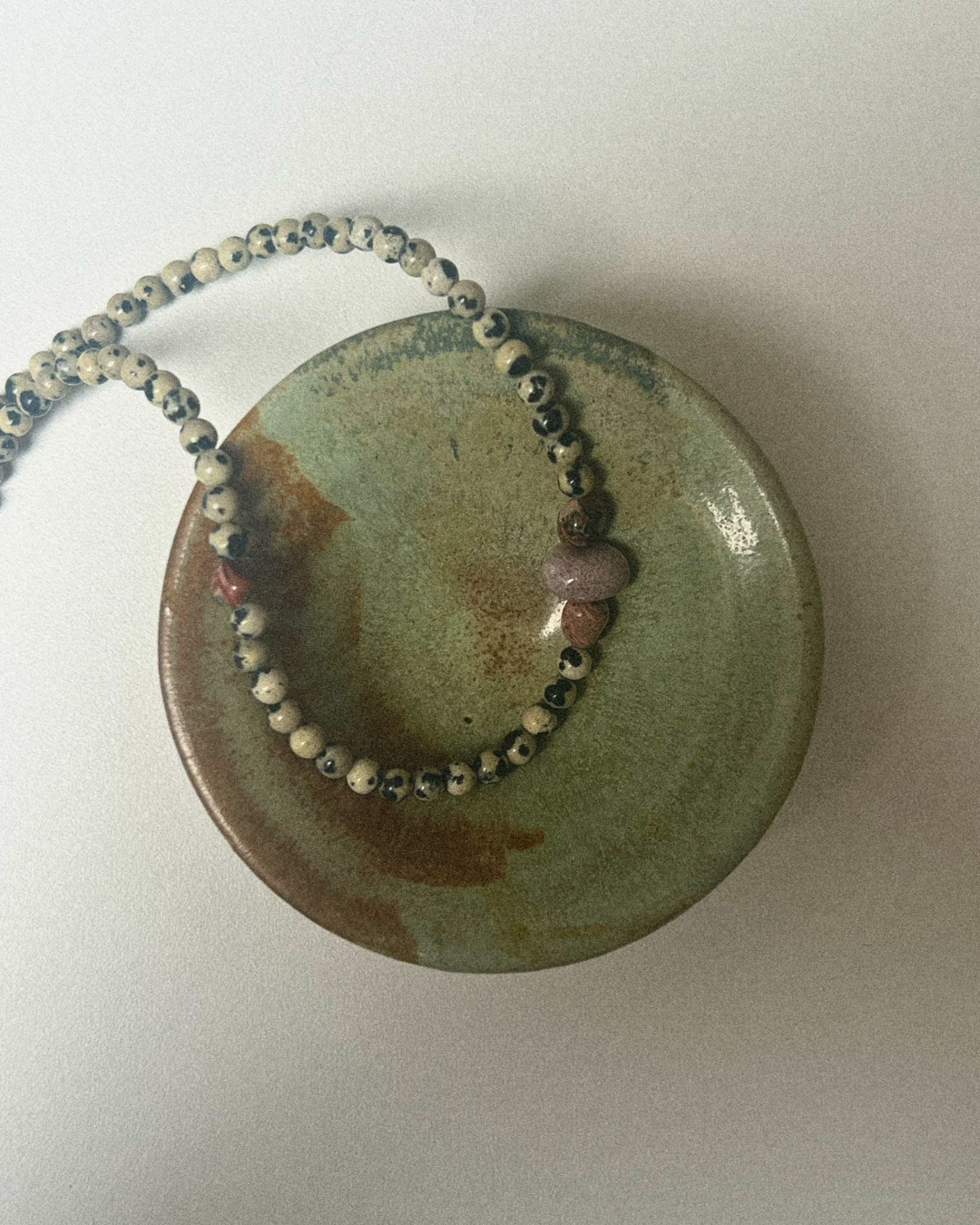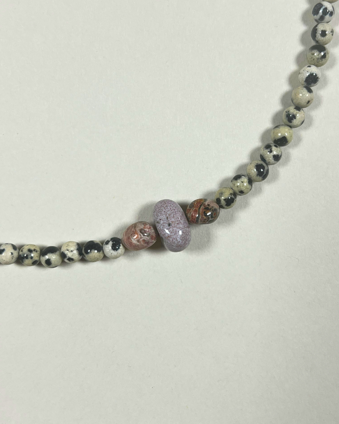 Dalmatian jasper is associated with joy, grounding, and balance, encouraging lightness and presence. Ocean jasper is linked to renewal and connection with nature’s rhythms, while leopard skin jasper brings vitality, protection, and adaptability. Together, they create a piece that feels grounded yet lively — steady, joyful, and quietly vibrant.