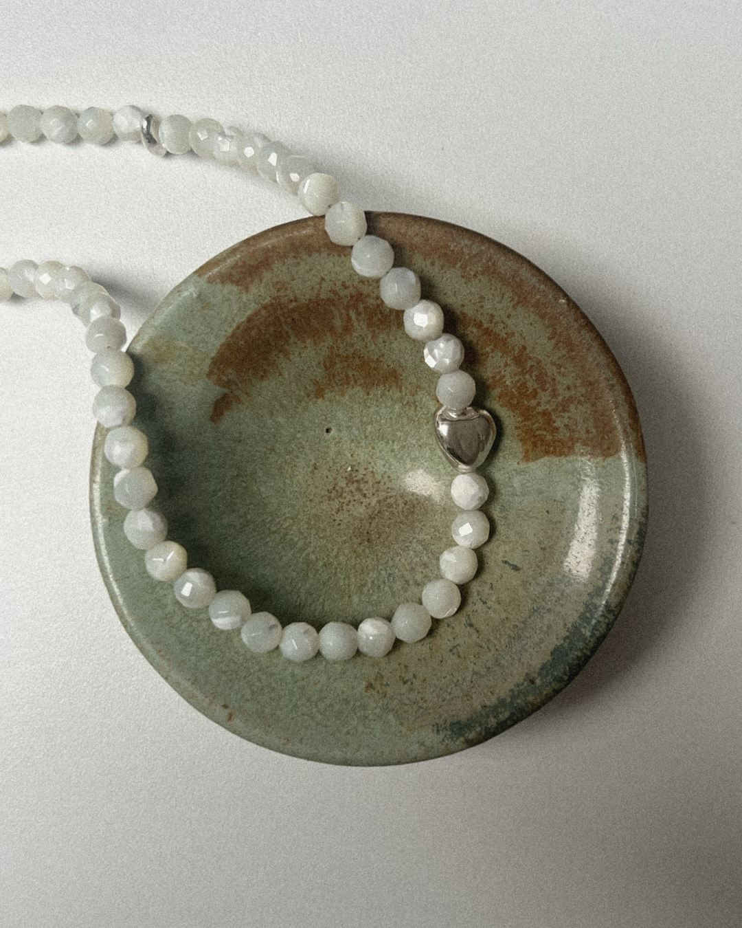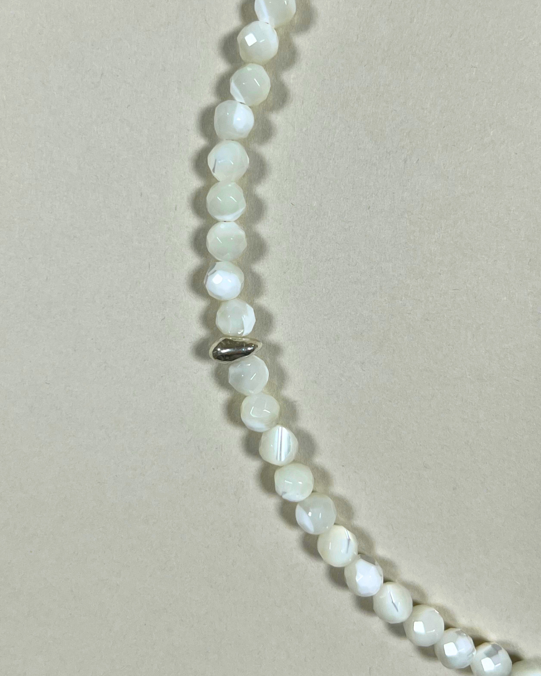 Mother of pearl is associated with calm and reflection, offering emotional balance and intuition. Silver brings harmony and grounding, enhancing the natural glow of the pearl with quiet luminosity. Together, they create a piece that feels soft yet steady - luminous, balanced, and quietly nurturing.