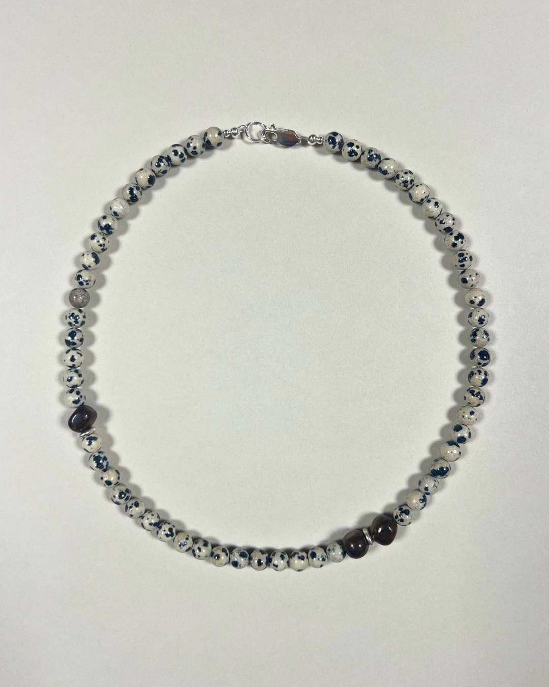 A one-of-a-kind necklace featuring 6mm dalmatian jasper beads, hand-strung and finished with sterling silver findings and clasp. Accented with three bronzite nuggets and two fine silver stud beads, adding grounding depth and texture to the playful jasper.