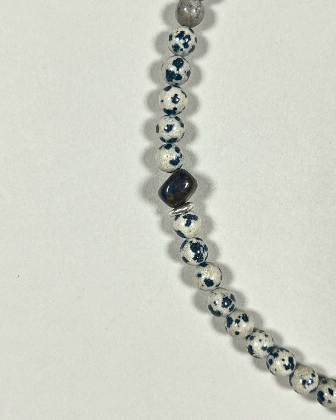 Dalmatian jasper is associated with joy, balance, and light-hearted energy, encouraging presence and optimism. Bronzite brings stability, strength, and protection, while silver offers balance and subtle brightness. Together, they create a piece that feels steady yet uplifting - grounding, joyful, and quietly composed.
