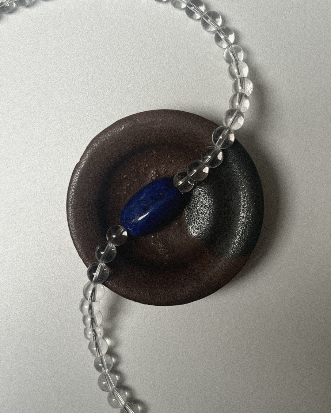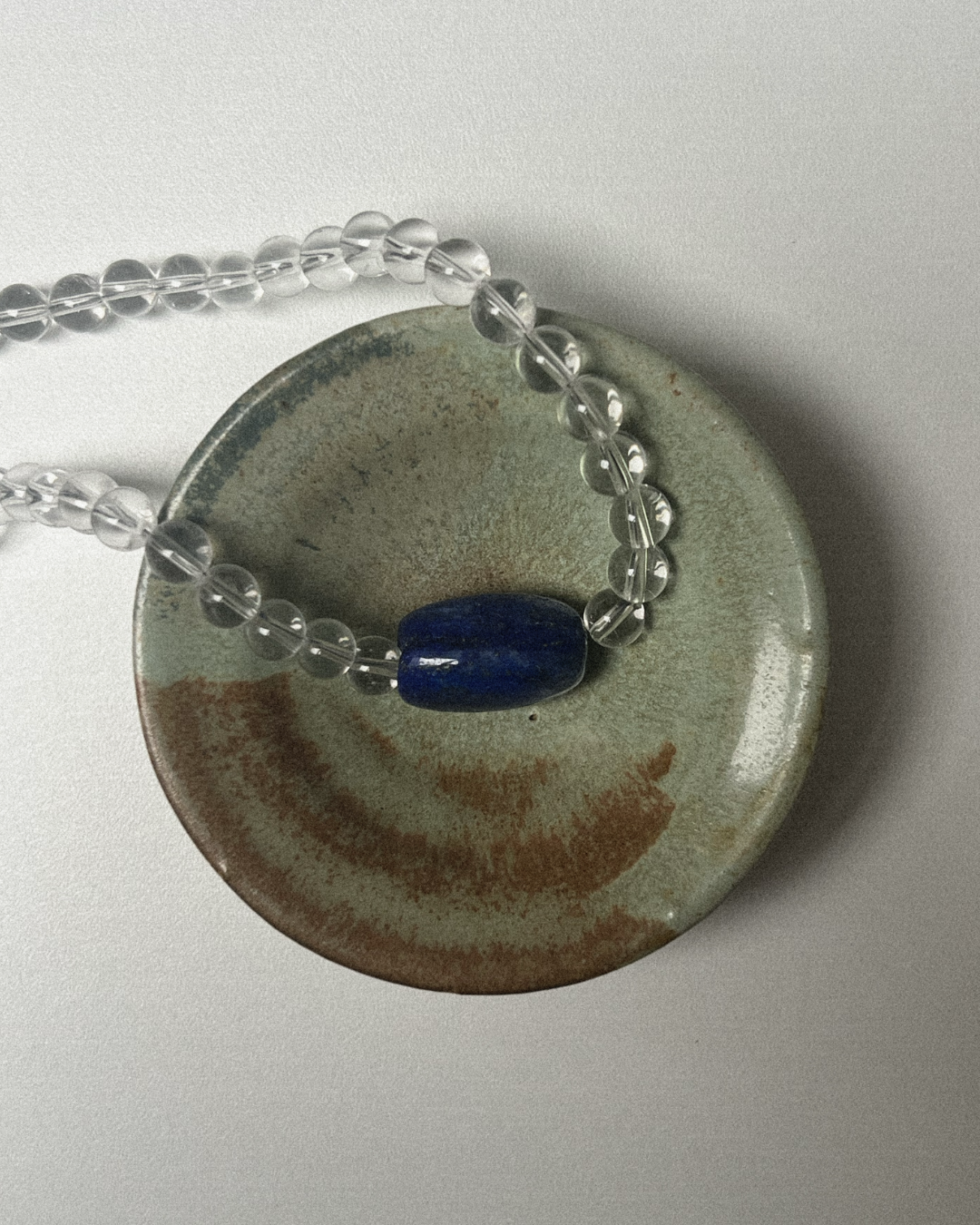 A one-of-a-kind necklace featuring 8mm clear quartz beads, hand-strung and finished with sterling silver findings and clasp. At its centre sits a smooth lapis lazuli bead - a striking detail against the luminous clarity of quartz.