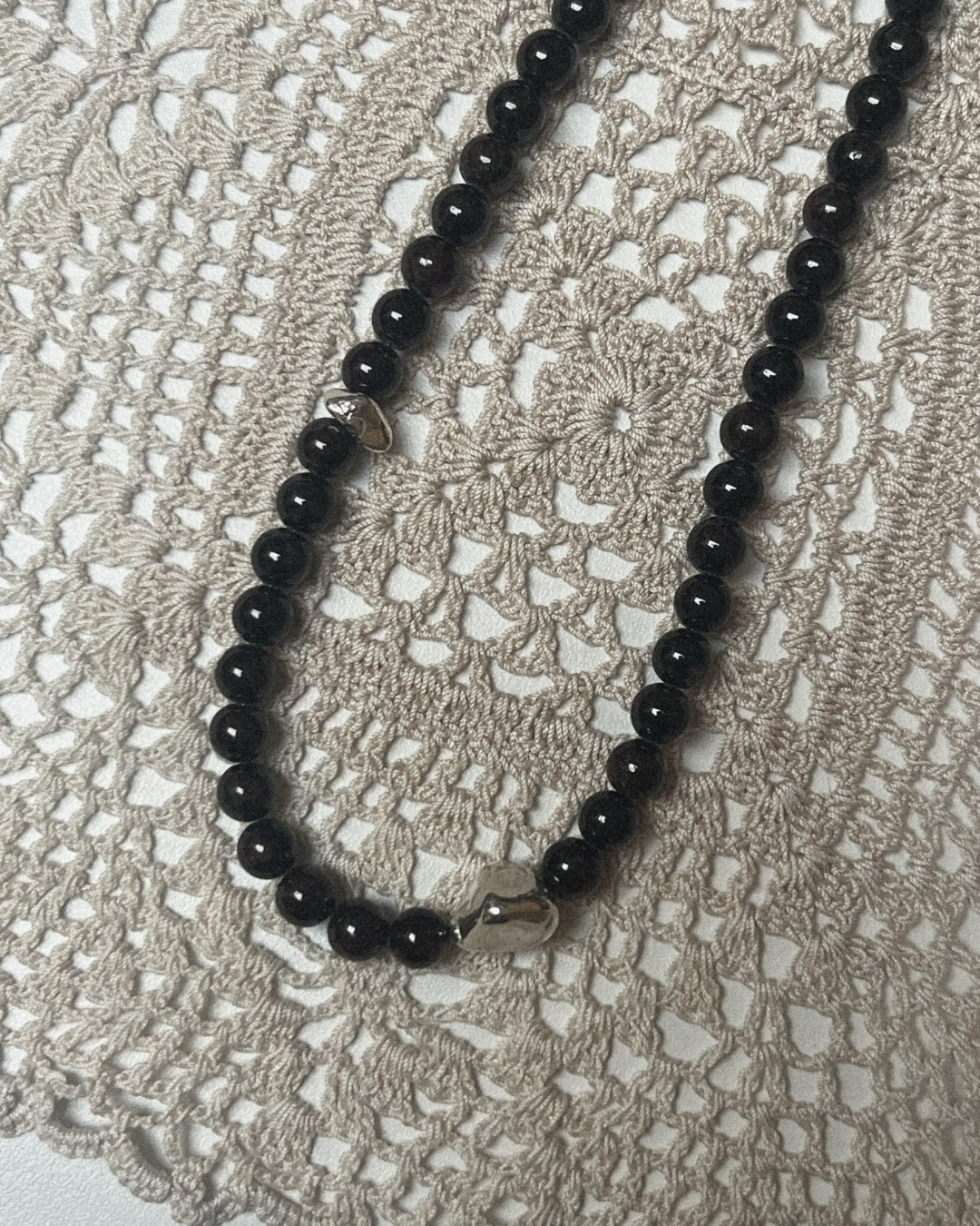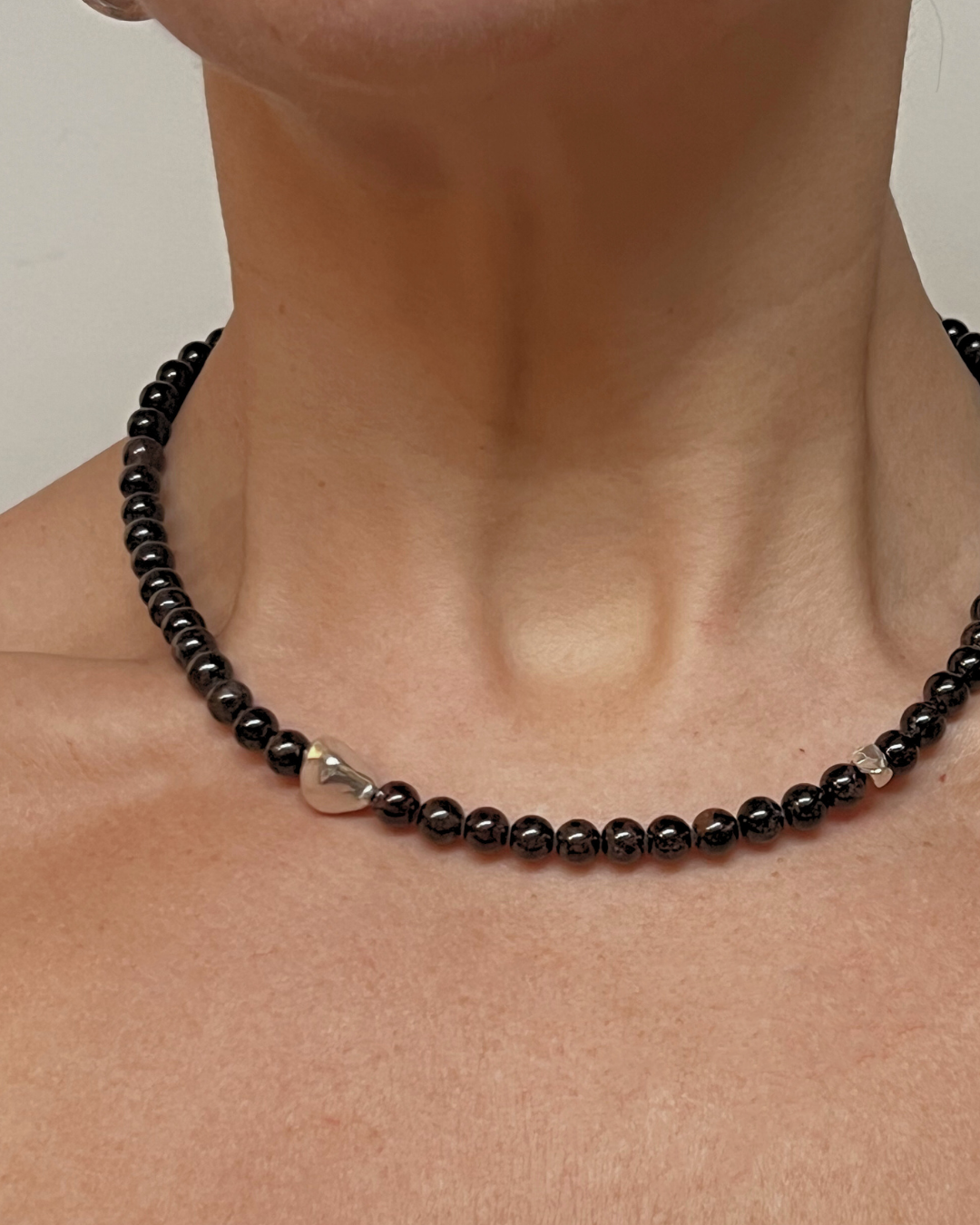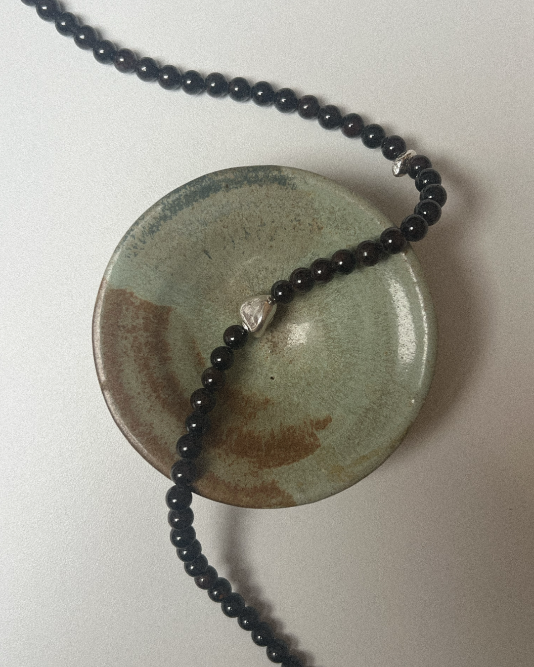 Garnet is grounding and protective, symbolising strength, passion, and quiet resilience. The sterling silver nuggets add light and texture, creating a subtle contrast to the rich, dark tones of the garnet. Together, they form a piece that feels strong, elegant, and timelessly composed.