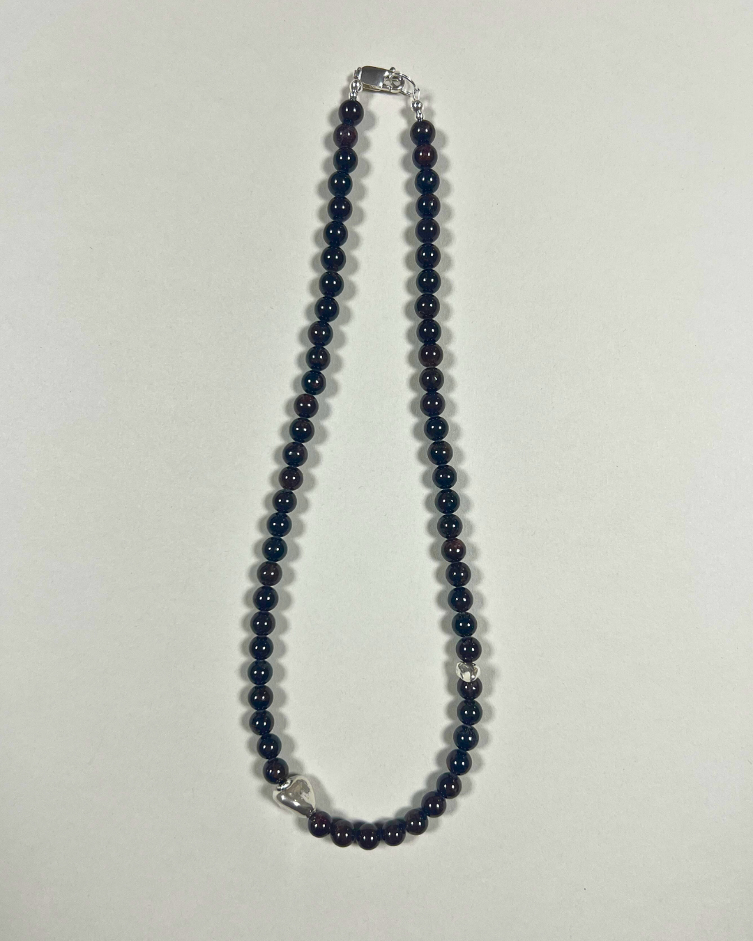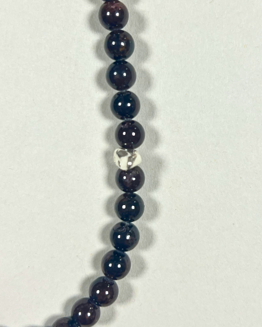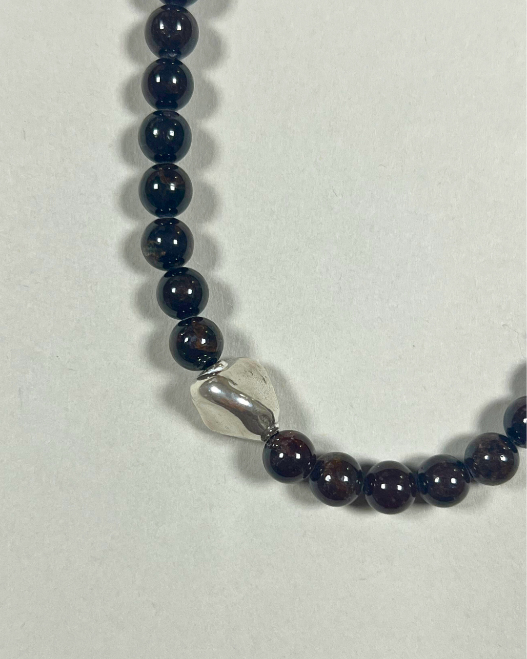 A one-of-a-kind necklace featuring 6mm deep garnet beads with two accent sterling silver irregular nugget beads. All findings and clasp are sterling silver.