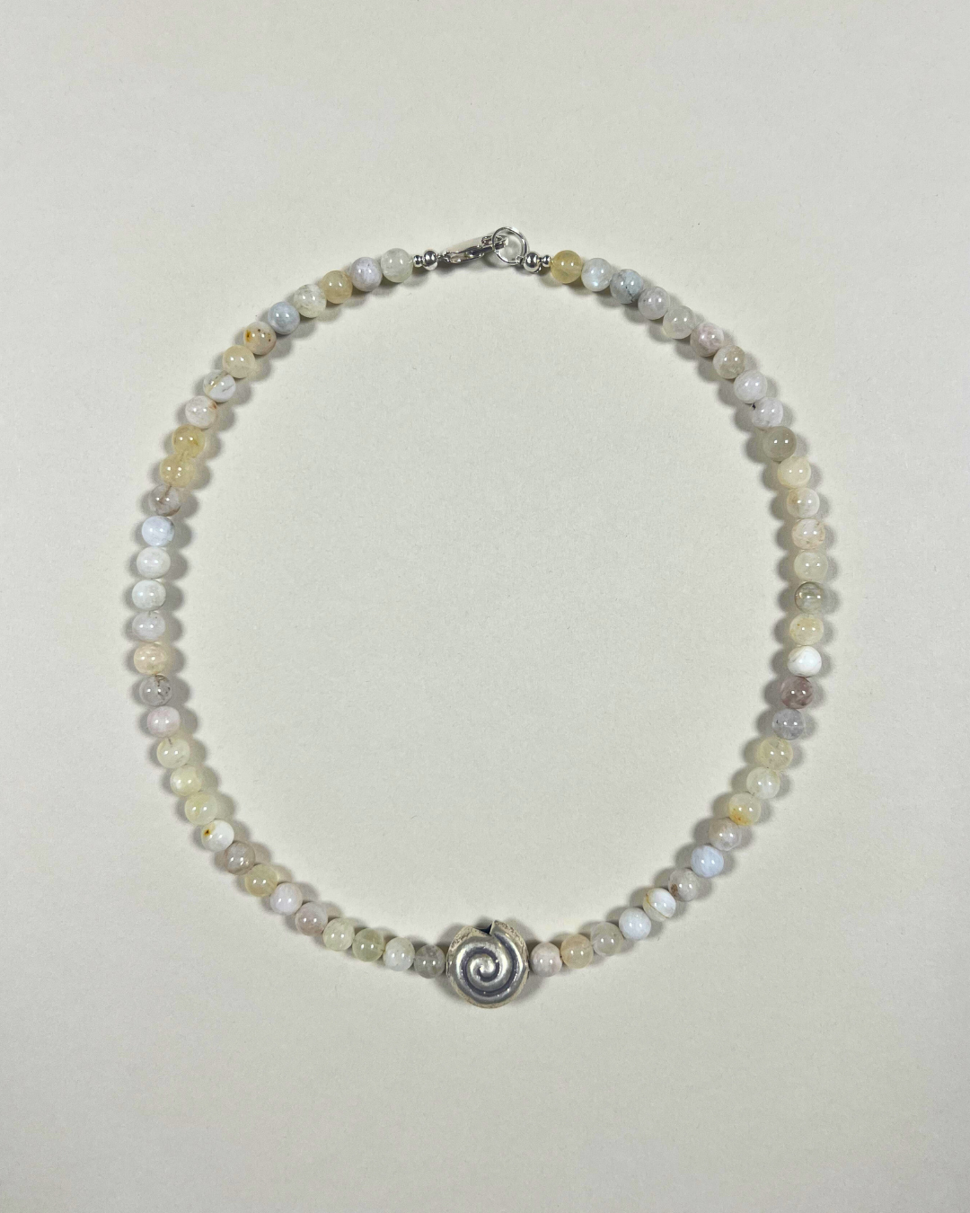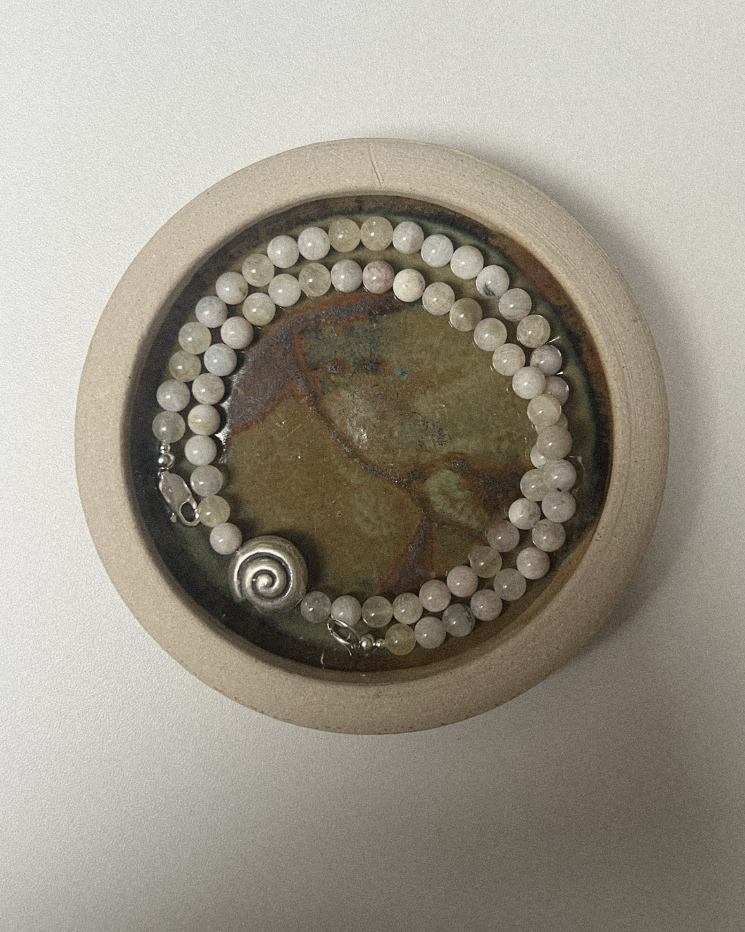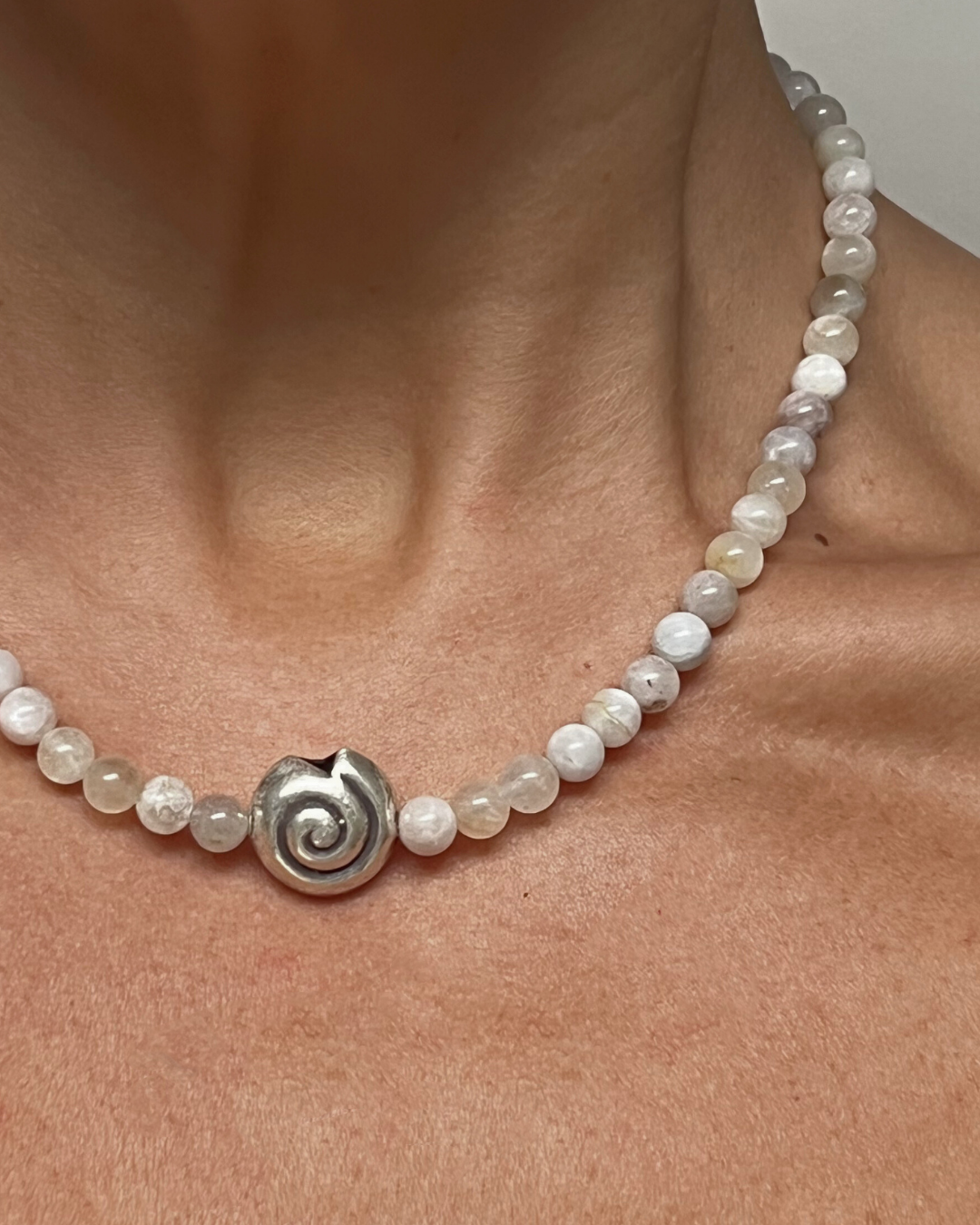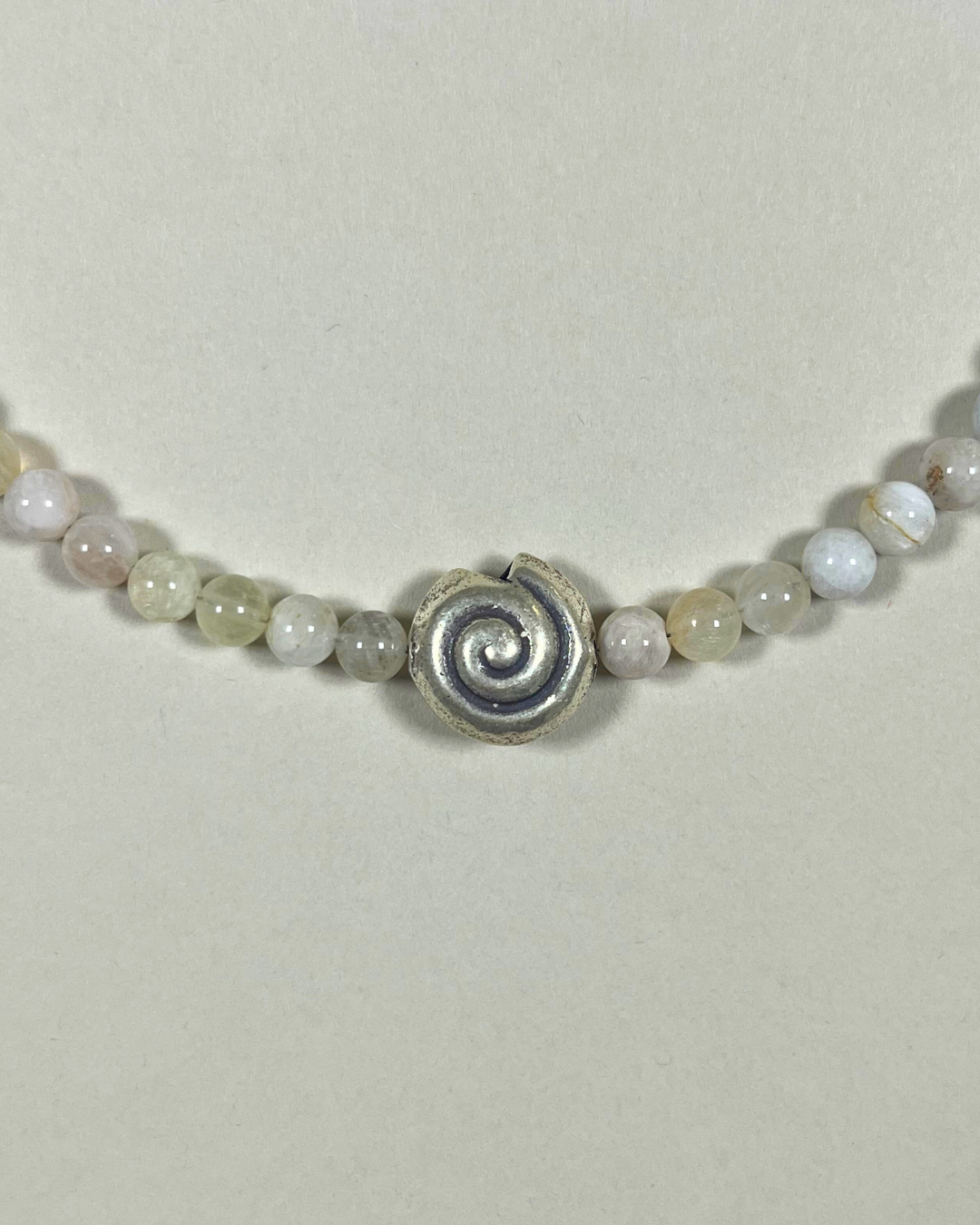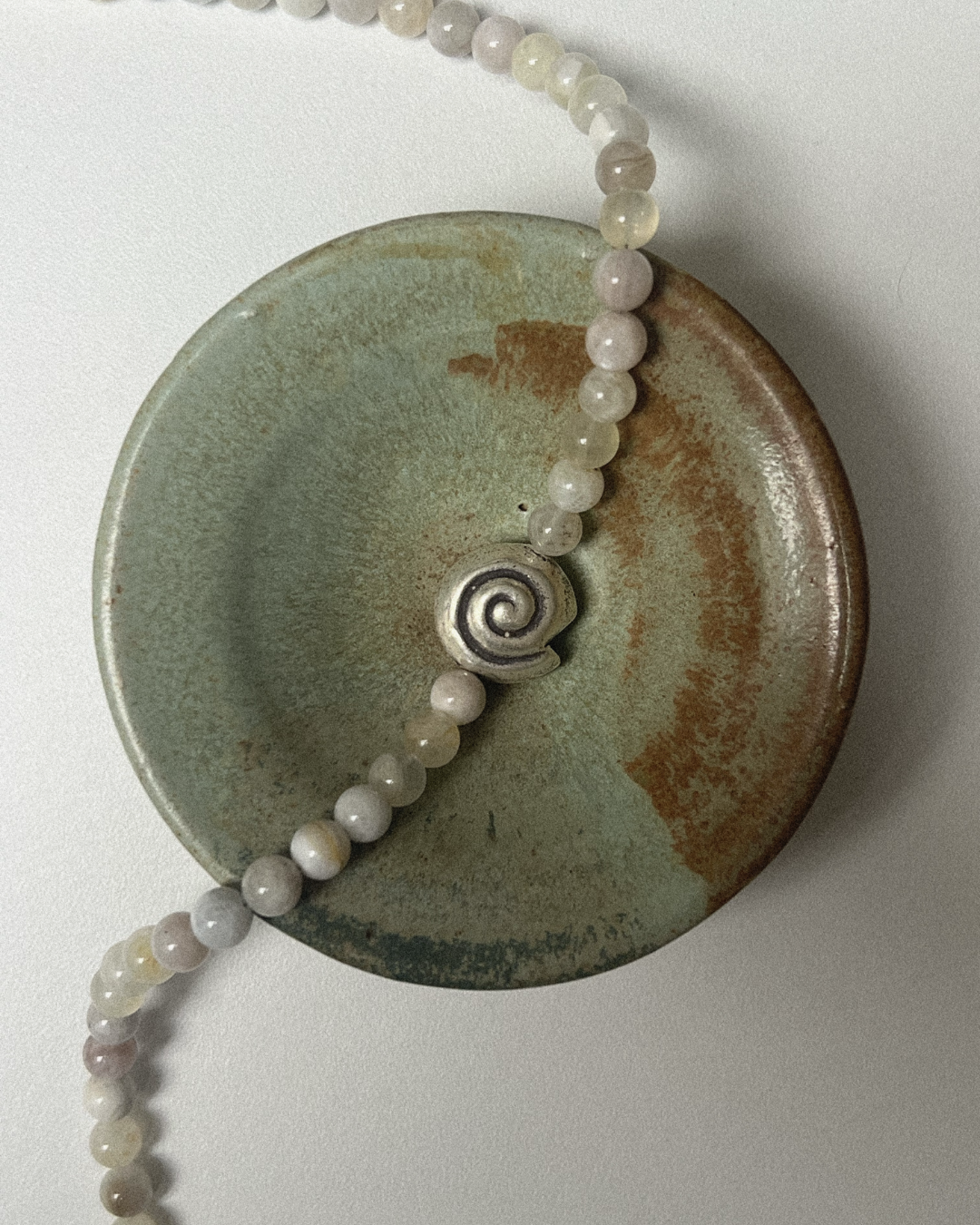 A one-of-a-kind necklace featuring moonstone beads, hand-strung and finished with sterling silver findings and clasp. At its centre sits a large fine silver spiral - a bold focal point set against the soft, luminous glow of moonstone.