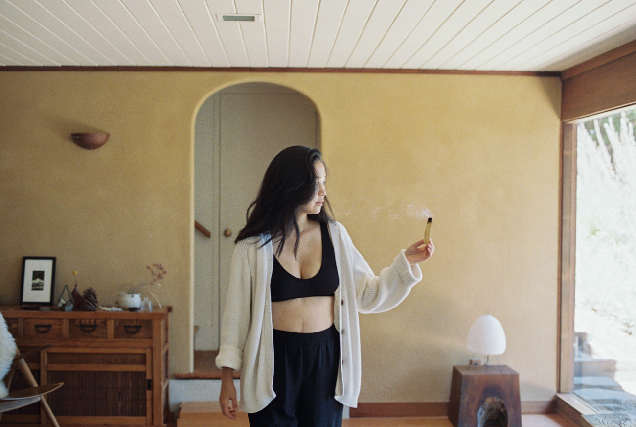 Once caught, allow the stick to flame for 30 seconds then blow out. Gently fan the embers, move around the space, spreading the smoke to cleanse.
