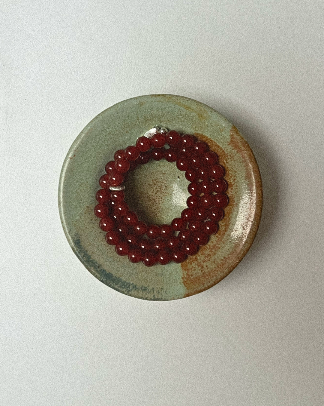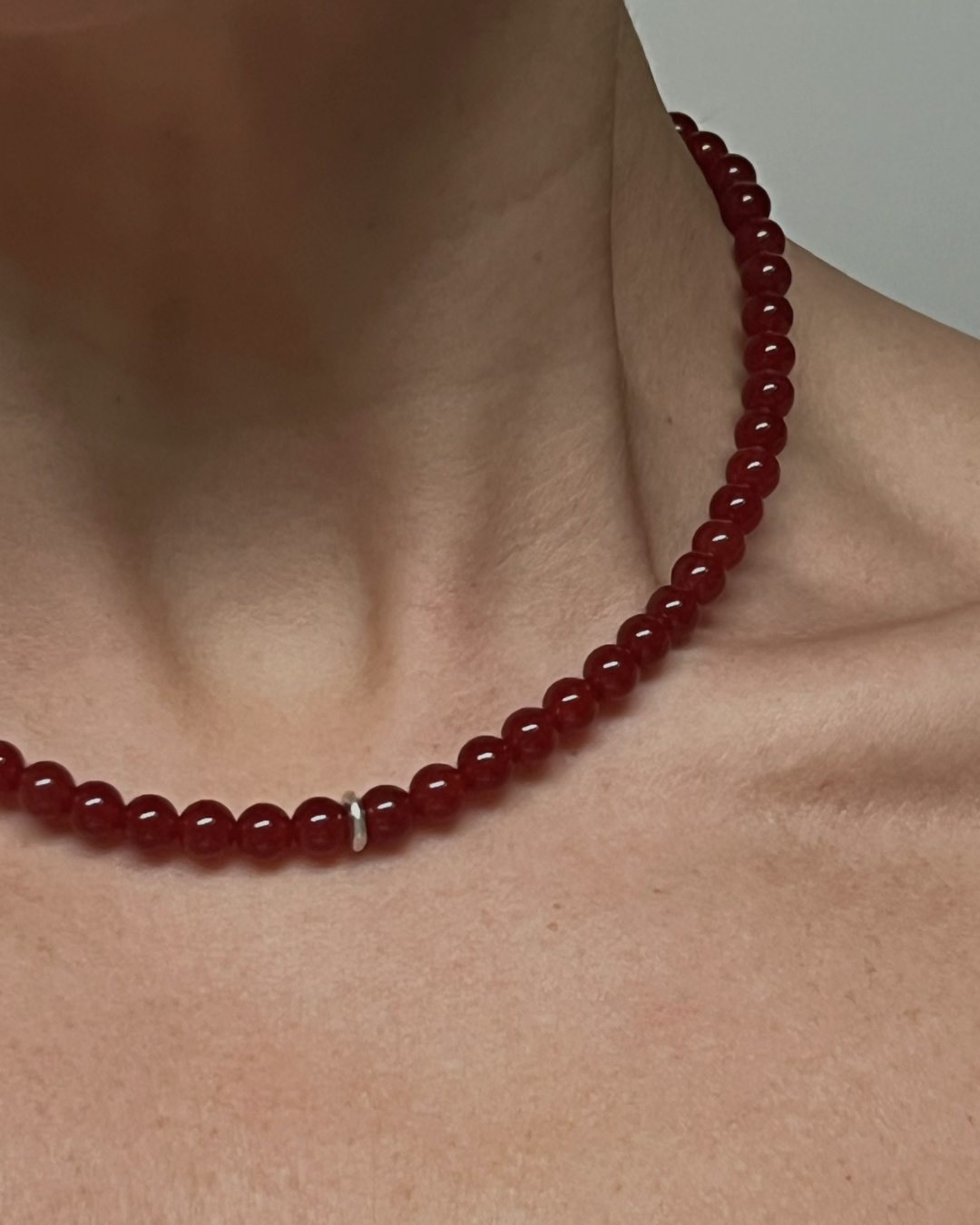 Carnelian is known for its warm, steady vitality, offering gentle energy and grounded confidence through its rich red tone. The single silver accent adds a quiet point of light, keeping the composition refined and balanced. The result is a piece that feels warm, composed, and enduring.