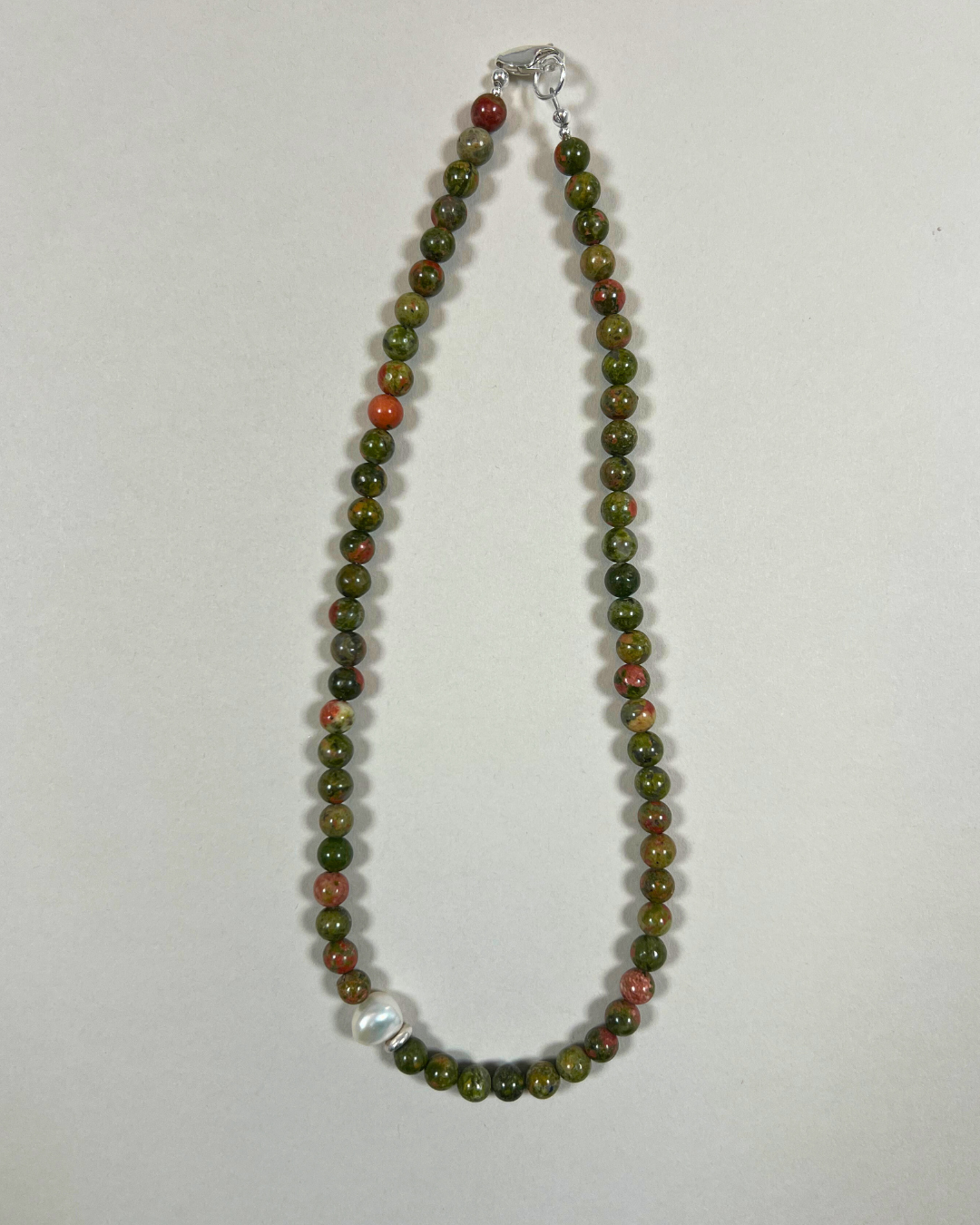 A one-of-a-kind necklace featuring 6 mm unakite beads with an accent freshwater pearl and a fine silver stud bead. All findings and clasp are sterling silver.