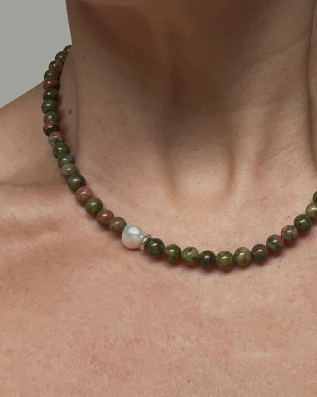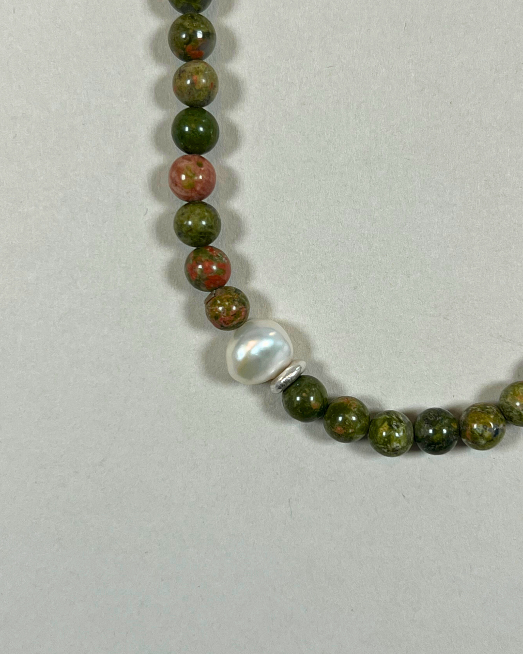 Unakite is known for its balancing and grounding qualities, offering emotional steadiness through its blend of soft green and warm pink tones. The freshwater pearl brings a gentle softness and sense of calm, while the silver accent adds a quiet point of light. Together, they create a piece that feels supportive, centred, and quietly harmonious.