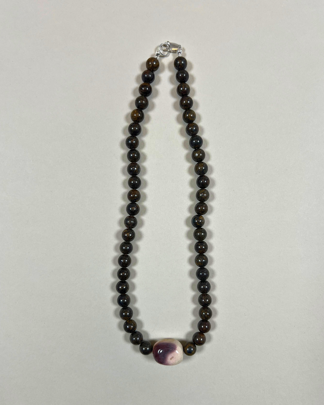 A one-of-a-kind necklace featuring large 8 mm bronzite beads with a central pale pink and cream mookaite jasper, marked with swirling accents of deep purple and ochre yellow. All findings and clasp are sterling silver.