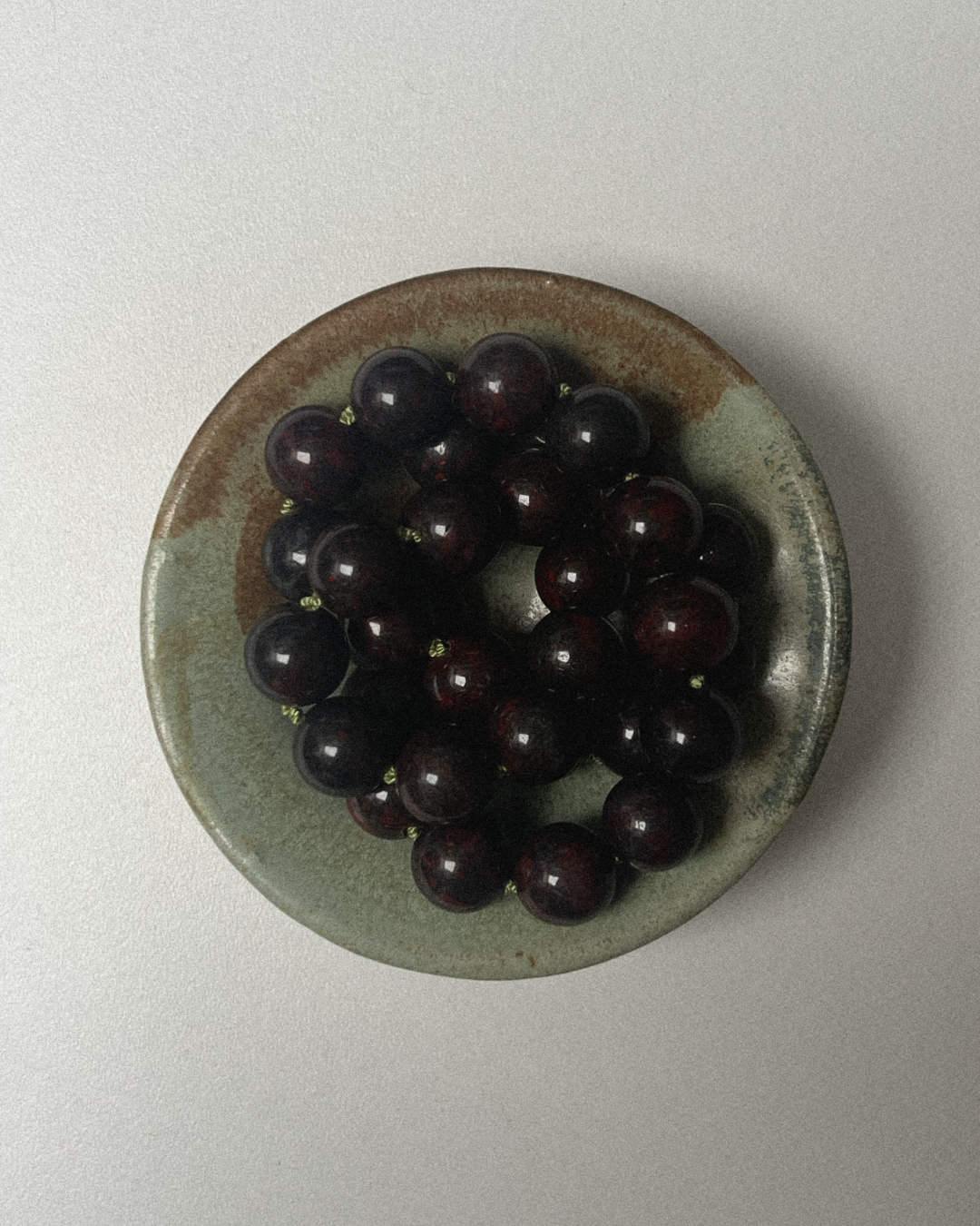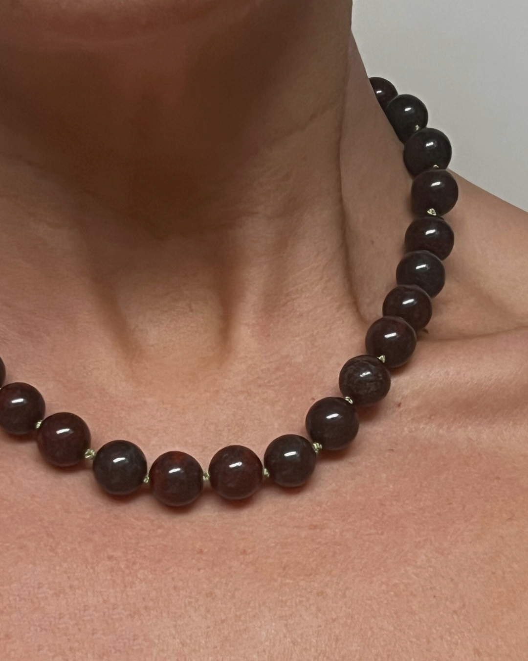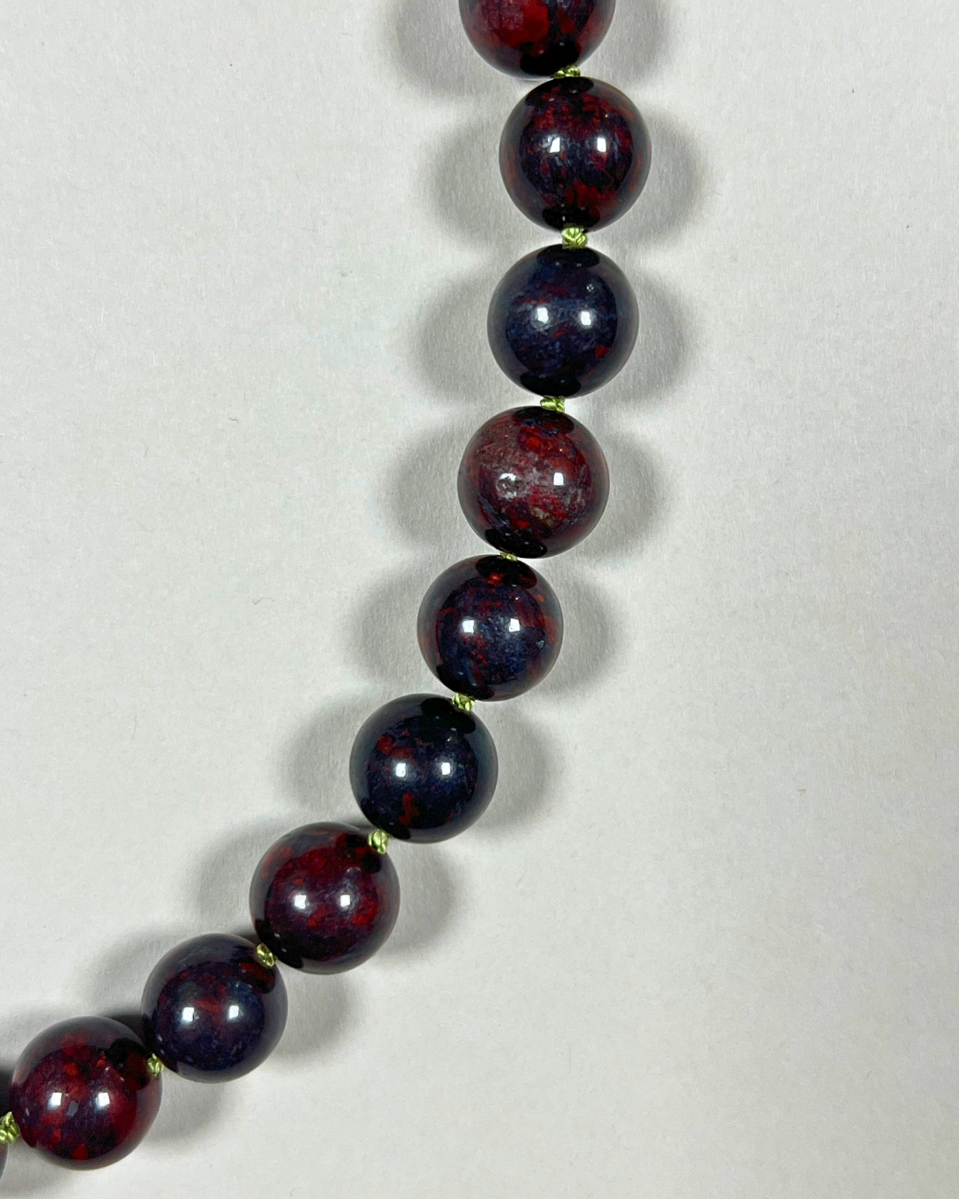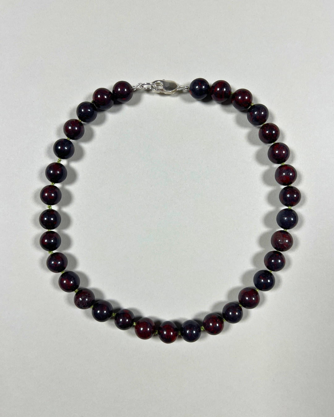 A one-of-a-kind heirloom necklace featuring 12mm deep red and plum bloodstone beads, hand-knotted on olive silk thread. All findings and clasp are sterling silver.