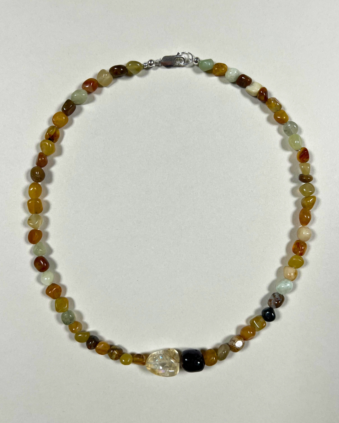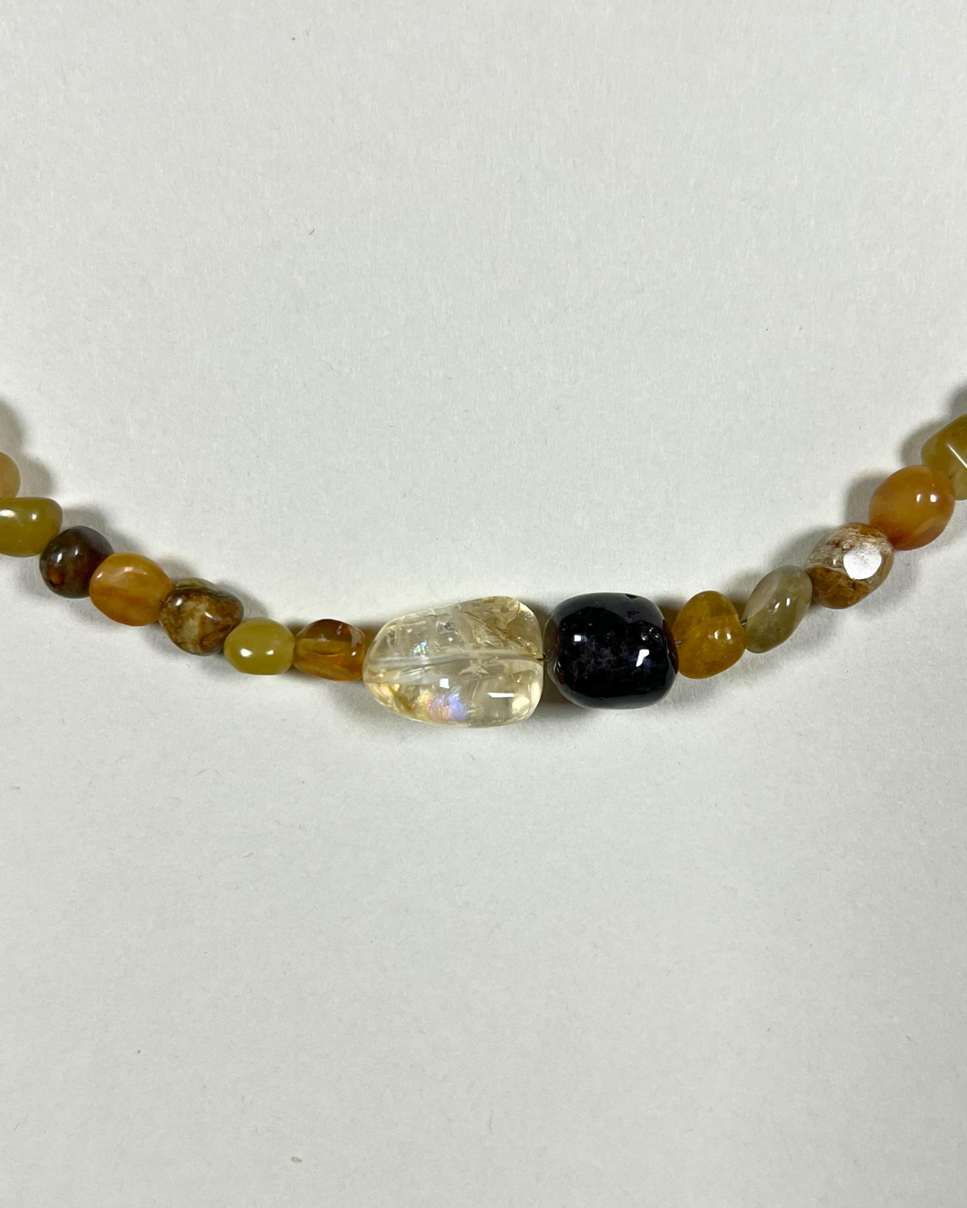 A one-of-a-kind necklace featuring irregular jade nugget beads in tones of orange, yellow, tan, and teal, centred with a citrine nugget and a smooth deep plum garnet. All findings and clasp are sterling silver.