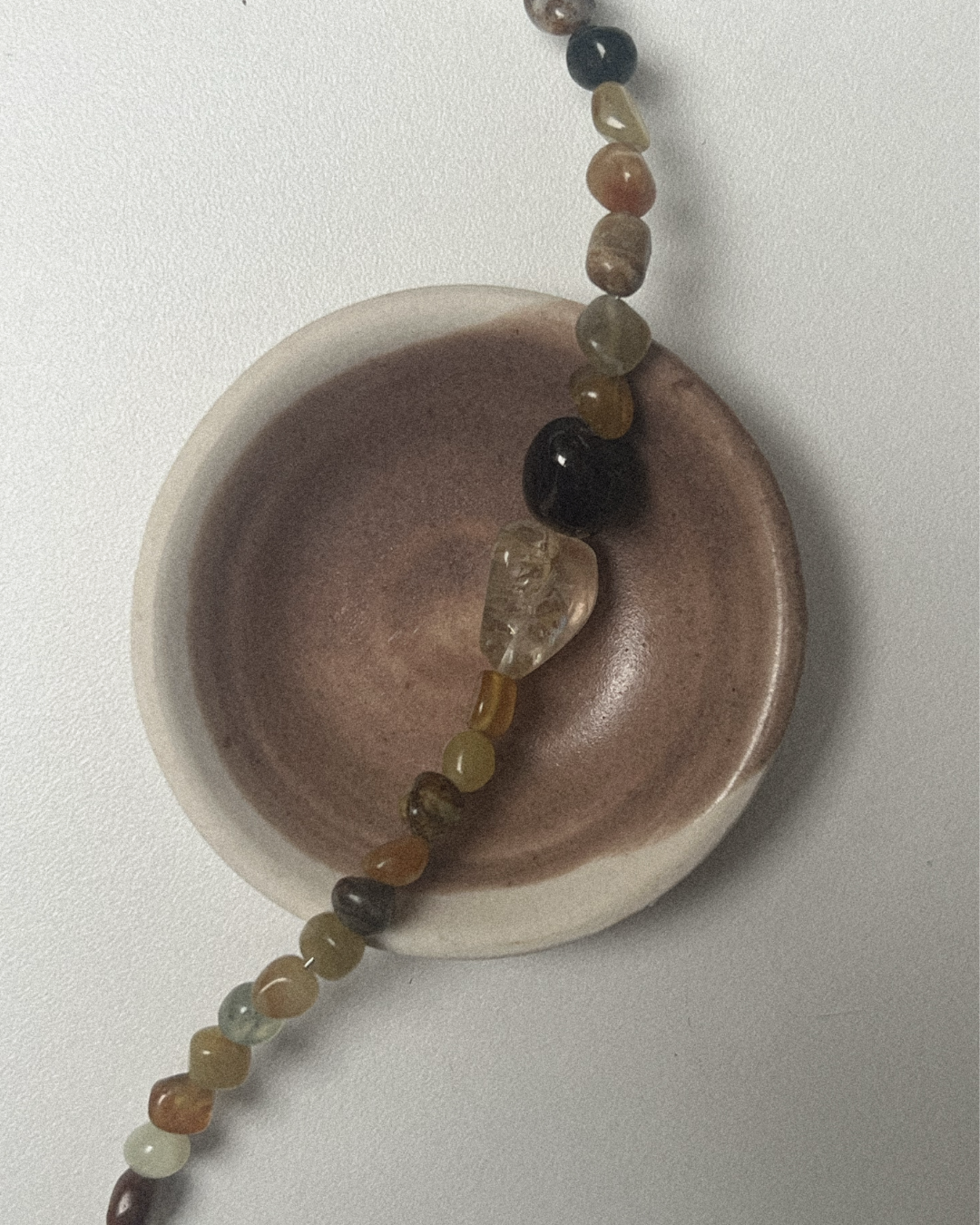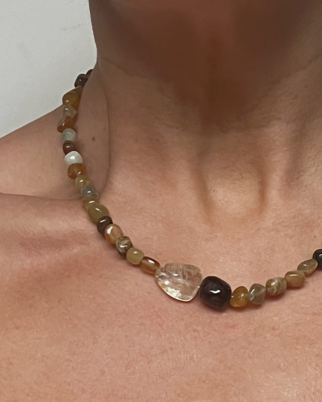 Jade is linked with harmony and balance, its natural tones evoking the grounding calm of the earth. Citrine brings light and optimism, while garnet adds depth, protection, and quiet strength. Together, they form a piece that feels warm, balanced, and gently radiant.