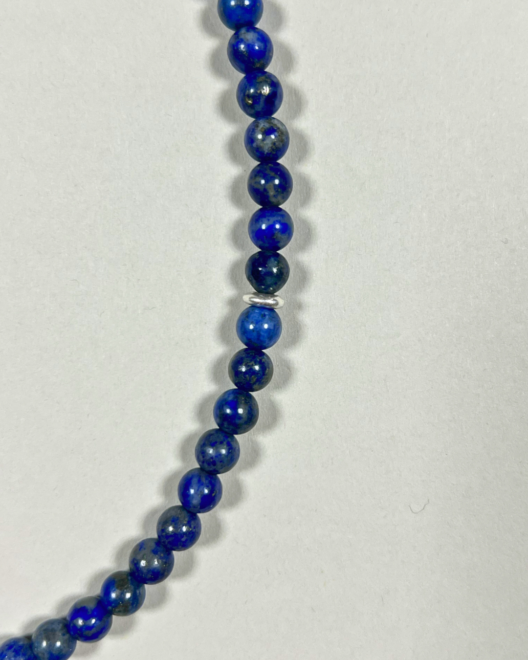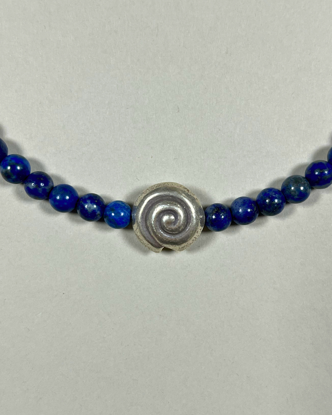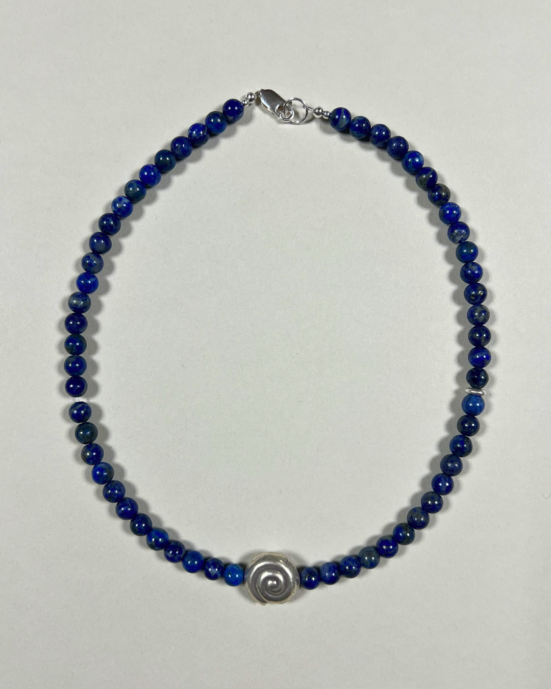 A one-of-a-kind necklace featuring 6mm lapis lazuli beads with a large central fine silver spiral and an accent fine silver stud bead. All findings and clasp are sterling silver.