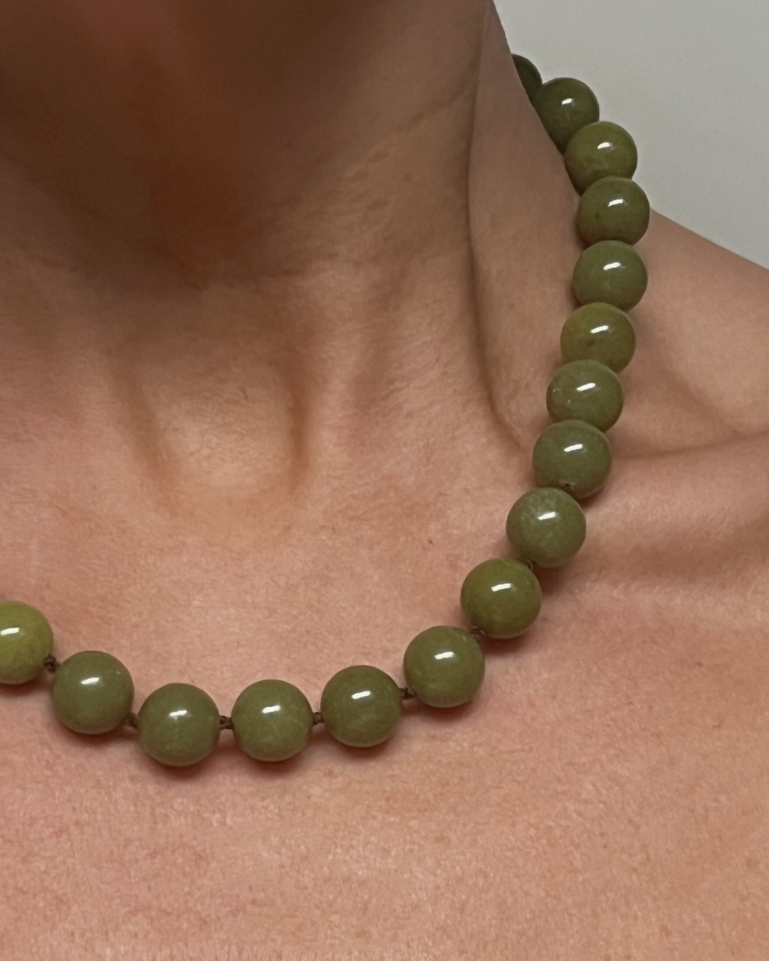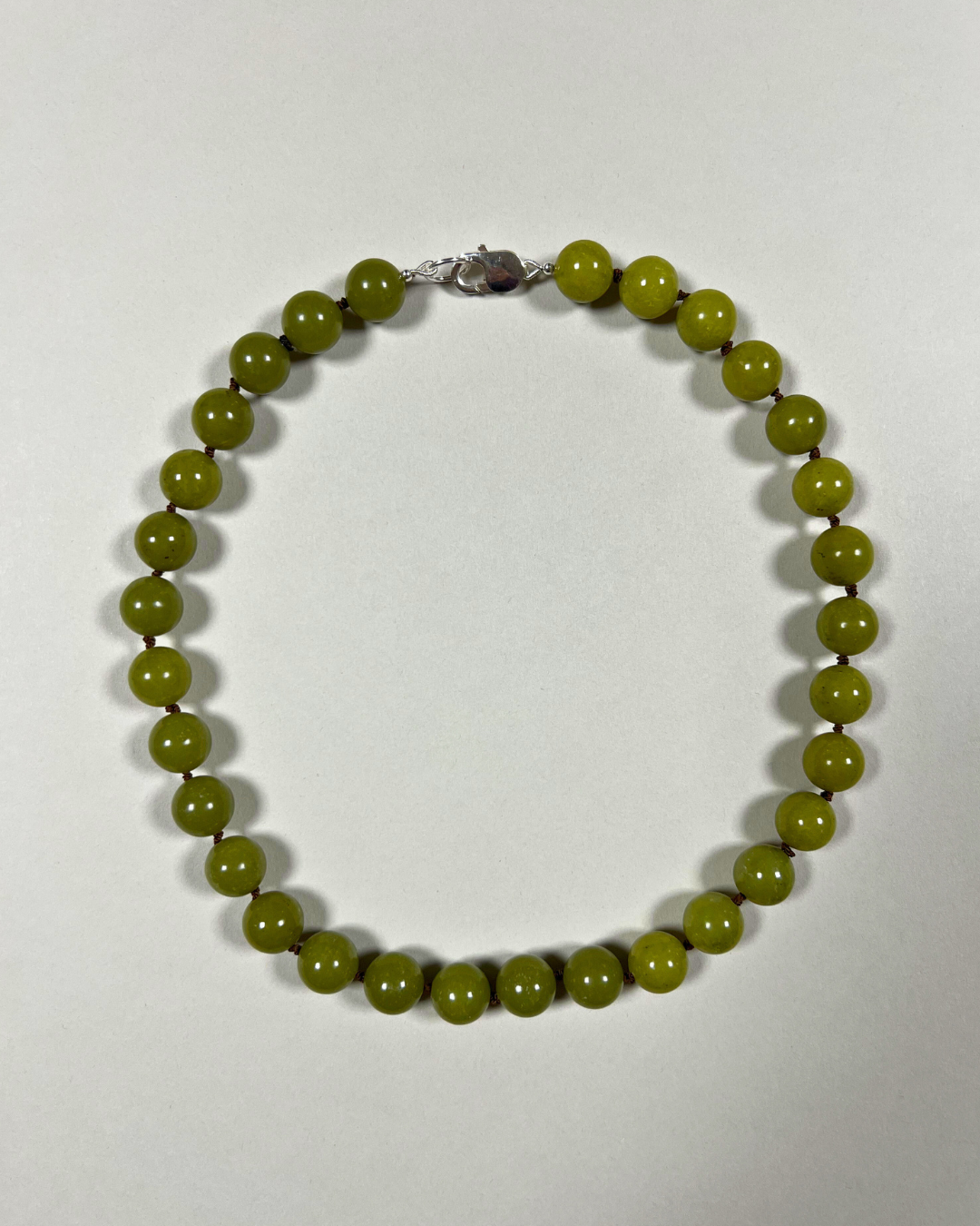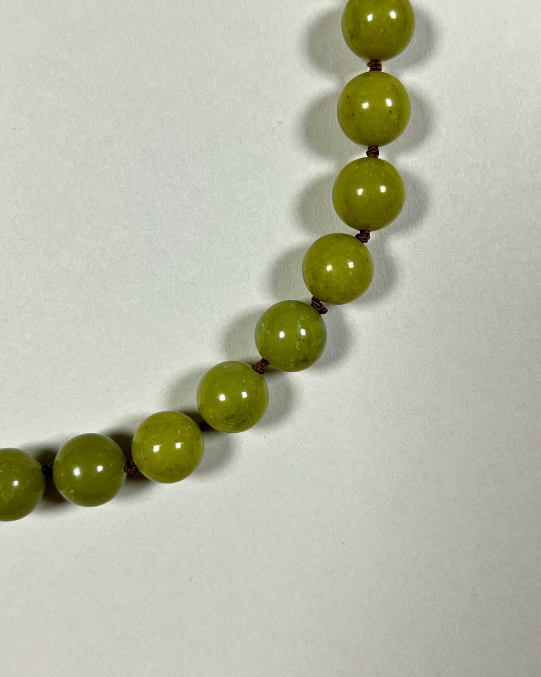 A one-of-a-kind heirloom necklace featuring 12mm olive jade beads, hand-knotted on chestnut brown silk. All findings and clasp are sterling silver.