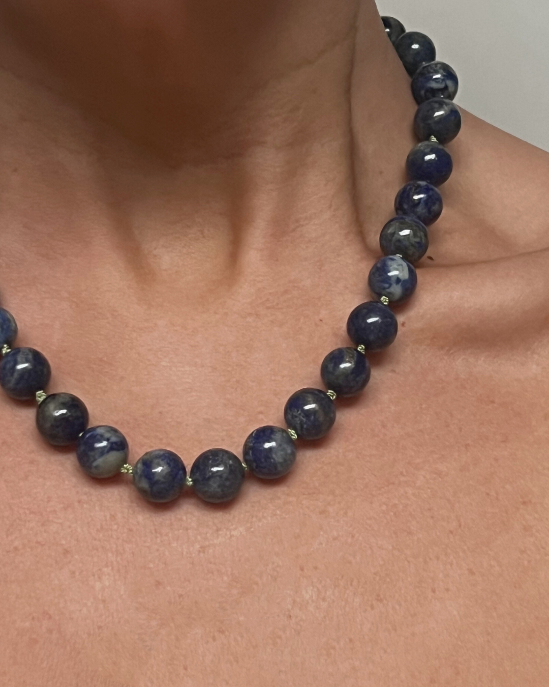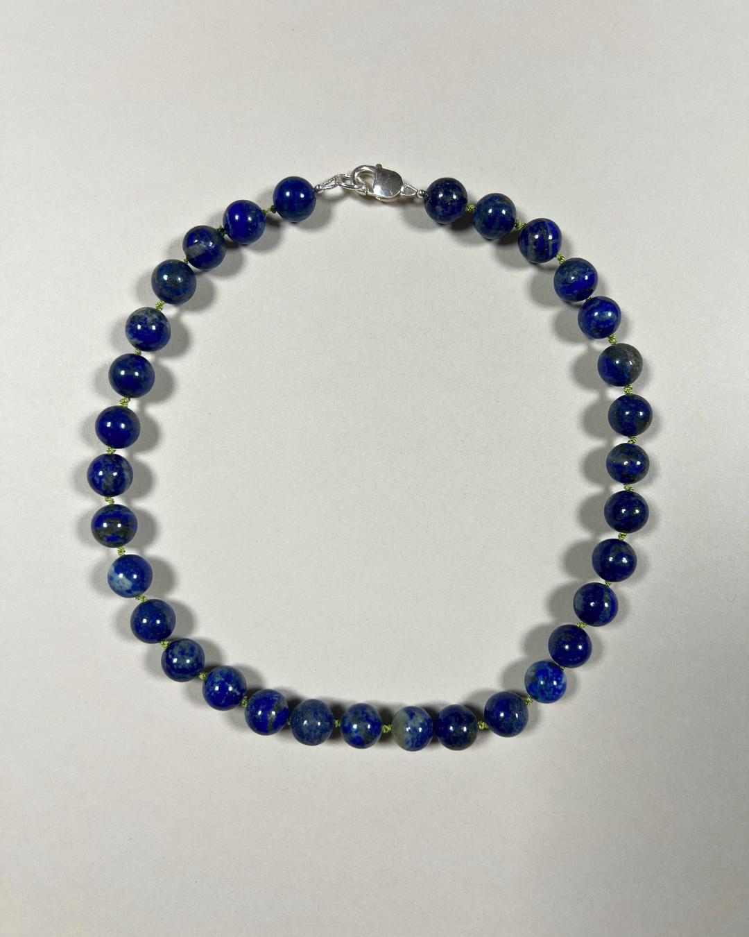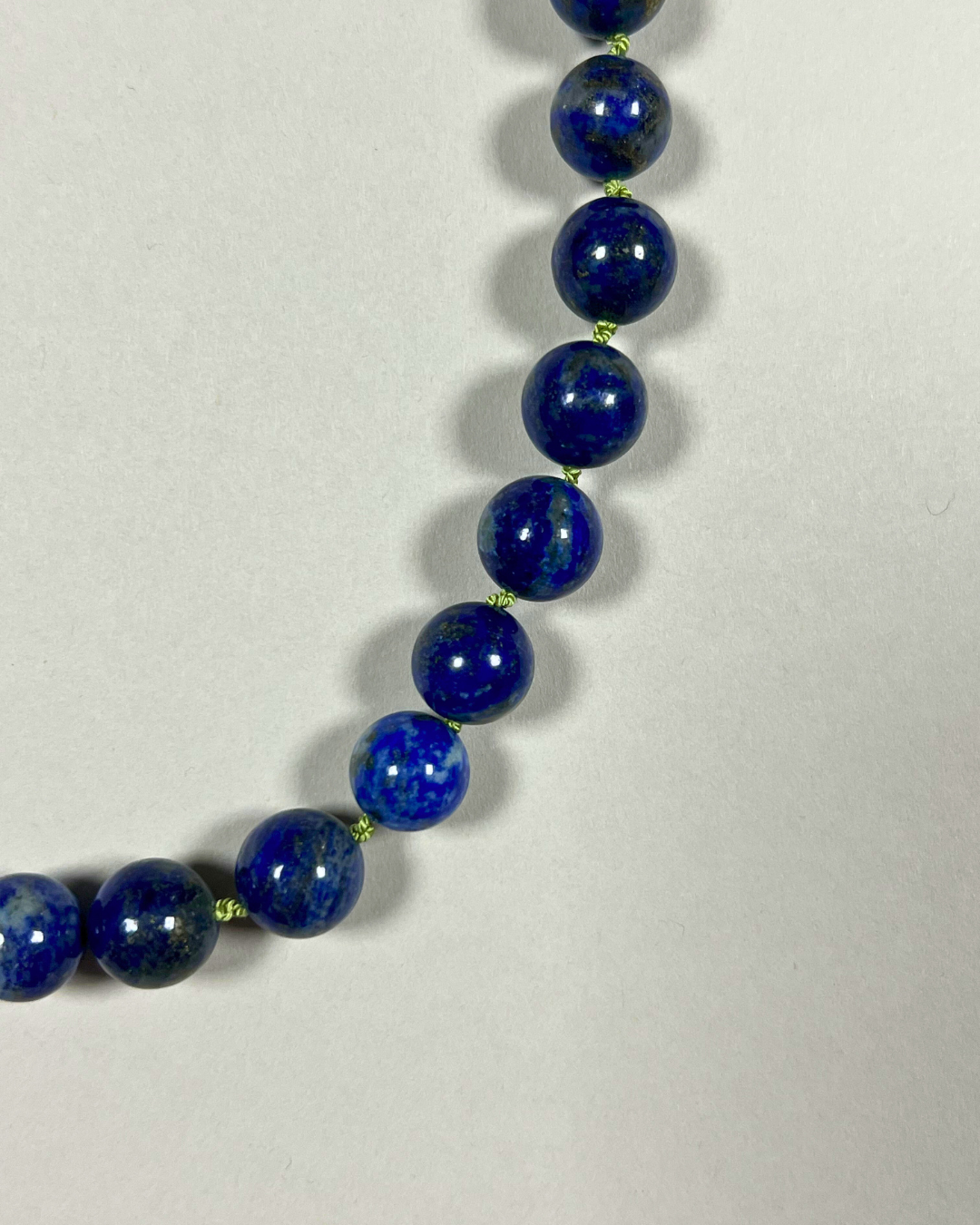 A one-of-a-kind heirloom necklace featuring 12mm lapis lazuli beads, hand-knotted on olive green silk. All findings and clasp are sterling silver.