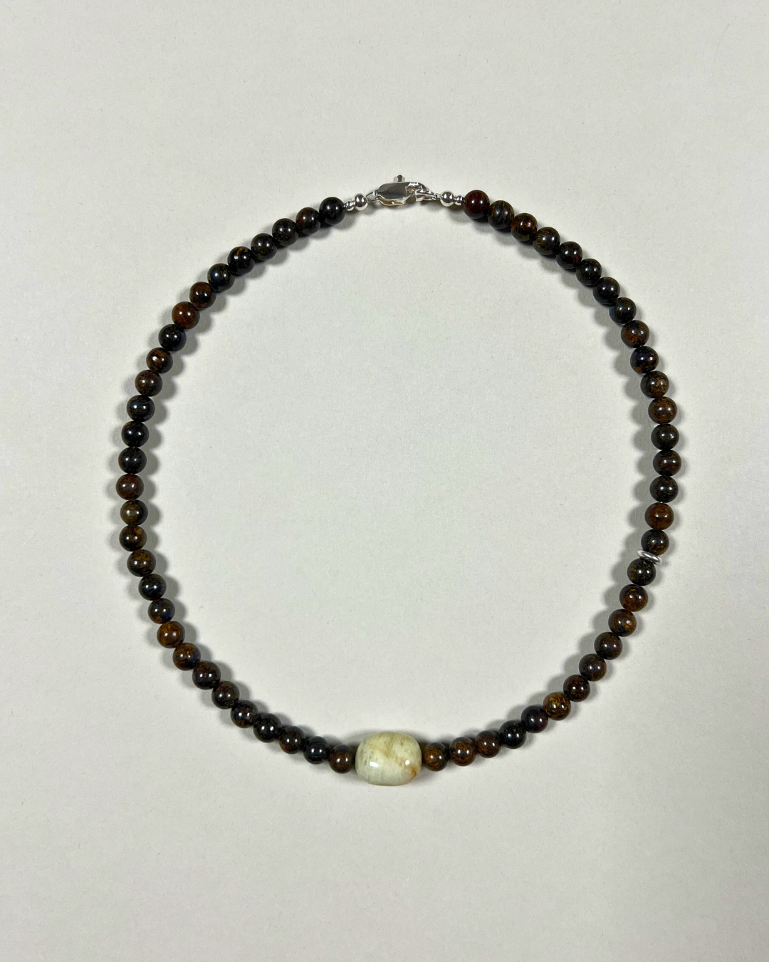 A one-of-a-kind necklace featuring 6mm bronzite beads with a central yellow-green beryl and an accent fine silver stud bead. All findings and clasp are sterling silver.