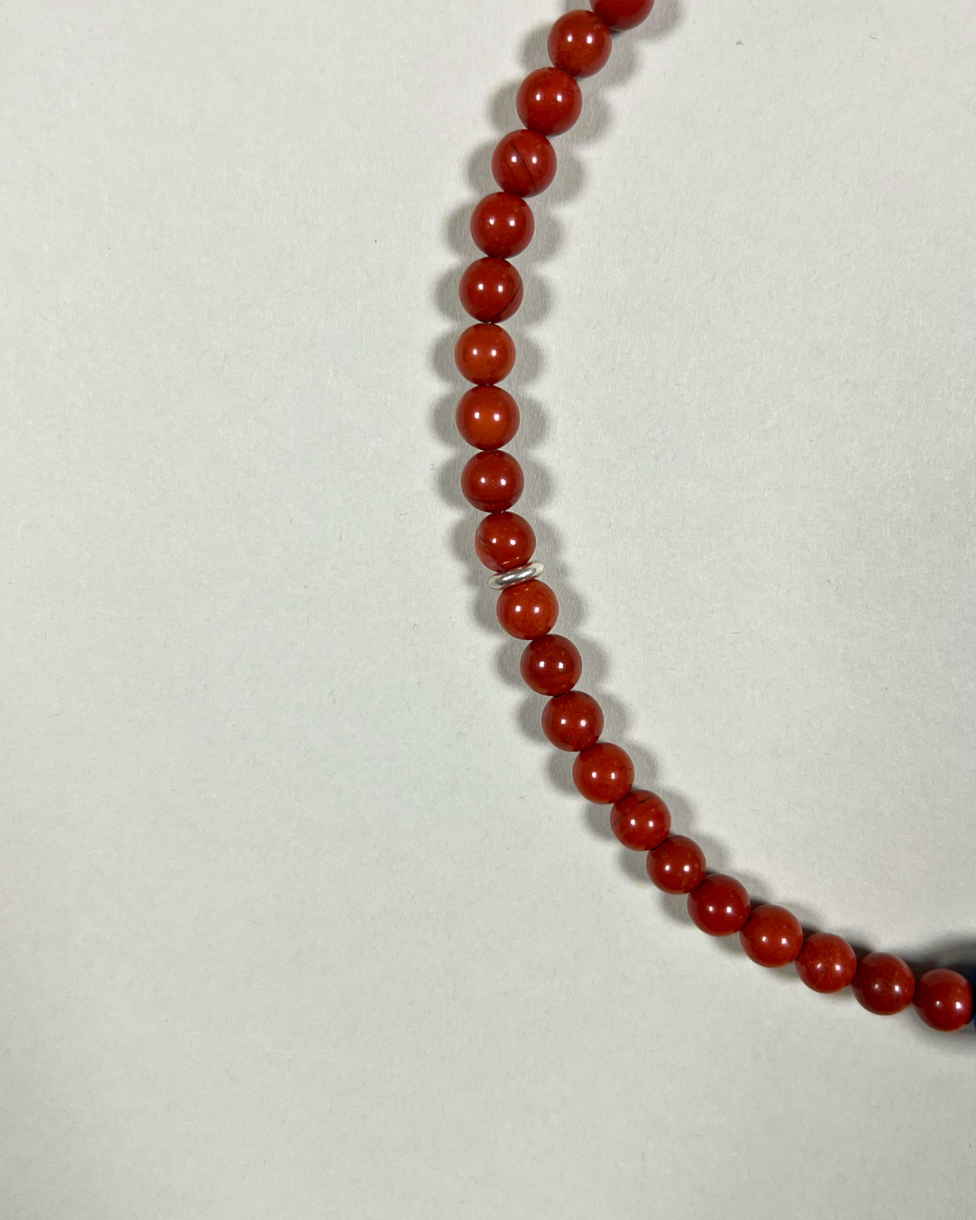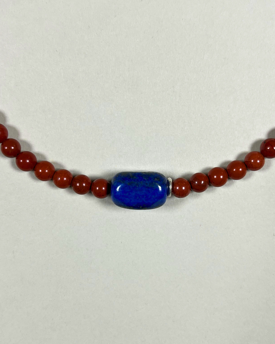 A one-of-a-kind necklace featuring 6mm red jasper beads, hand-strung and finished with sterling silver findings and clasp. At its centre sits a smooth lapis lazuli bead, framed by two fine silver stud beads - a striking combination of earthy red and deep blue tones.