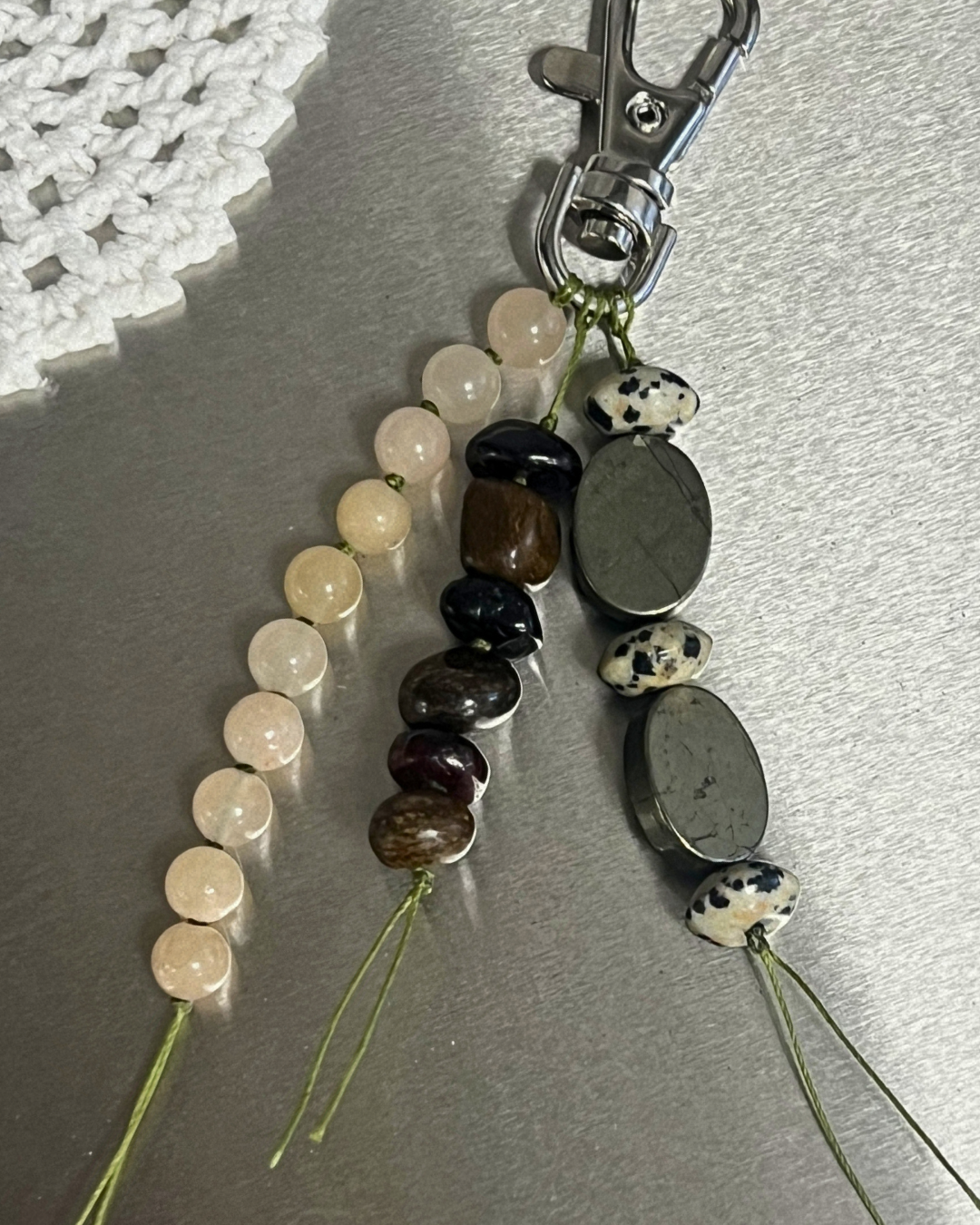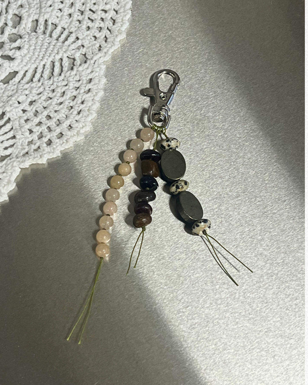 A one of a kind hand-knotted carry charm featuring peach beryl, garnet, bronzite, pyrite and dalmatian jasper stones. Finished with a stainless steel swivel clasp for attaching to keys, bags or everyday objects.